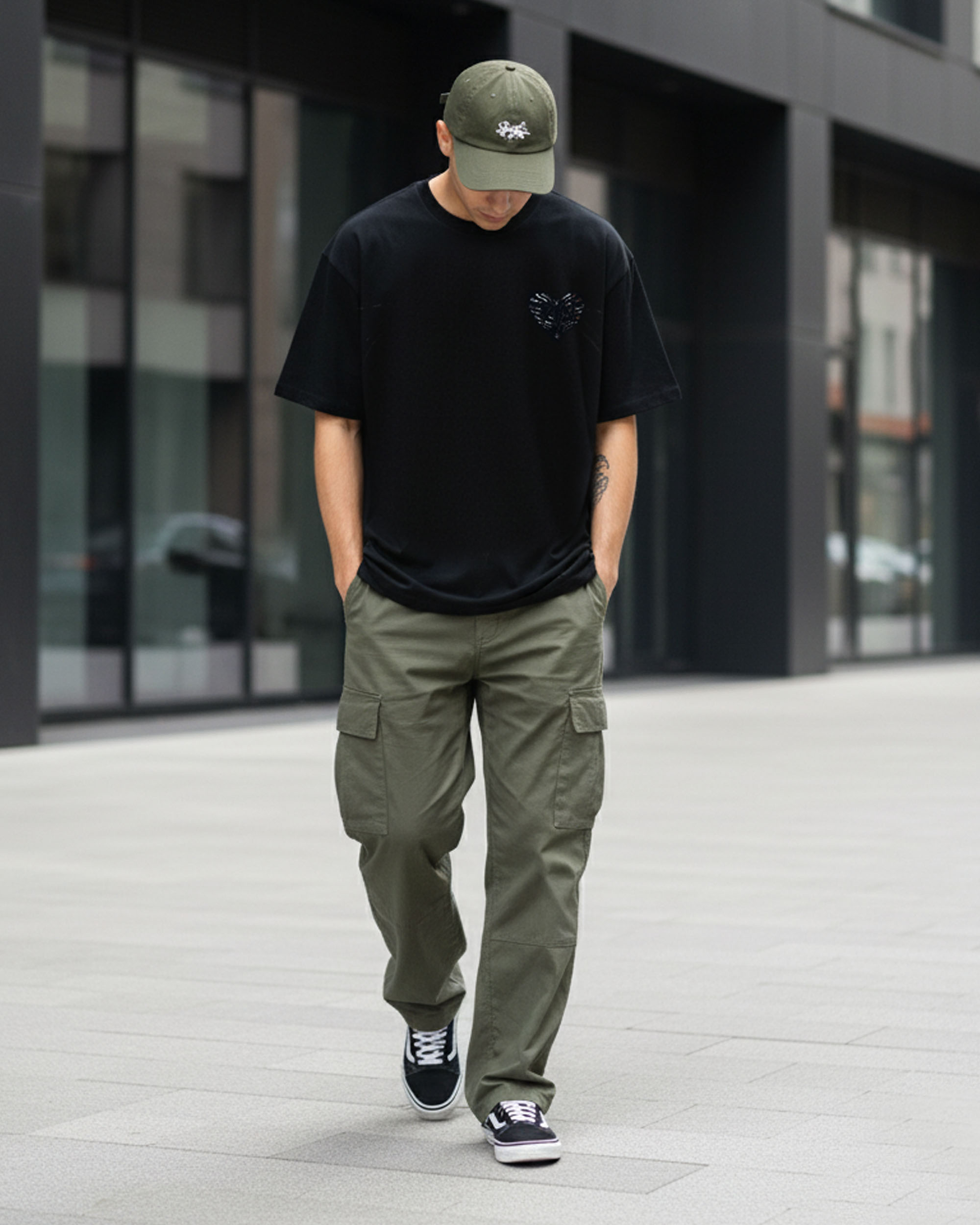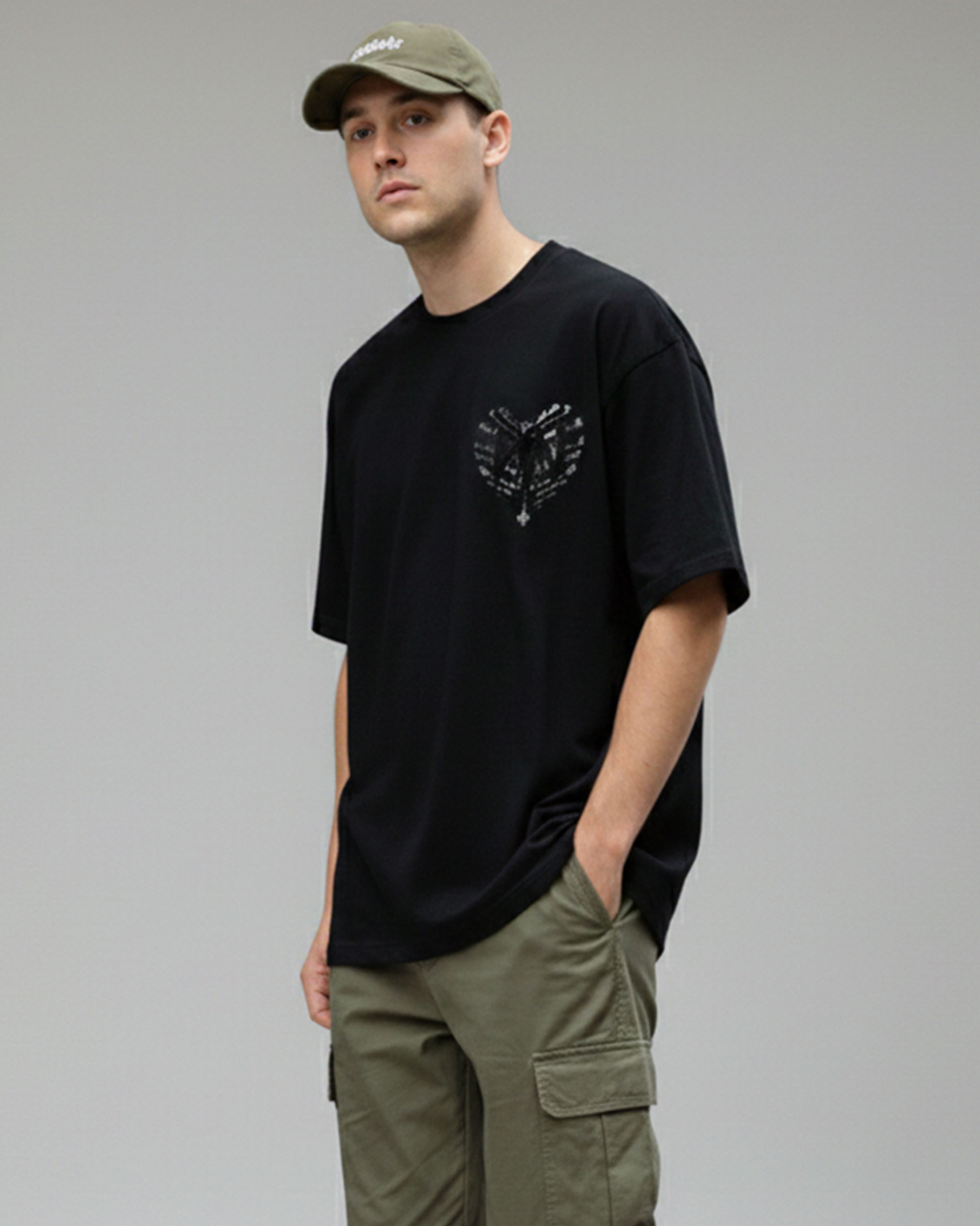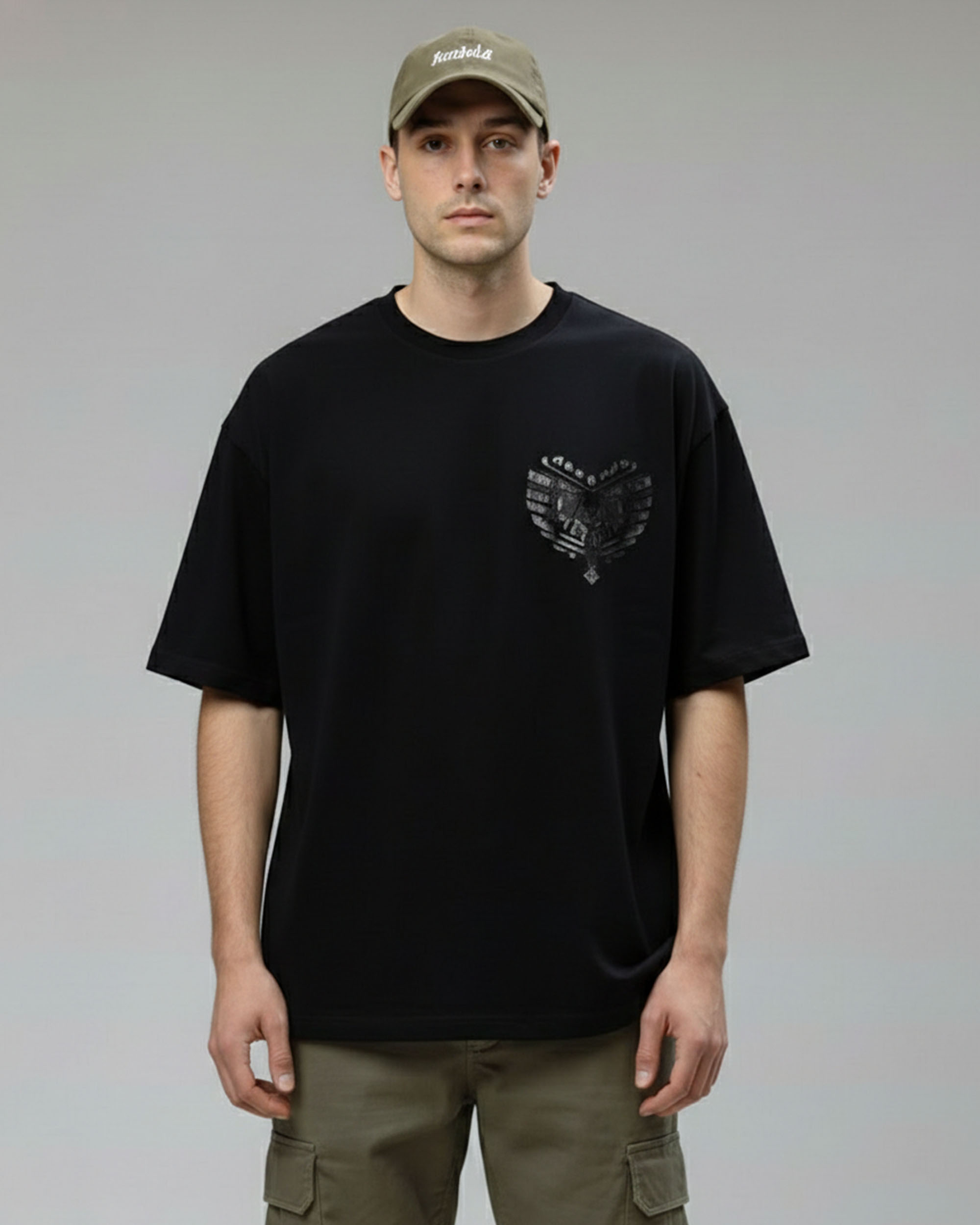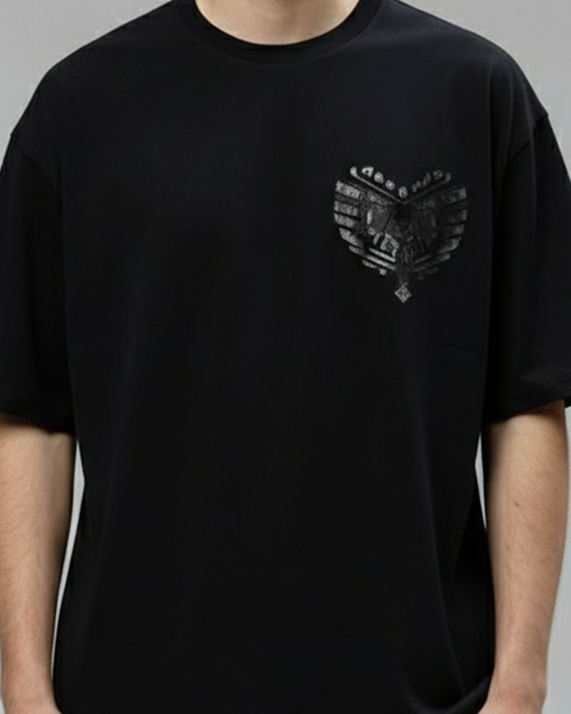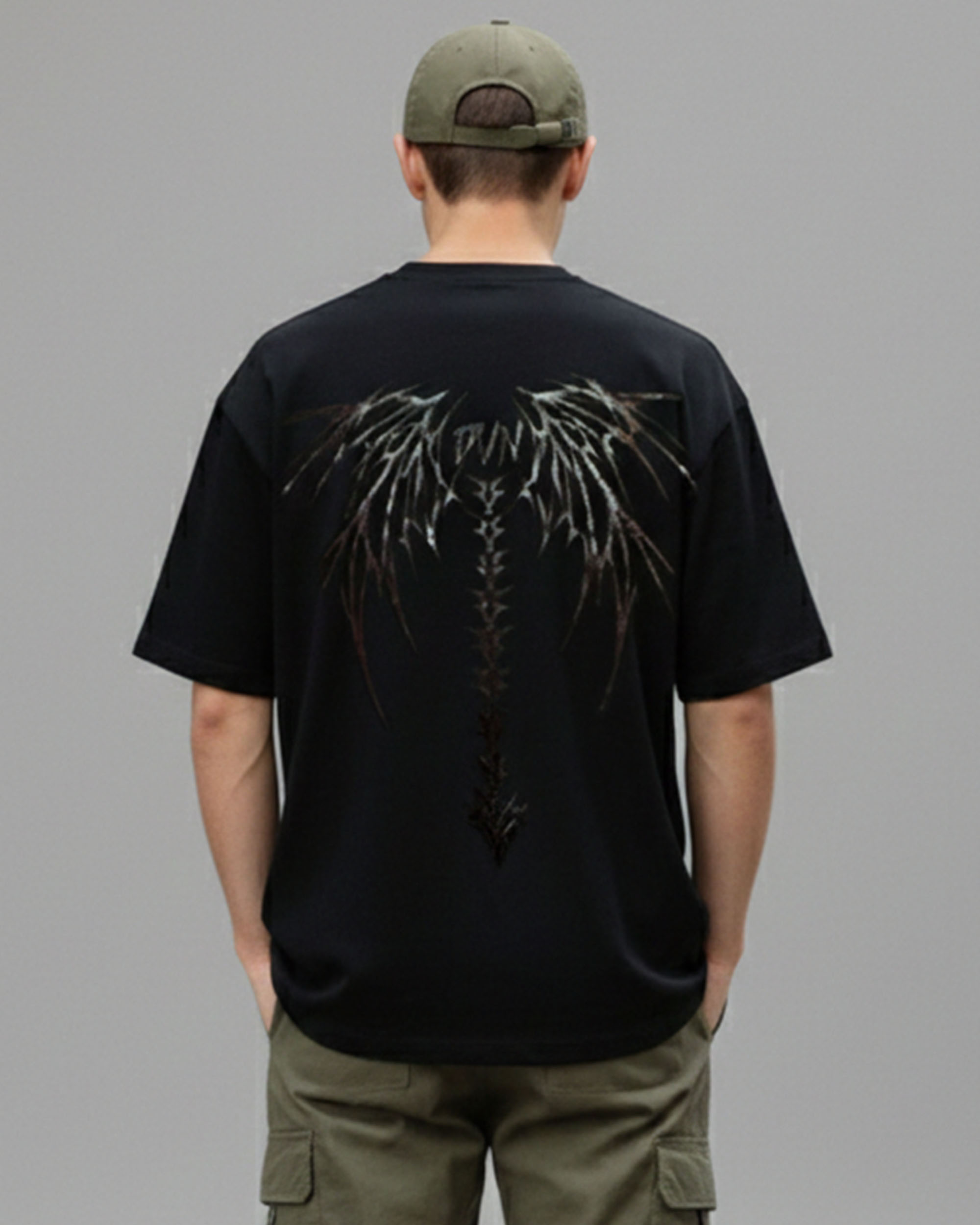 Crafted from cotton-rich 260 GSM heavyweight fabric, this tee delivers a structured oversized fit with a luxury drape. The gel print adds a slightly raised, glossy texture that enhances the dark wing artwork, creating a sharp, edgy, high-fashion aesthetic.