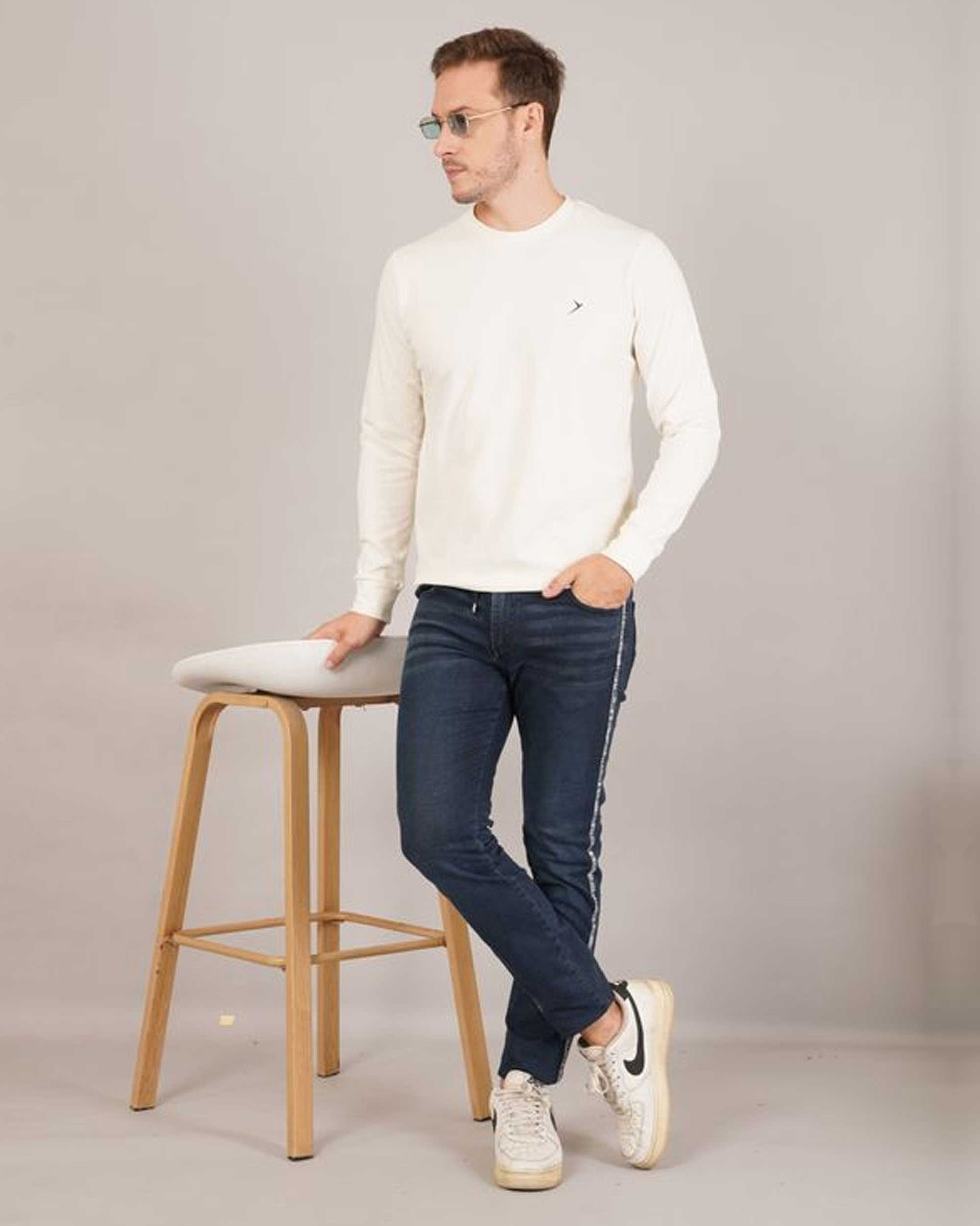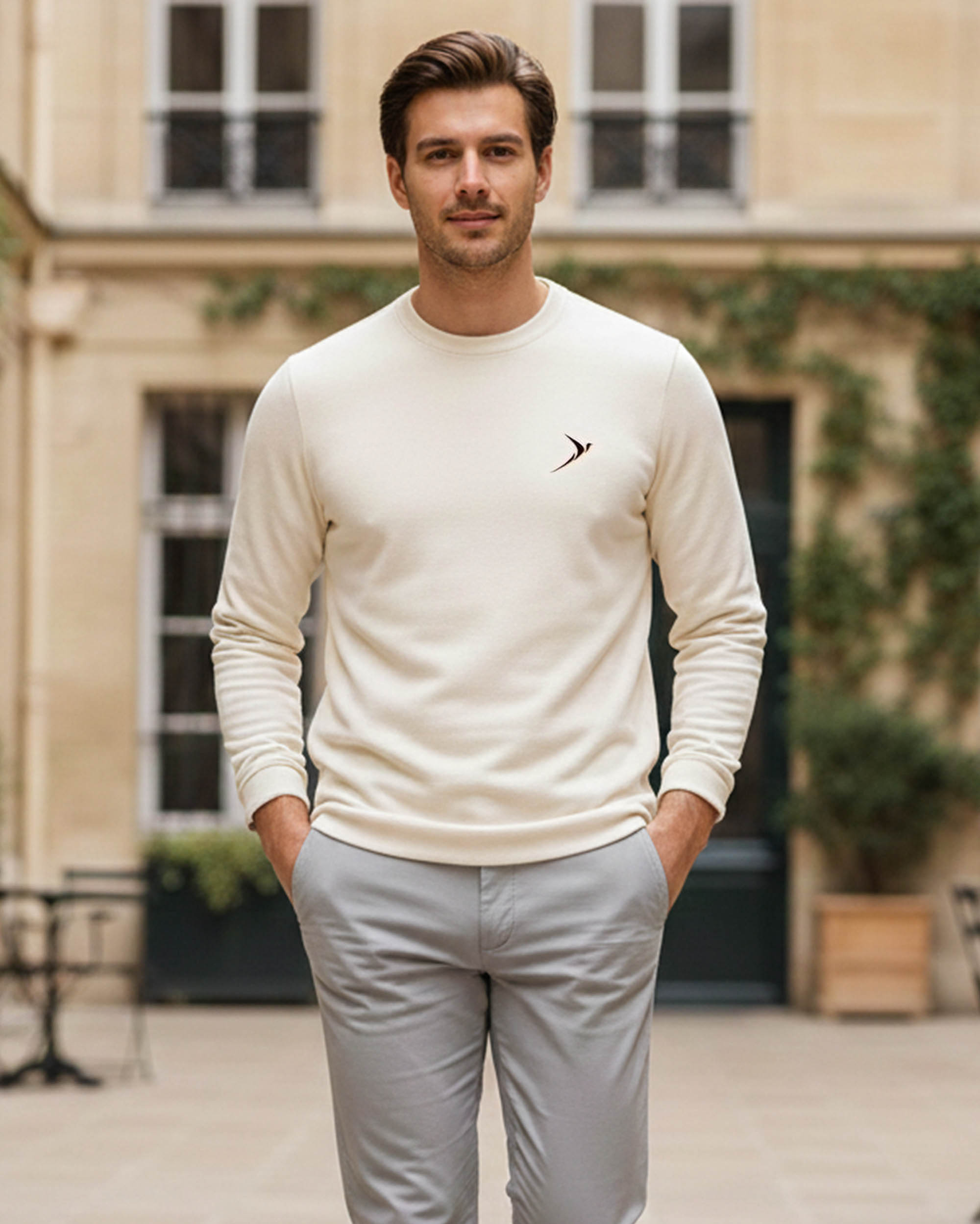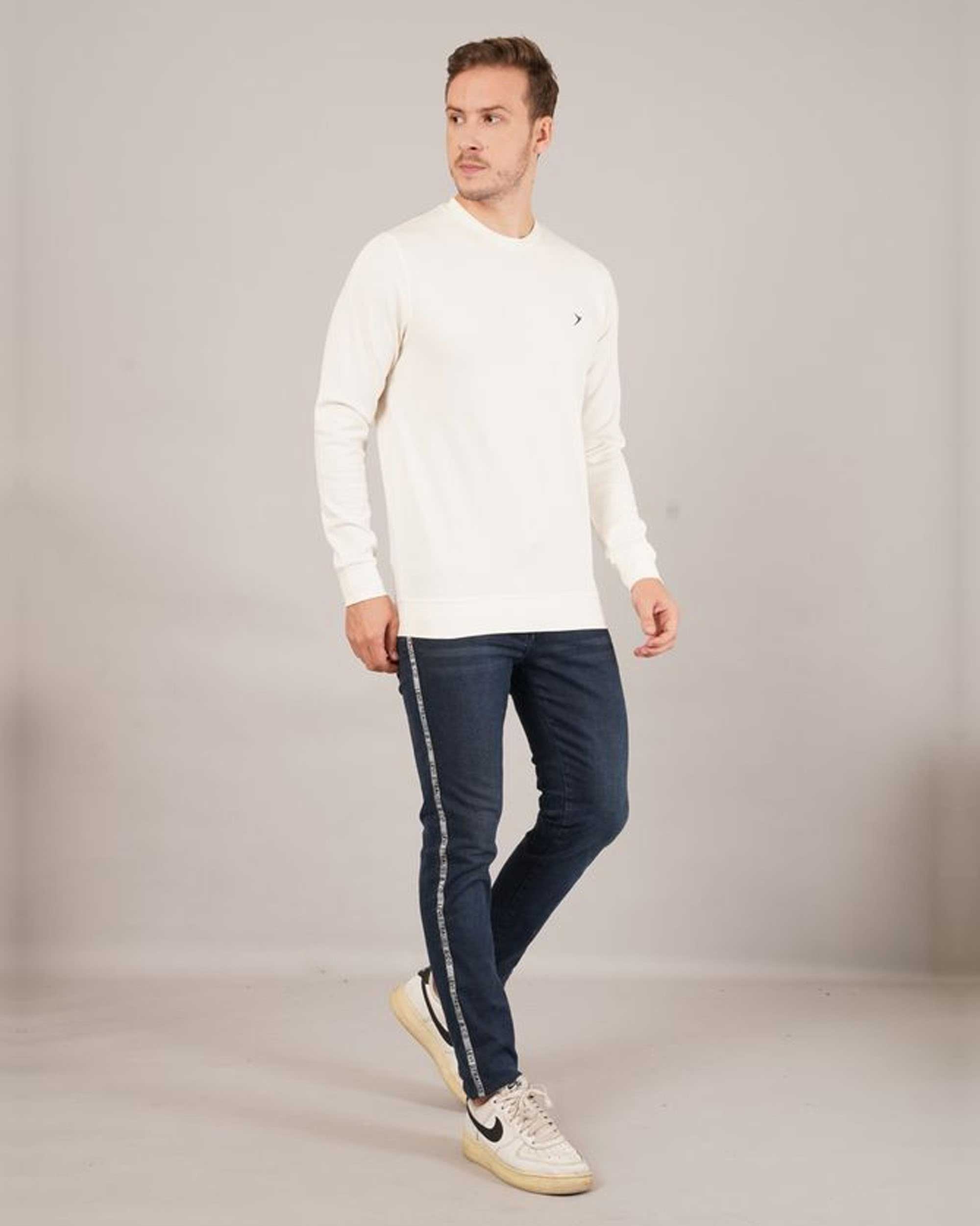 Stay cozy and stylish with this off-white solid sweatshirt. Made from a soft cotton-blend fabric, it features a round neck, full sleeves, and ribbed hems for a snug fit. The minimal chest logo design adds a touch of sophistication, making it ideal for casual outings or relaxed weekends.