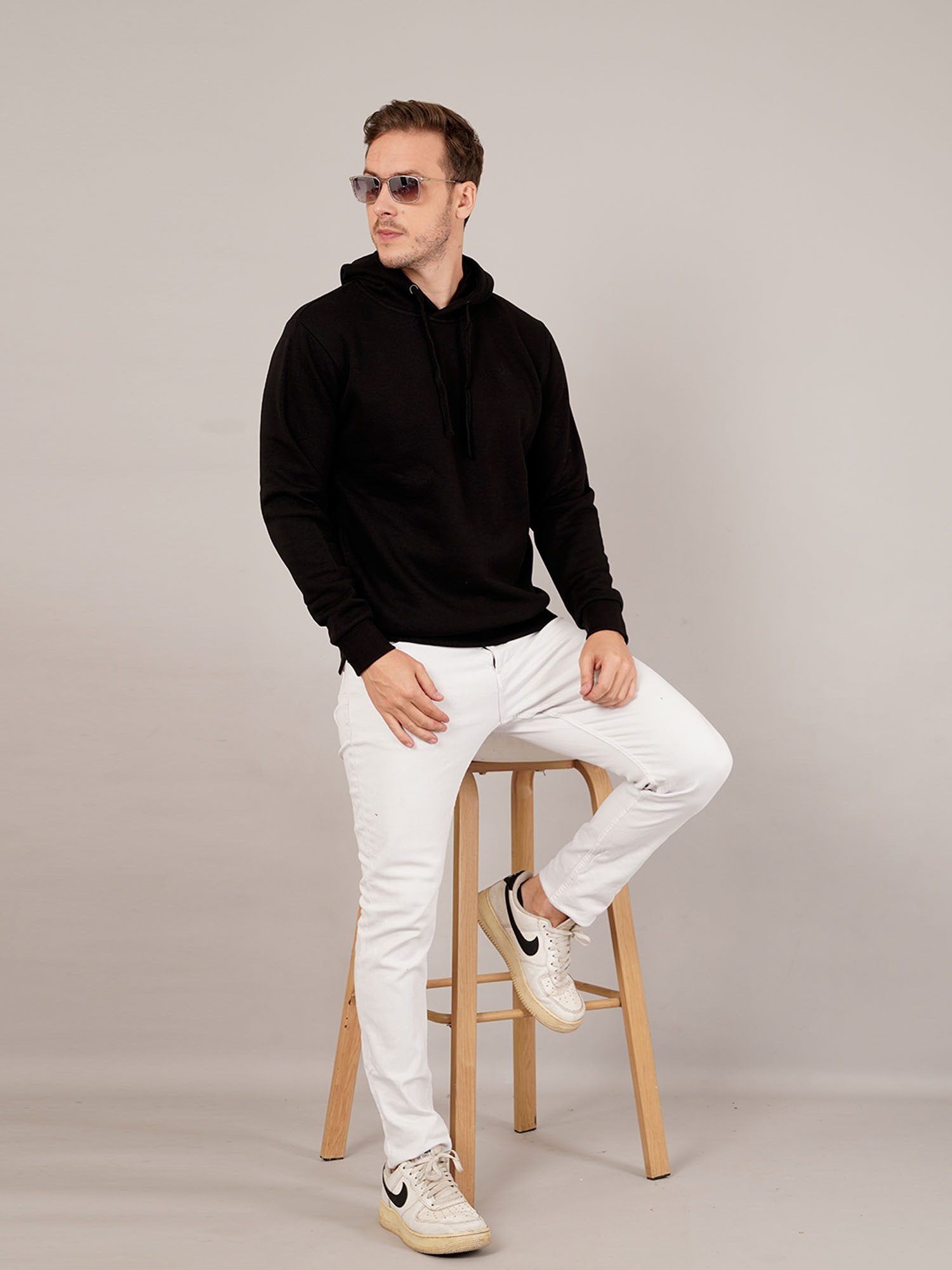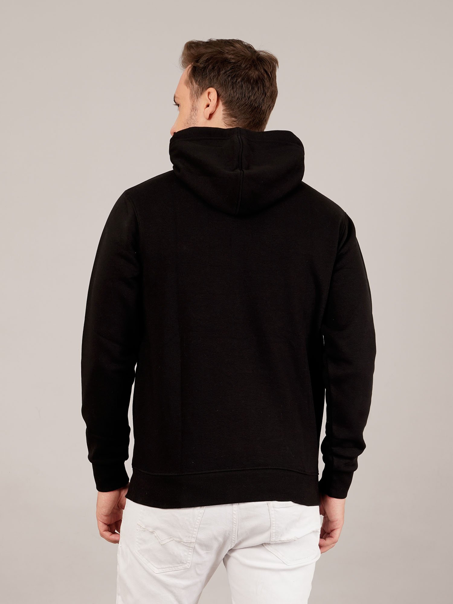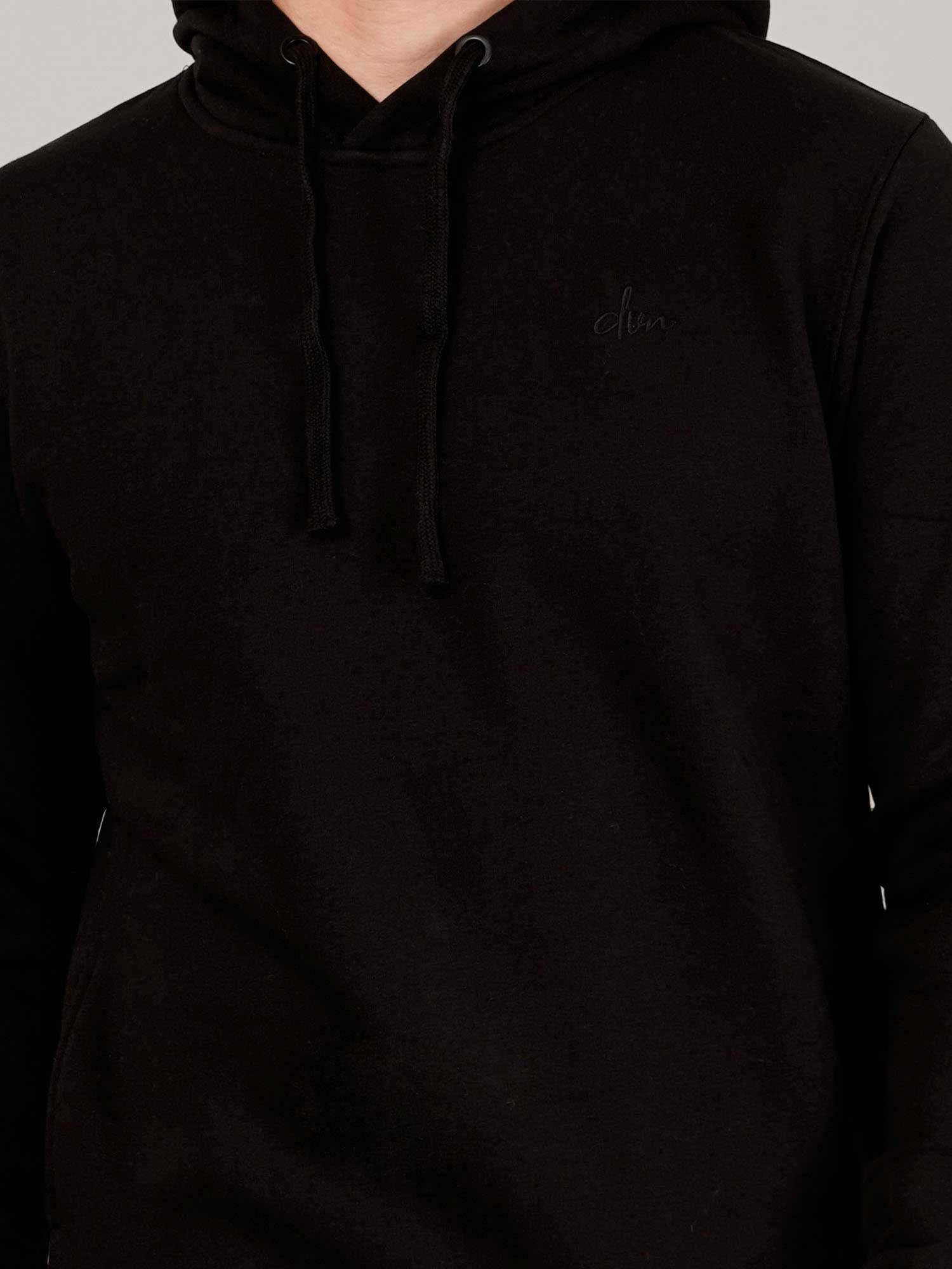 Stay effortlessly stylish with this black solid hoodie for men. Made with premium cotton blend fabric, it offers warmth and comfort for daily wear. Featuring an adjustable drawstring hood and kangaroo pocket, it is perfect for layering during winter or pairing with jeans for a casual streetwear look.