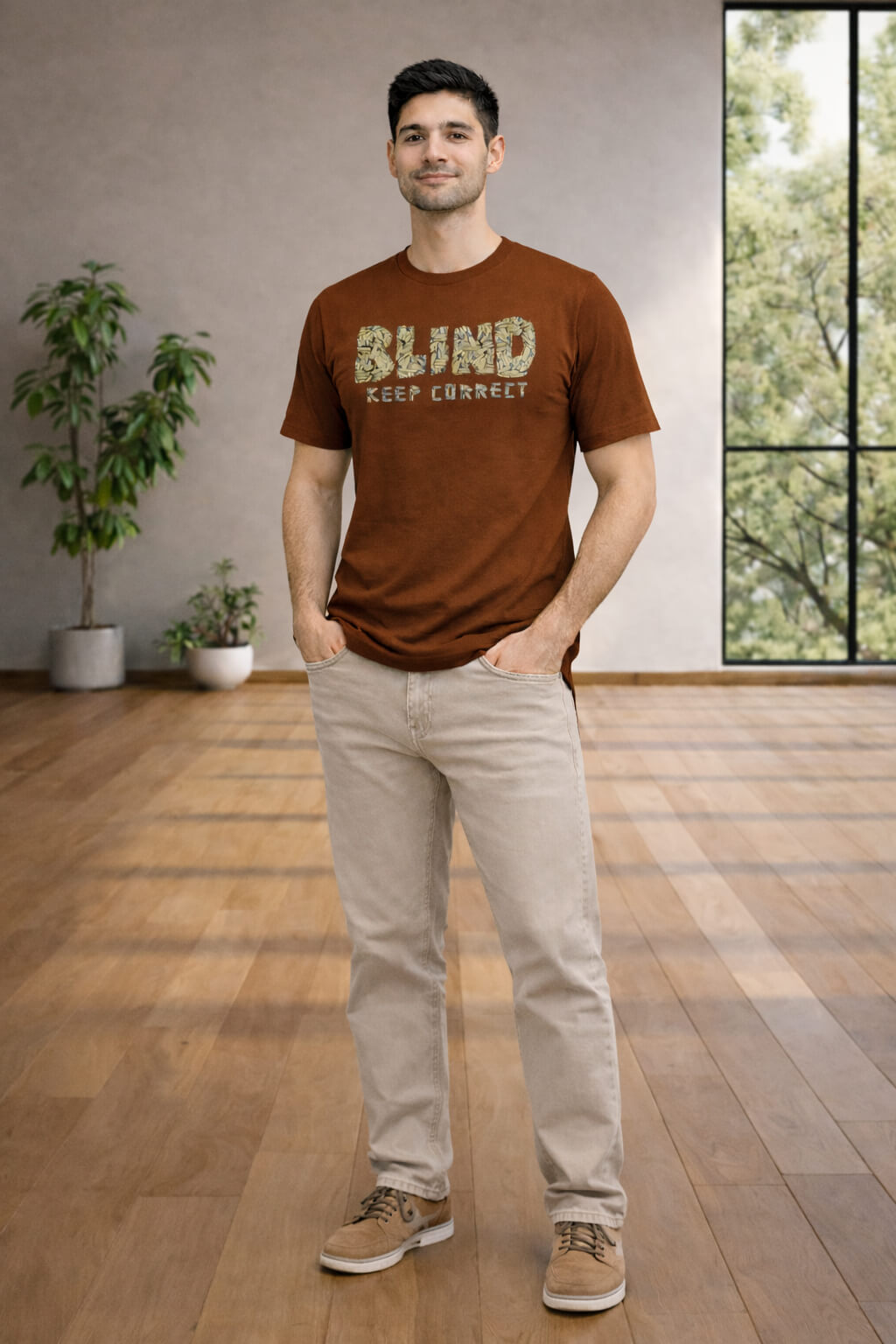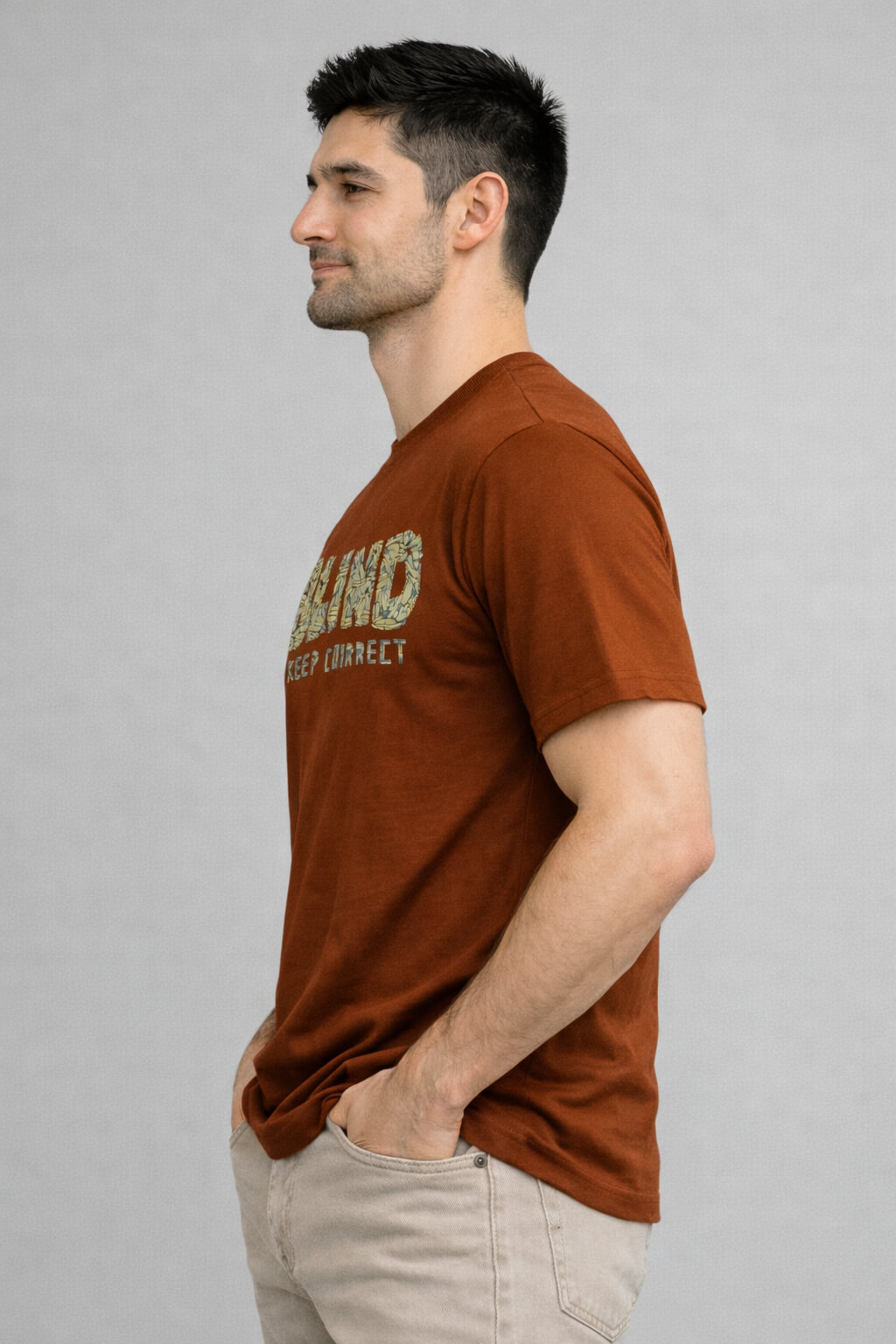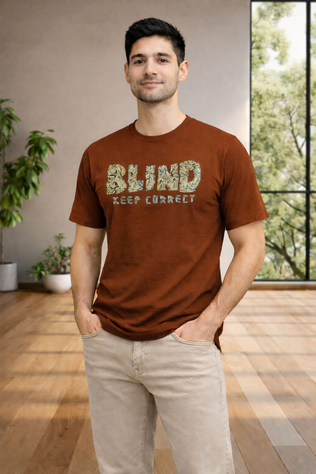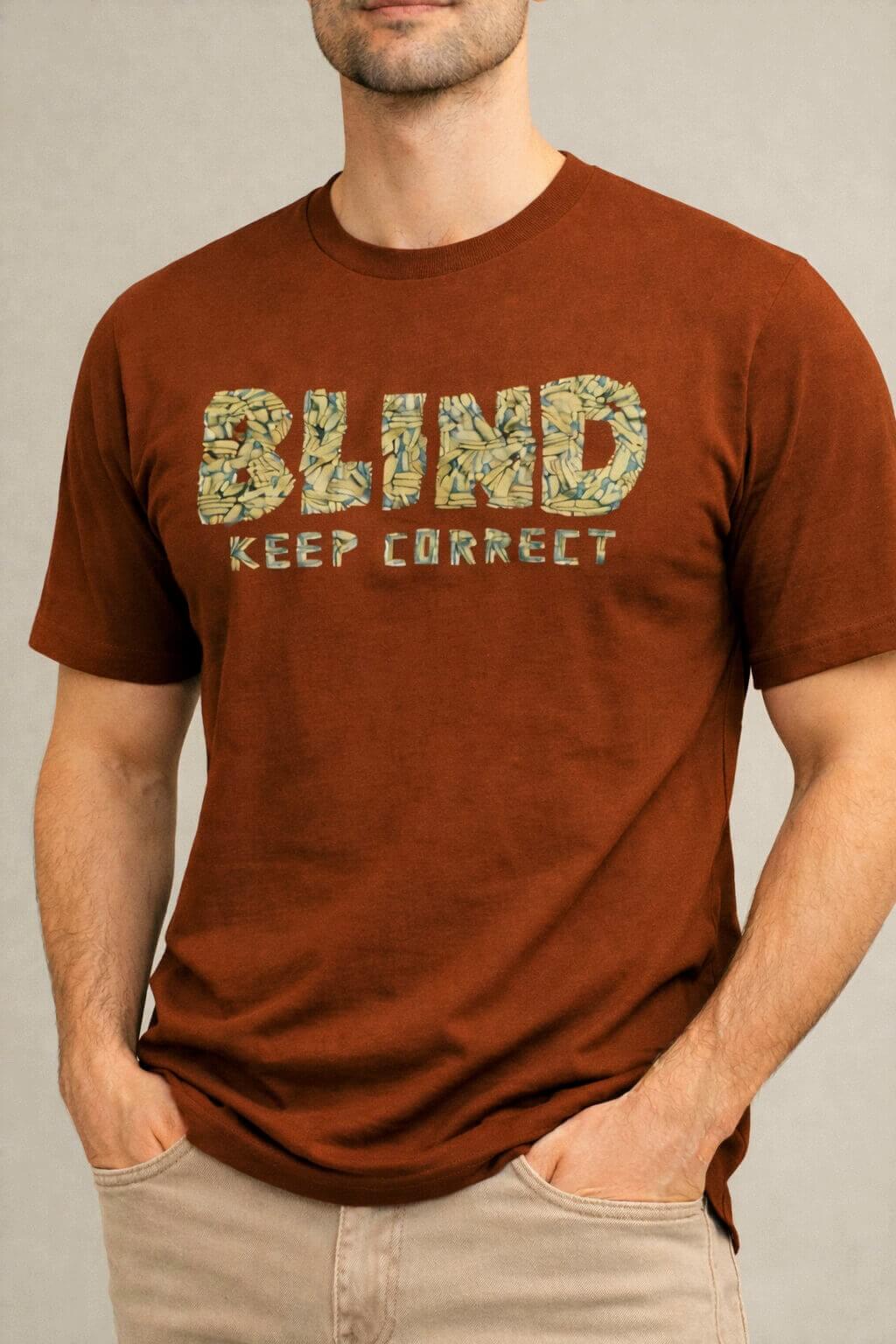 This Blind Keep Correct T-shirt is a must-have for anyone who loves bold, street-inspired fashion. Made from high-quality cotton fabric, this T-shirt offers a perfect balance of comfort and style. The eye-catching print on the front features the word "BLIND" with a camo-like pattern within the letters and the phrase "KEEP CORRECT" underneath it. This unique design adds a touch of personality and attitude to your casual wardrobe.