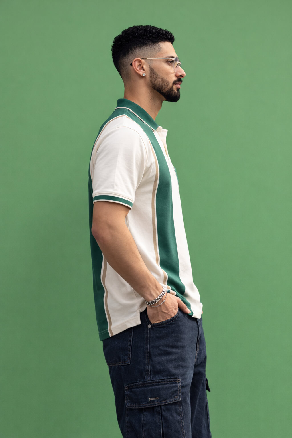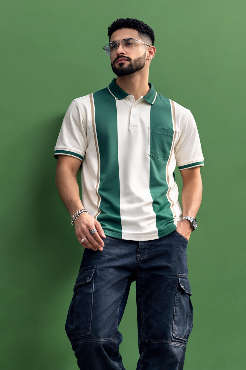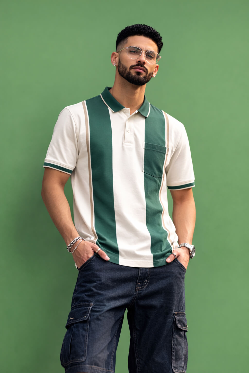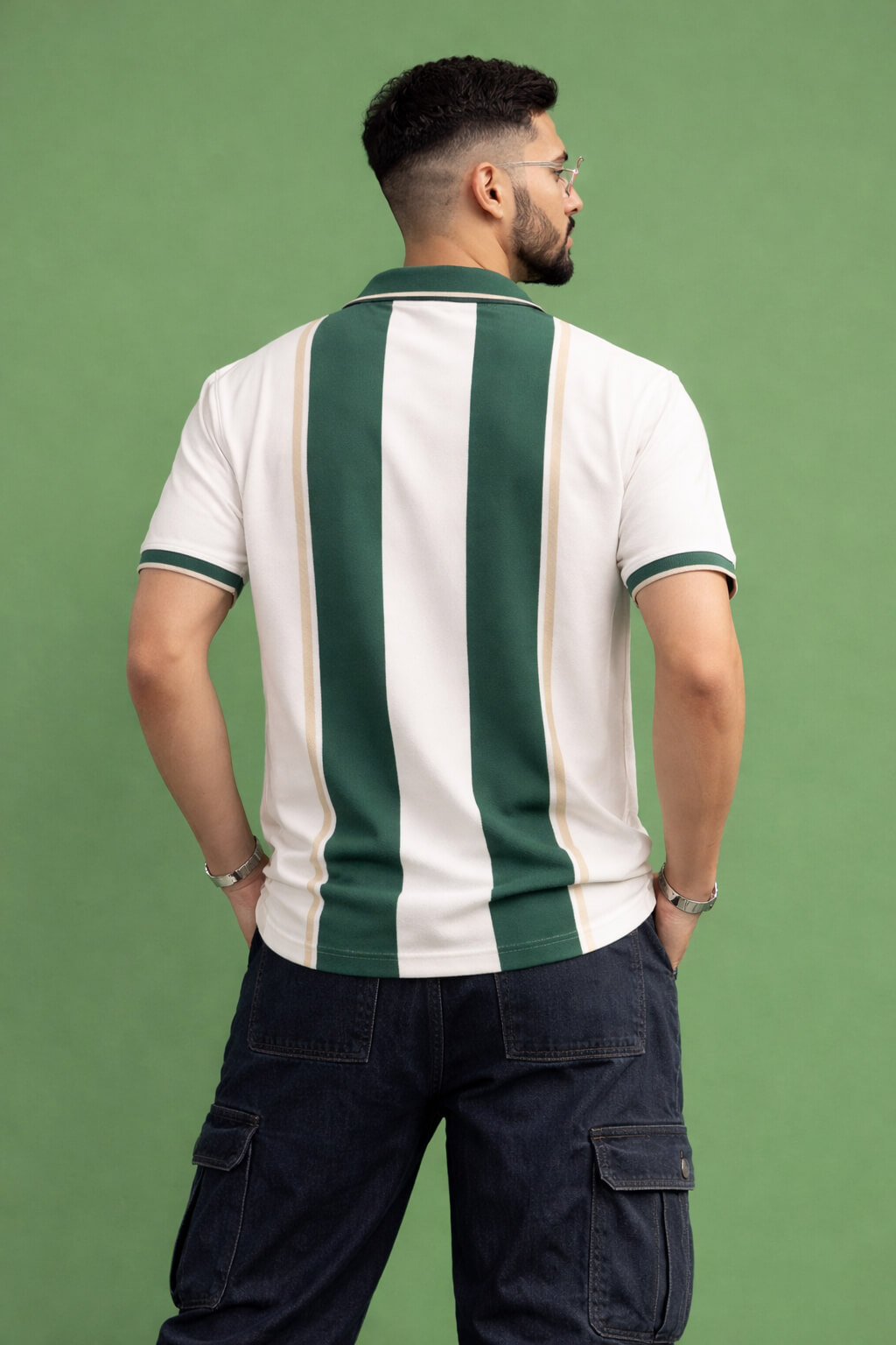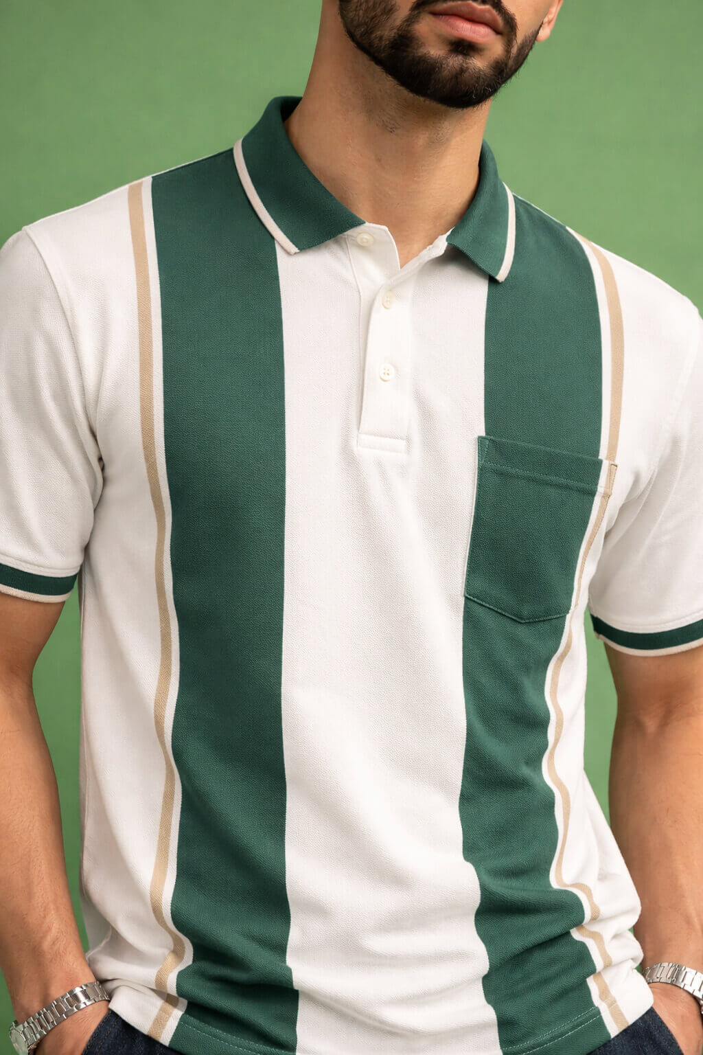 Elevate your casual wardrobe with this stylish Men's Green Striped Polo Shirt. Crafted from soft, breathable fabric, it features bold green and white vertical stripes with subtle light tan accents that add a touch of sophistication to your everyday look. Designed for comfort and style, this polo shirt is perfect for a day out or a relaxed weekend gathering. The classic fit and clean lines ensure a flattering silhouette, while the fresh, modern color palette keeps you looking sharp. Pair it effortlessly with jeans or shorts for a laid-back, yet refined appearance.