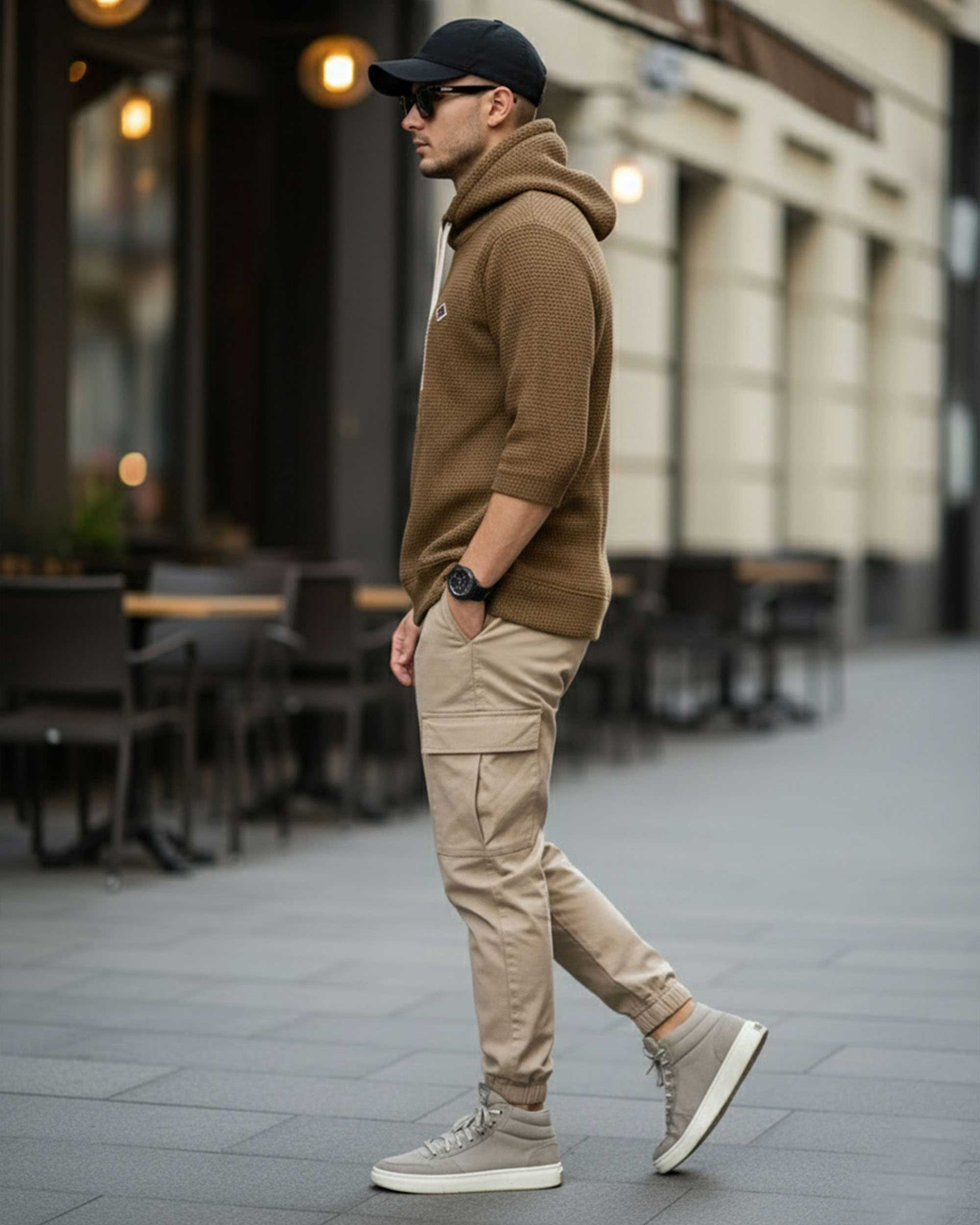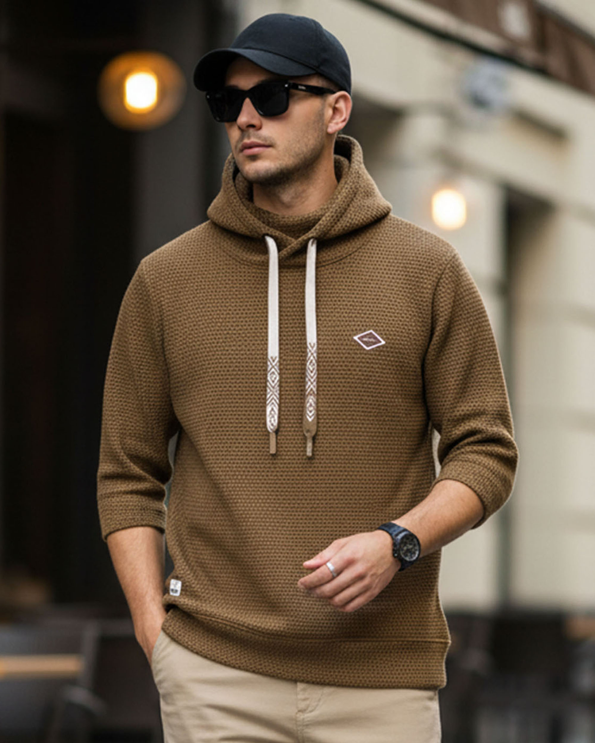 Stay stylish and warm with this premium textured brown hoodie designed for men who love comfort with a modern streetwear look. Made from soft and warm knitted fabric, this hoodie features a high-neck hood, contrast drawstrings,