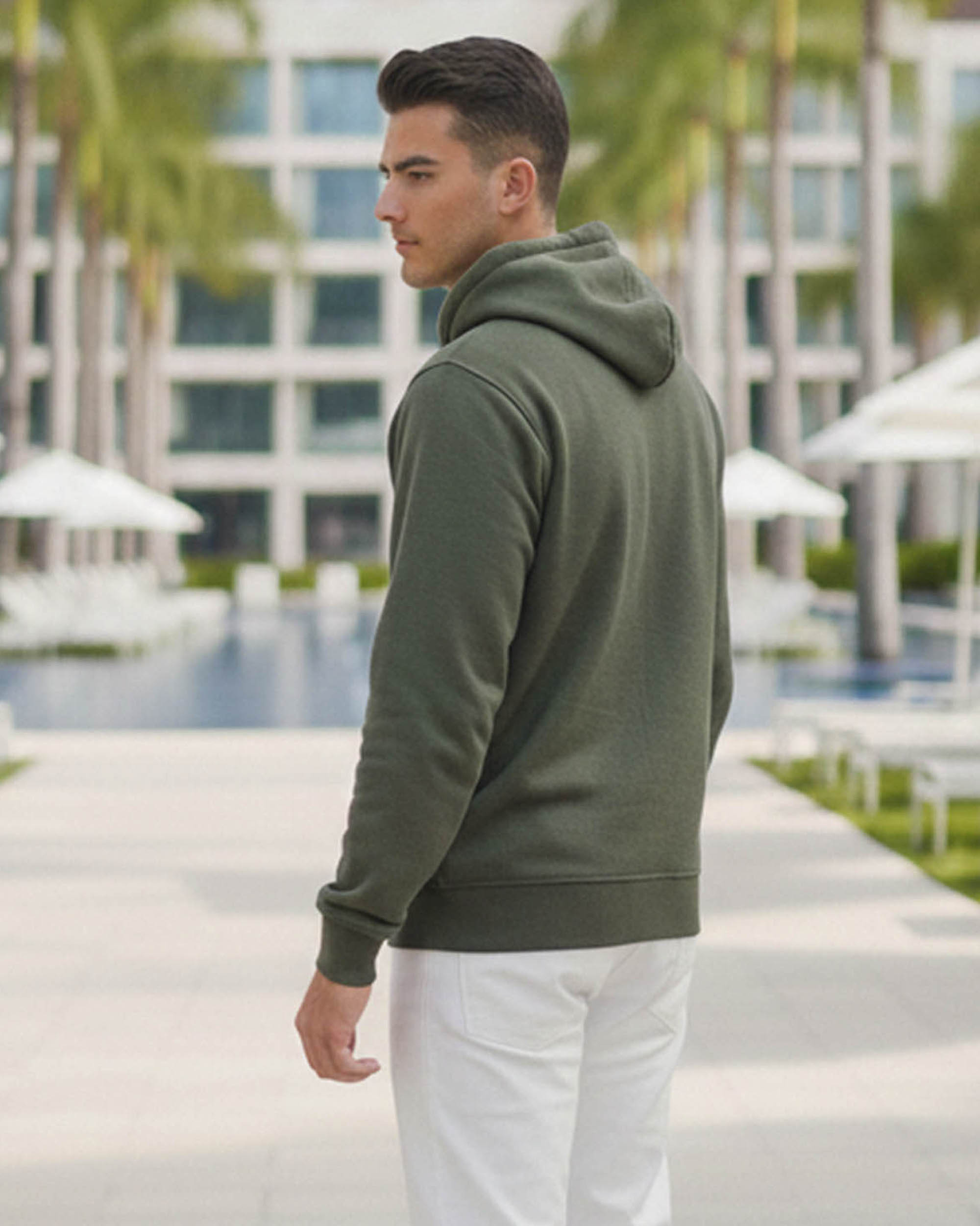 Refresh your casual wardrobe with this men’s solid olive green hooded sweatshirt. Crafted from a soft and breathable cotton blend fabric, this hoodie offers all-day comfort with a premium look. Featuring a minimalist solid design, adjustable hood, and side pocket, it is perfect for casual outings, travel,