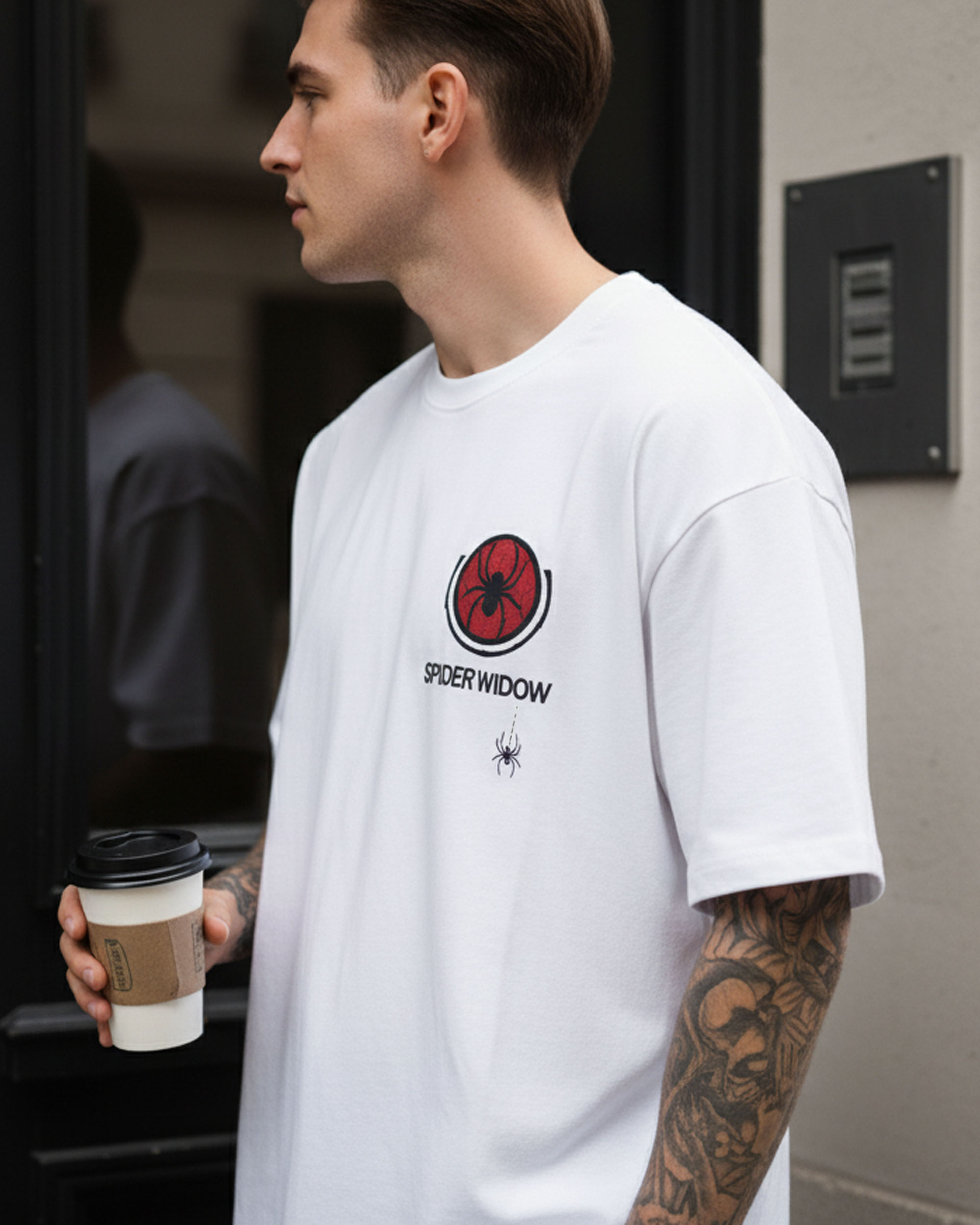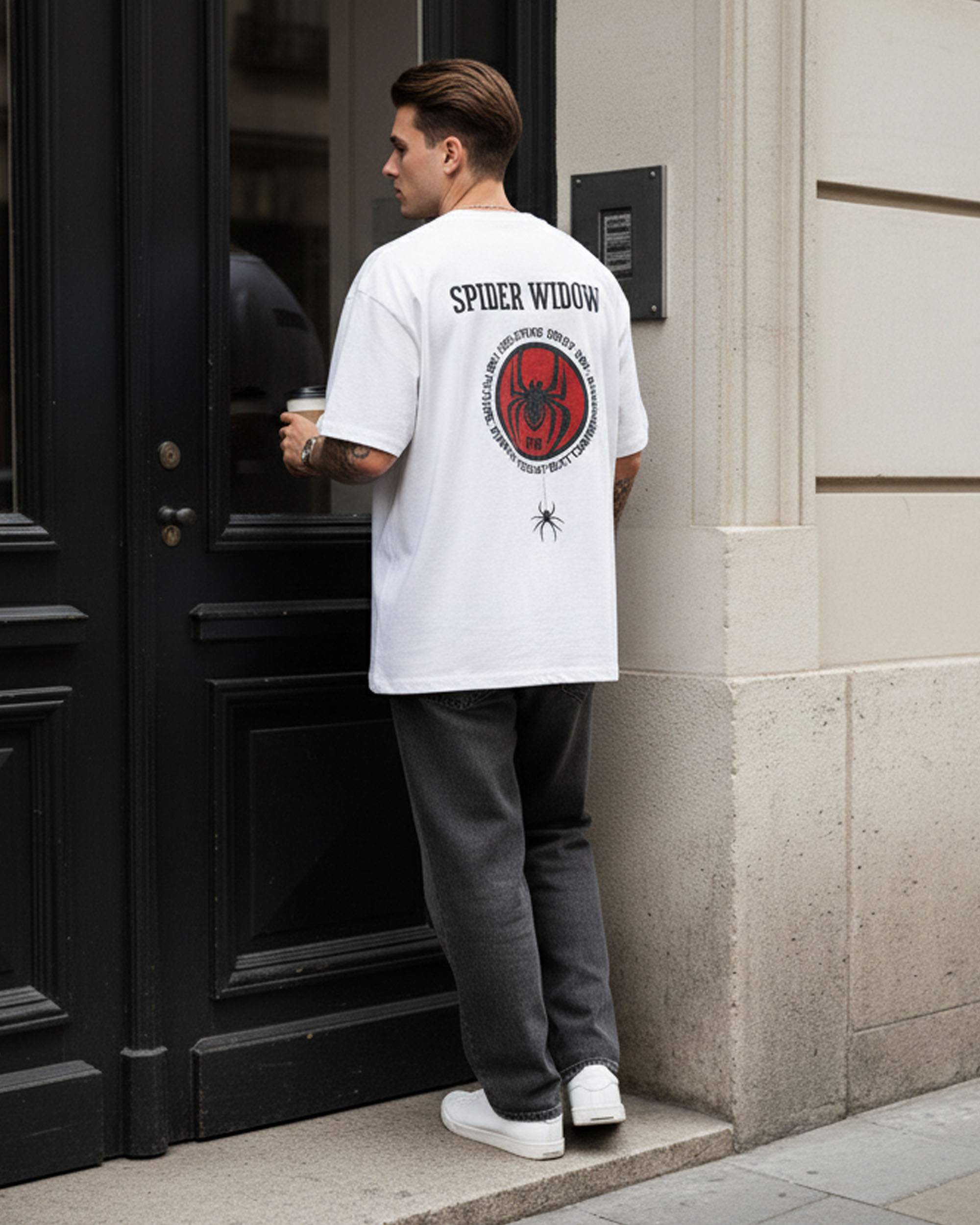Add a bold streetwear edge to your wardrobe with this Men’s Oversized White Graphic T-shirt, featuring the striking “Spider Widow” emblem on the chest. Made using ultra-soft premium cotton, this tee delivers superior comfort, a relaxed drape, and a high-fashion silhouette.