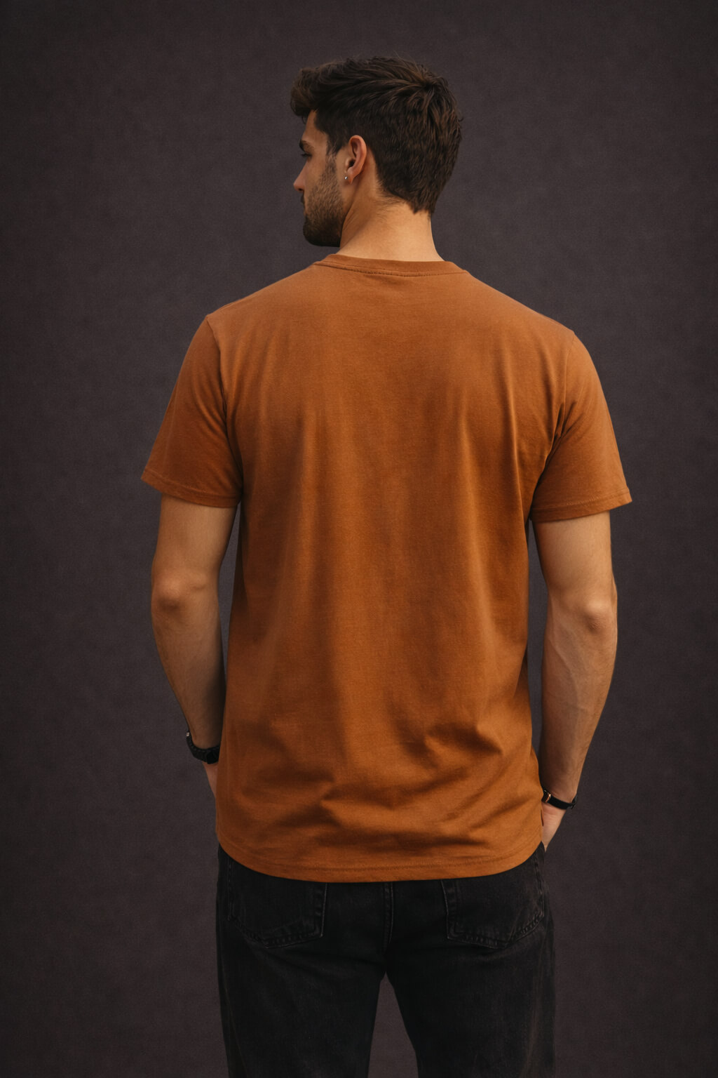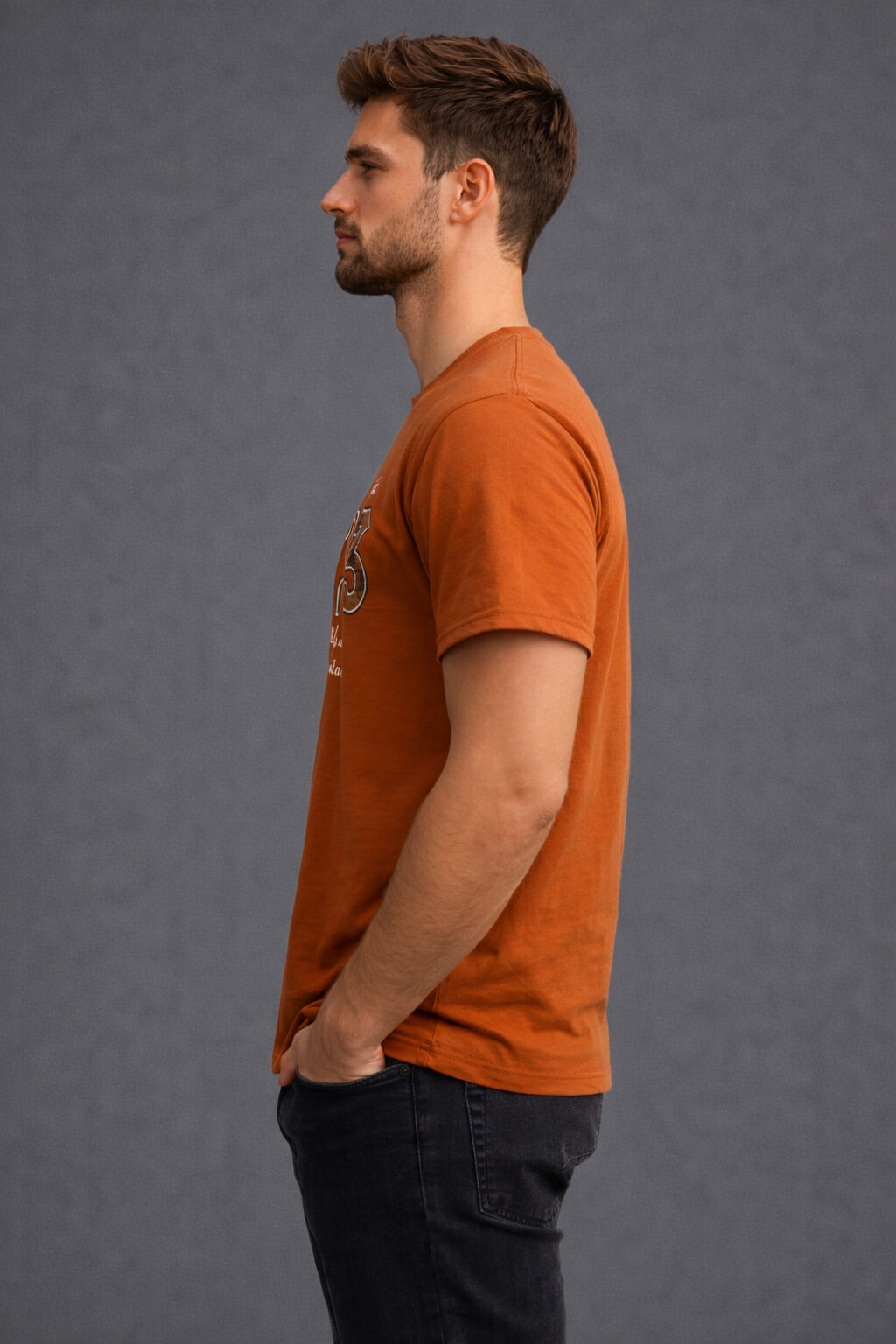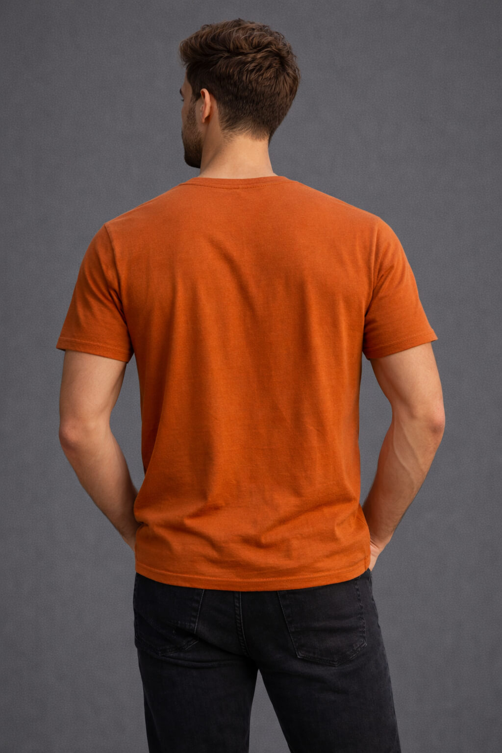 Crafted from premium-quality breathable fabric, this tee ensures all-day comfort with a soft, smooth feel against the skin. The rich rust orange base delivers a warm, earthy tone that enhances your casual look while offering a modern and trendy appeal.