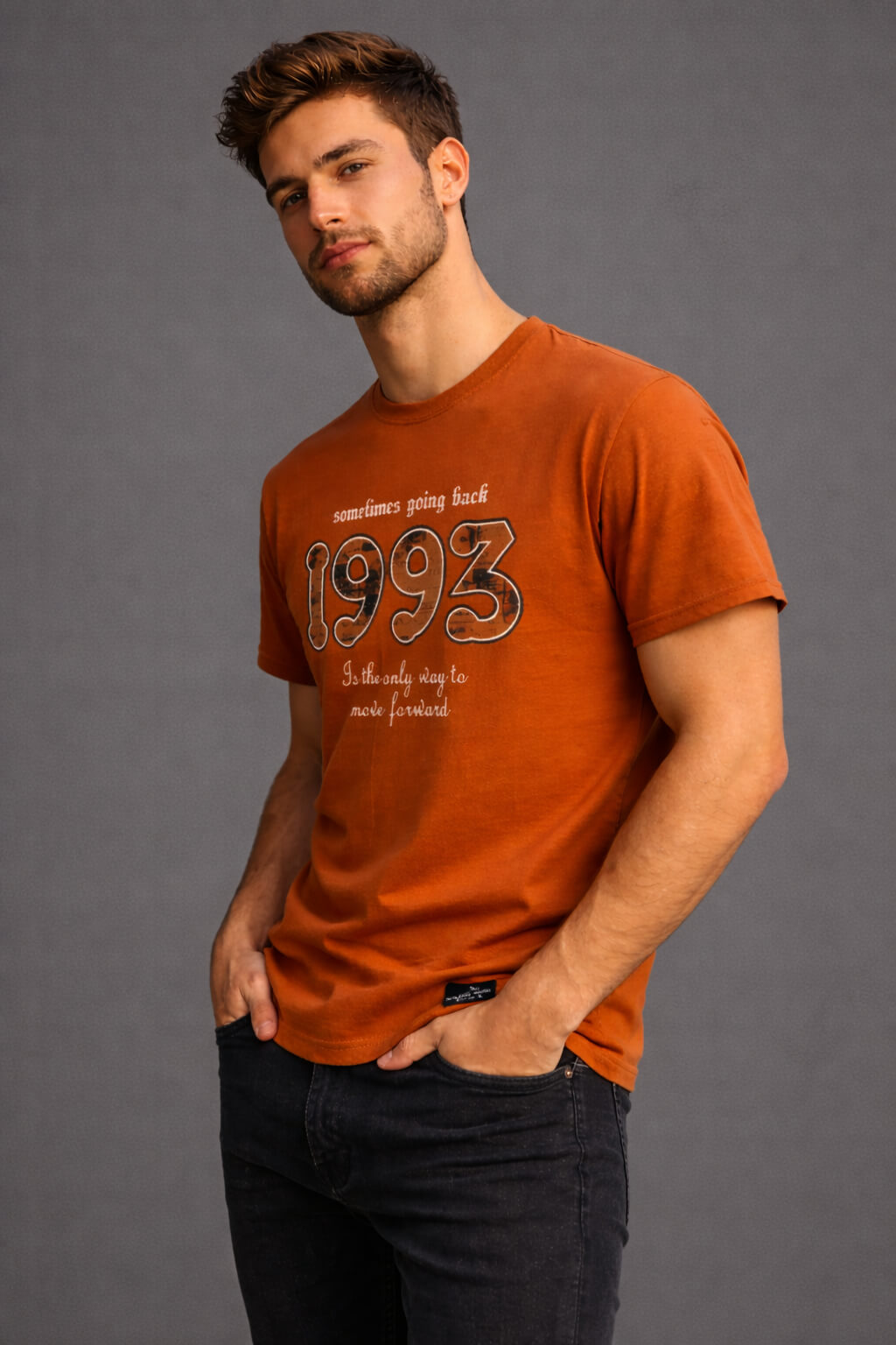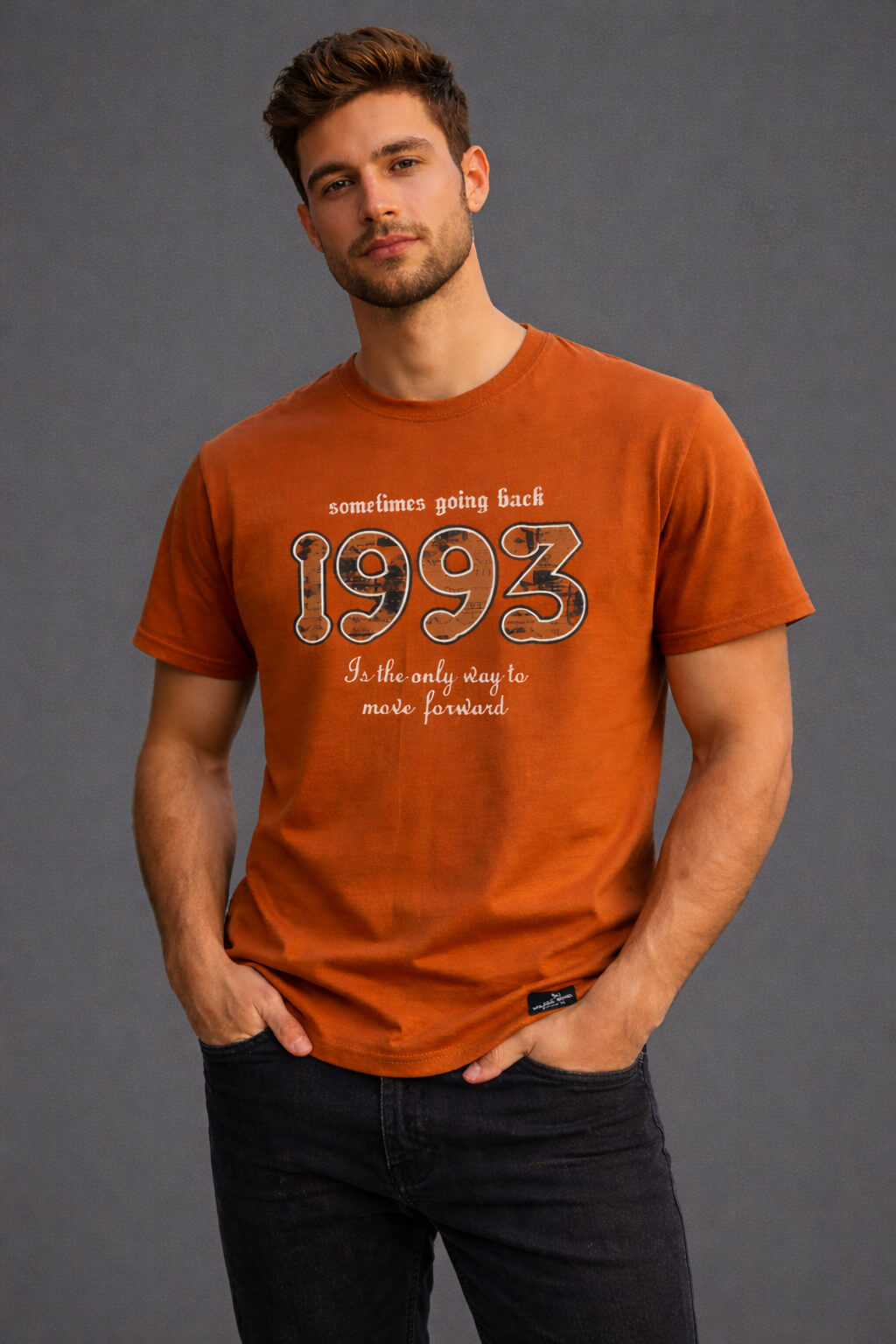 Add a bold and confident touch to your everyday wardrobe with this Men’s Rust Orange 1993 Graphic Print T-Shirt from Davno. Designed for men who appreciate statement fashion with a vintage vibe, this T-shirt perfectly balances comfort and standout style.