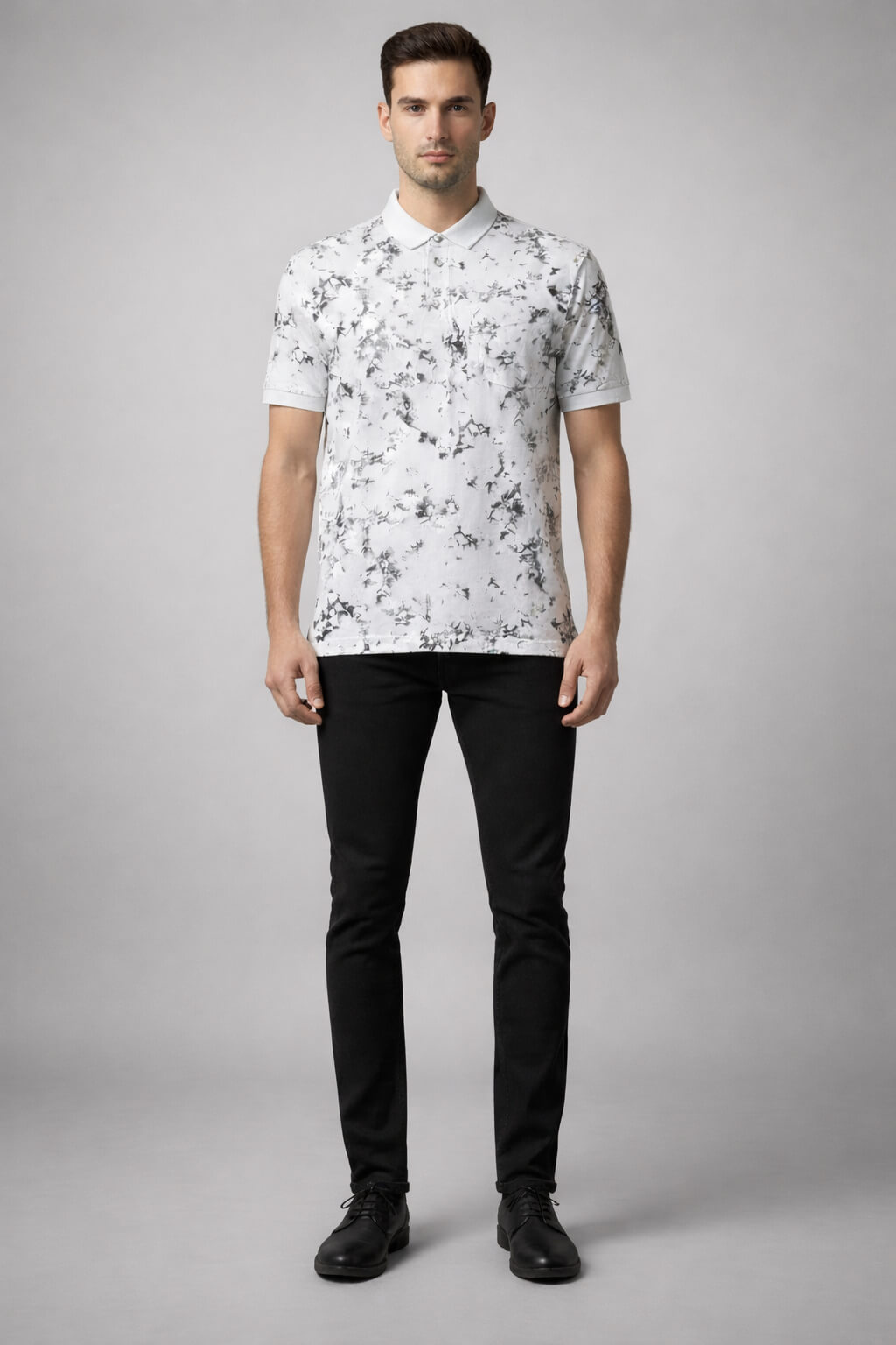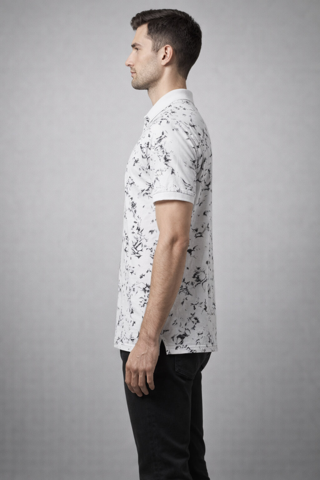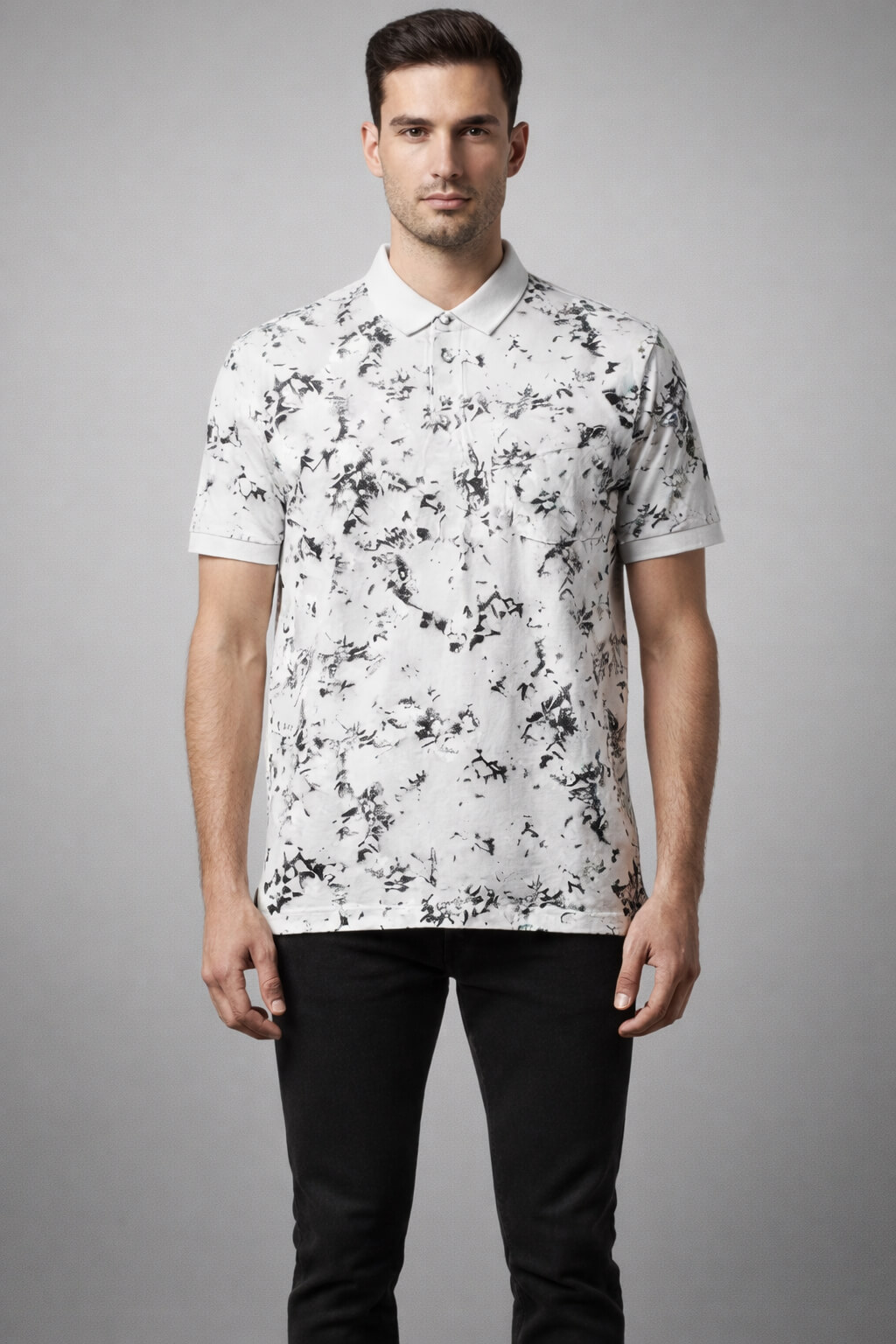 Make a statement with this white abstract printed polo T-shirt from Davno. Crafted from soft breathable cotton blend fabric, it features a striking marble-inspired pattern that adds a contemporary edge while maintaining a clean, premium feel. The structured polo collar and regular fit ensure comfort and versatility, making it ideal for both relaxed outings and elevated casual styling.