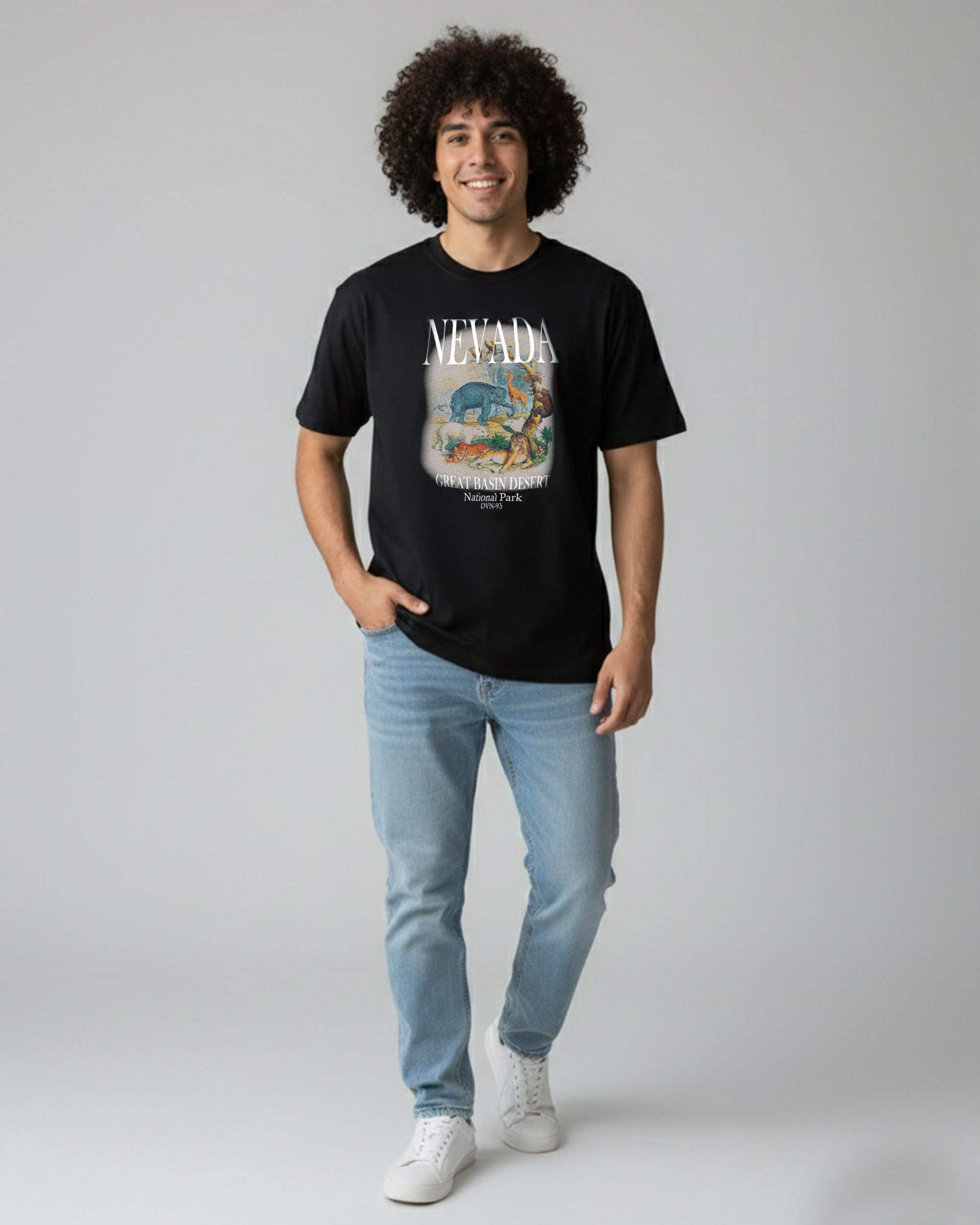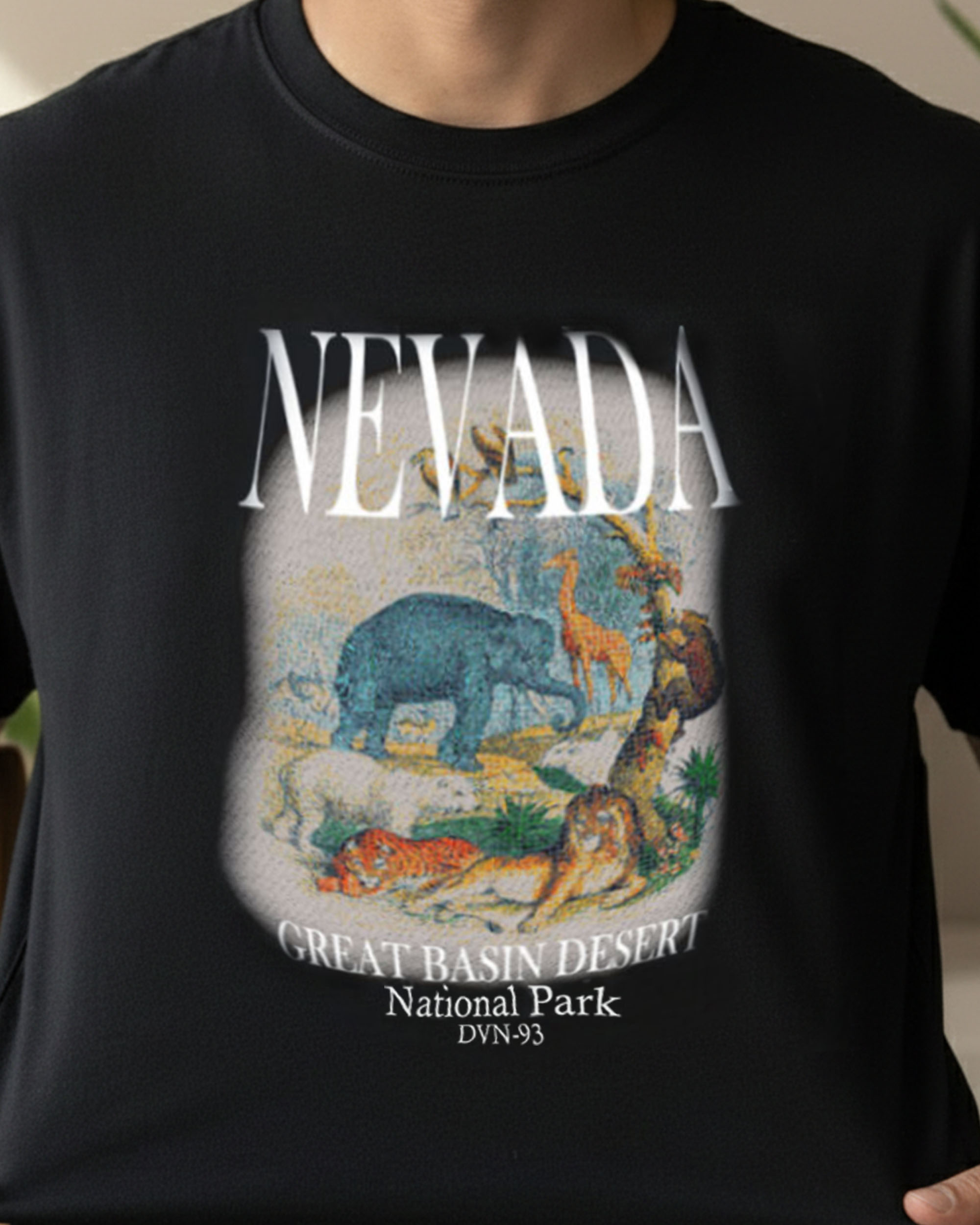Refresh your casual wardrobe with this stylish Men’s Printed Black T-shirt featuring a bold “NEVADA – National Park” wildlife graphic print on the front. Made from soft breathable cotton fabric, this T-shirt delivers all-day comfort and a premium feel, perfect for everyday wear.