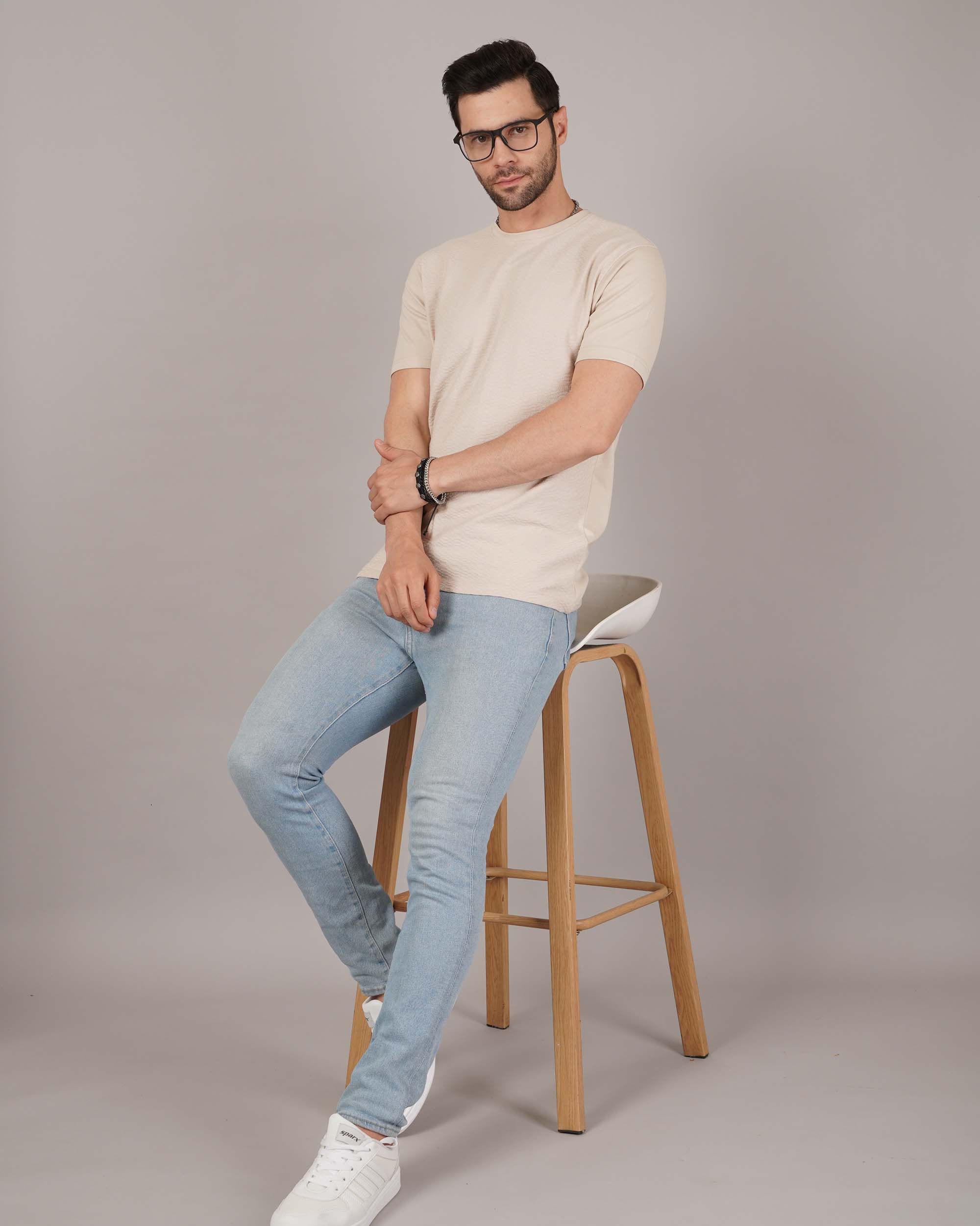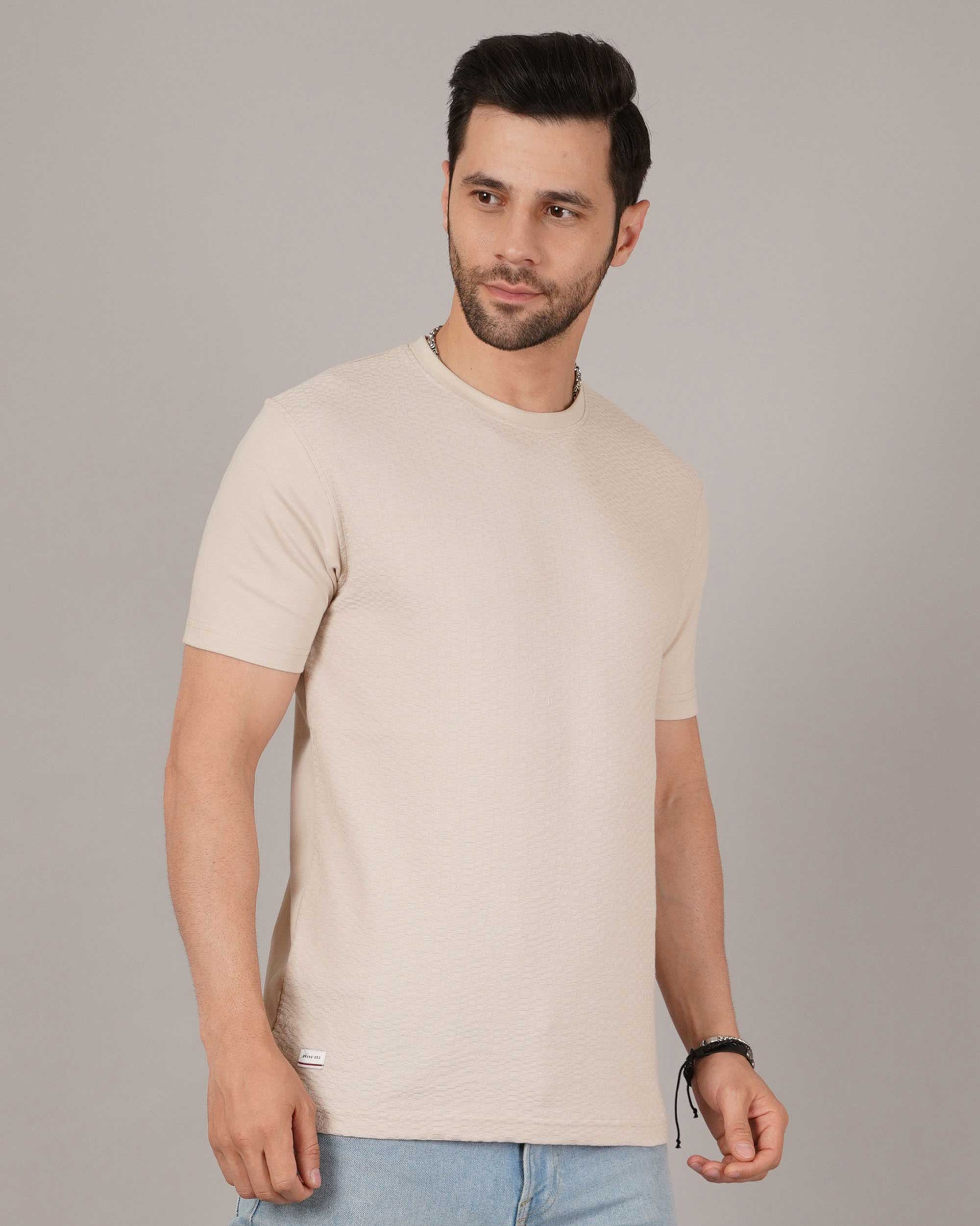 Elevate your casual wardrobe with this versatile beige textured crew-neck t-shirt. Designed for everyday comfort, it features a soft, breathable fabric and a slim fit for a modern, tailored look. Perfect for pairing with jeans or chinos, this tee transitions effortlessly from day to night.