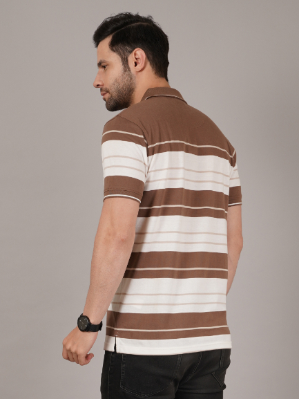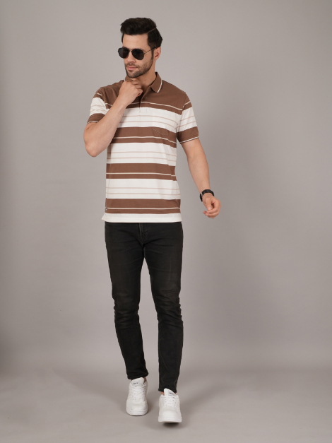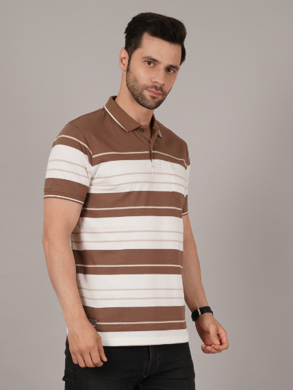 Bring a classy casual look to your wardrobe with this DAVNO polo t-shirt featuring rich brown and white horizontal stripes. Designed with a soft and breathable fabric, it offers all-day comfort with a stylish edge. The polo collar with contrast tipping, chest pocket, and half sleeves add to the timeless design. Perfect for outings, casual Fridays, or everyday wear, this versatile tee pairs well with jeans, chinos, or shorts.