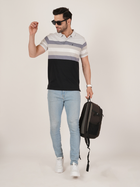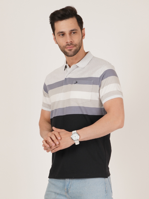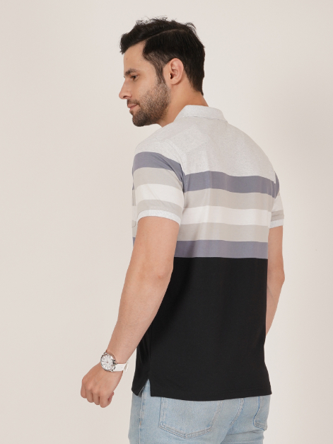 Upgrade your everyday wardrobe with this DAVNO polo t-shirt featuring modern horizontal stripes in shades of grey, white, and blue over a solid black lower panel. Made from comfortable, breathable fabric, it blends style and ease for daily wear. The polo collar, button placket, and subtle chest pocket detailing add a refined touch. Ideal for casual outings, workwear, and weekend styling, this versatile piece pairs effortlessly with jeans, chinos, or shorts.
