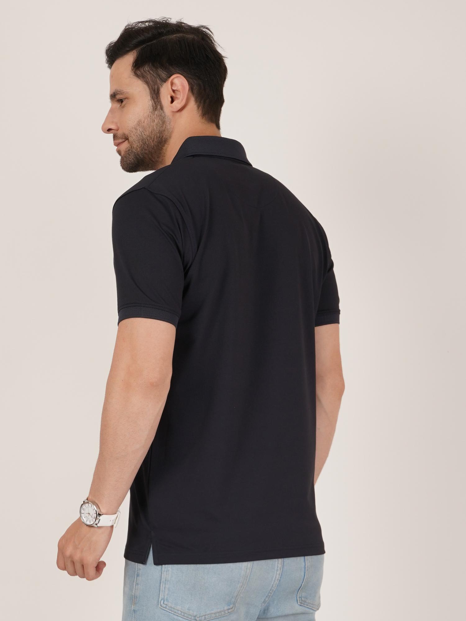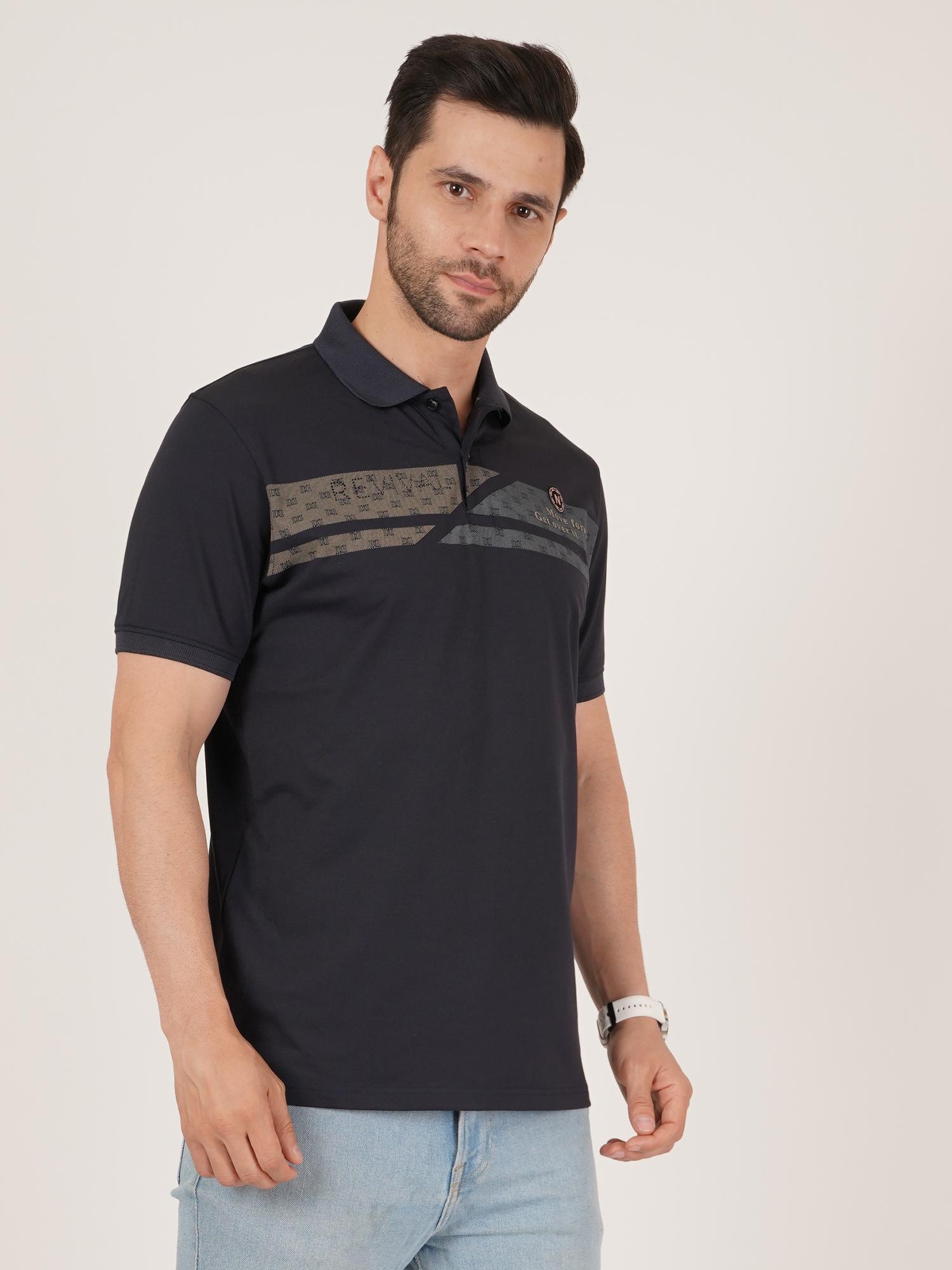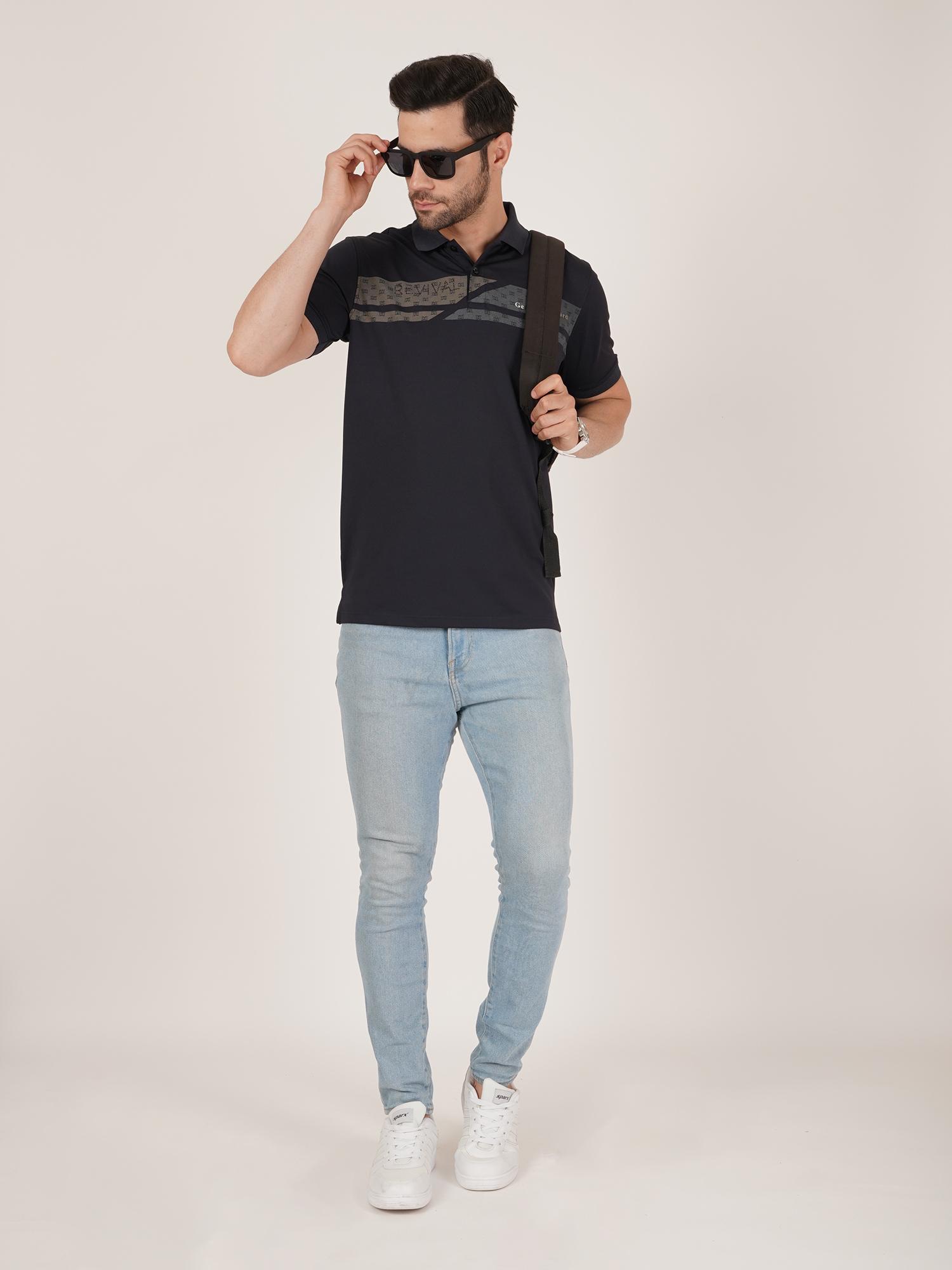 Step up your smart-casual wardrobe with this DAVNO navy polo t-shirt featuring a stylish graphic panel across the chest. The contrasting printed design adds a modern edge, while the classic collar and button placket keep the look effortlessly refined. Crafted from soft, breathable fabric, this half-sleeve polo ensures all-day comfort and versatile wear—perfect for outings, casual Fridays, or everyday style.