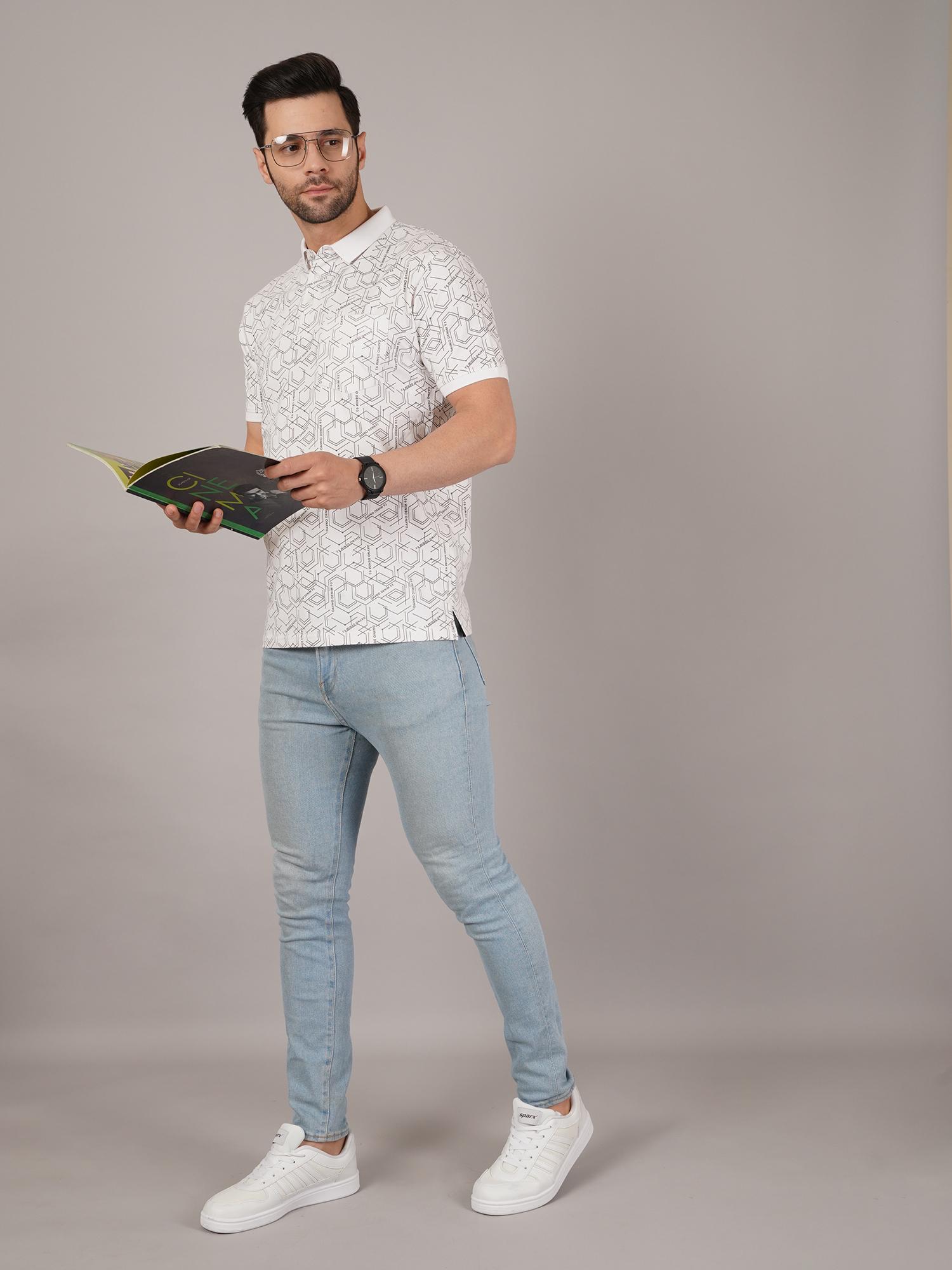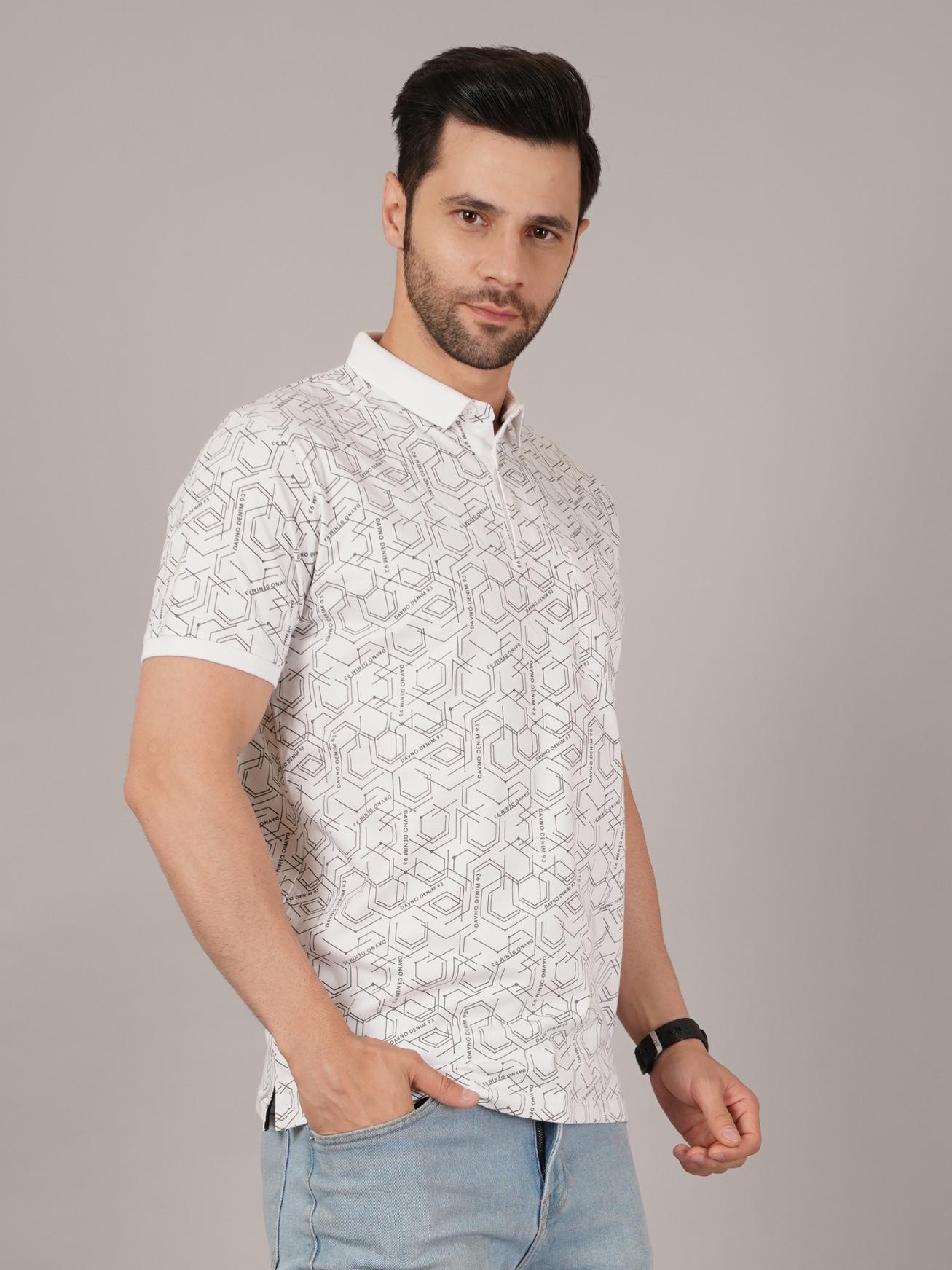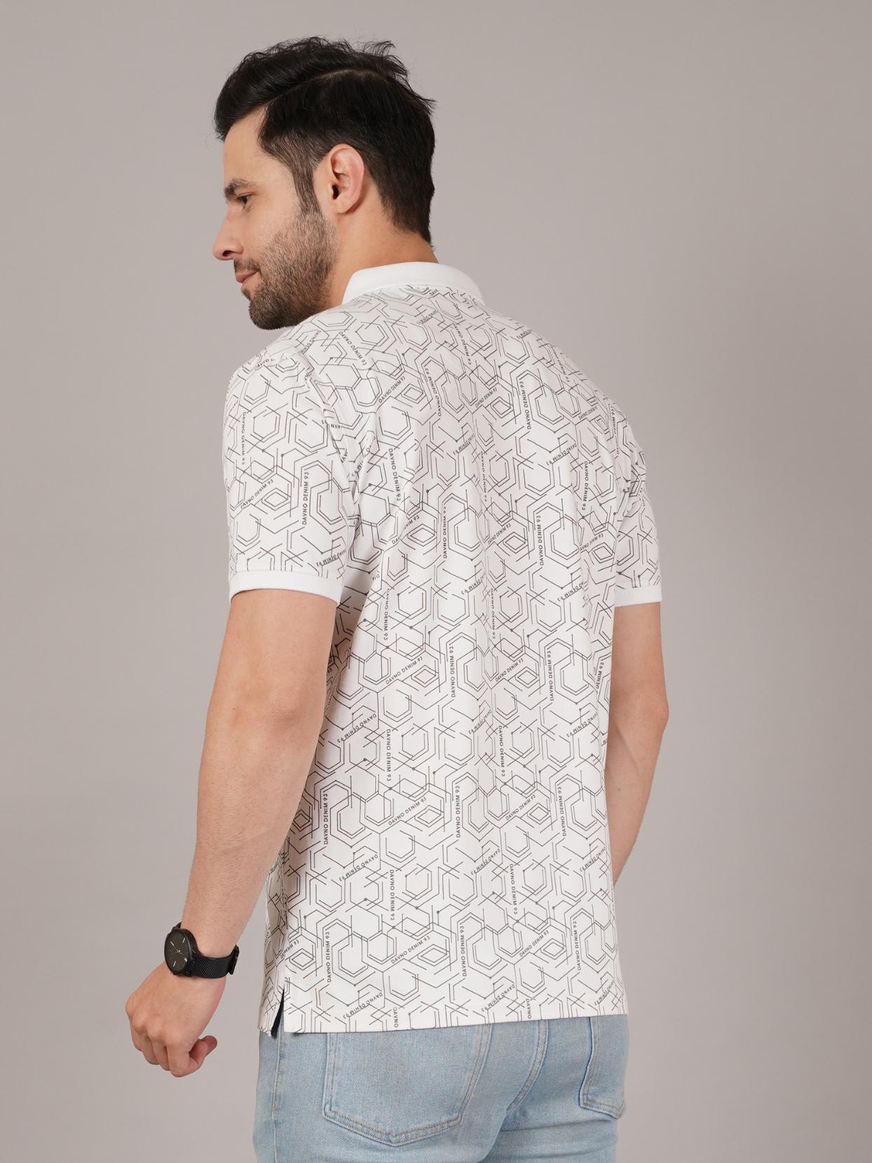 Elevate your casual wardrobe with this DAVNO white polo t-shirt featuring an all-over geometric print. The subtle yet modern pattern adds a stylish edge, while the classic collar and short sleeves maintain a timeless polo look. Made from soft, breathable fabric, it ensures day-long comfort and versatility. Ideal for outings, casual Fridays, or smart-casual dressing, this tee pairs perfectly with jeans, chinos, or shorts