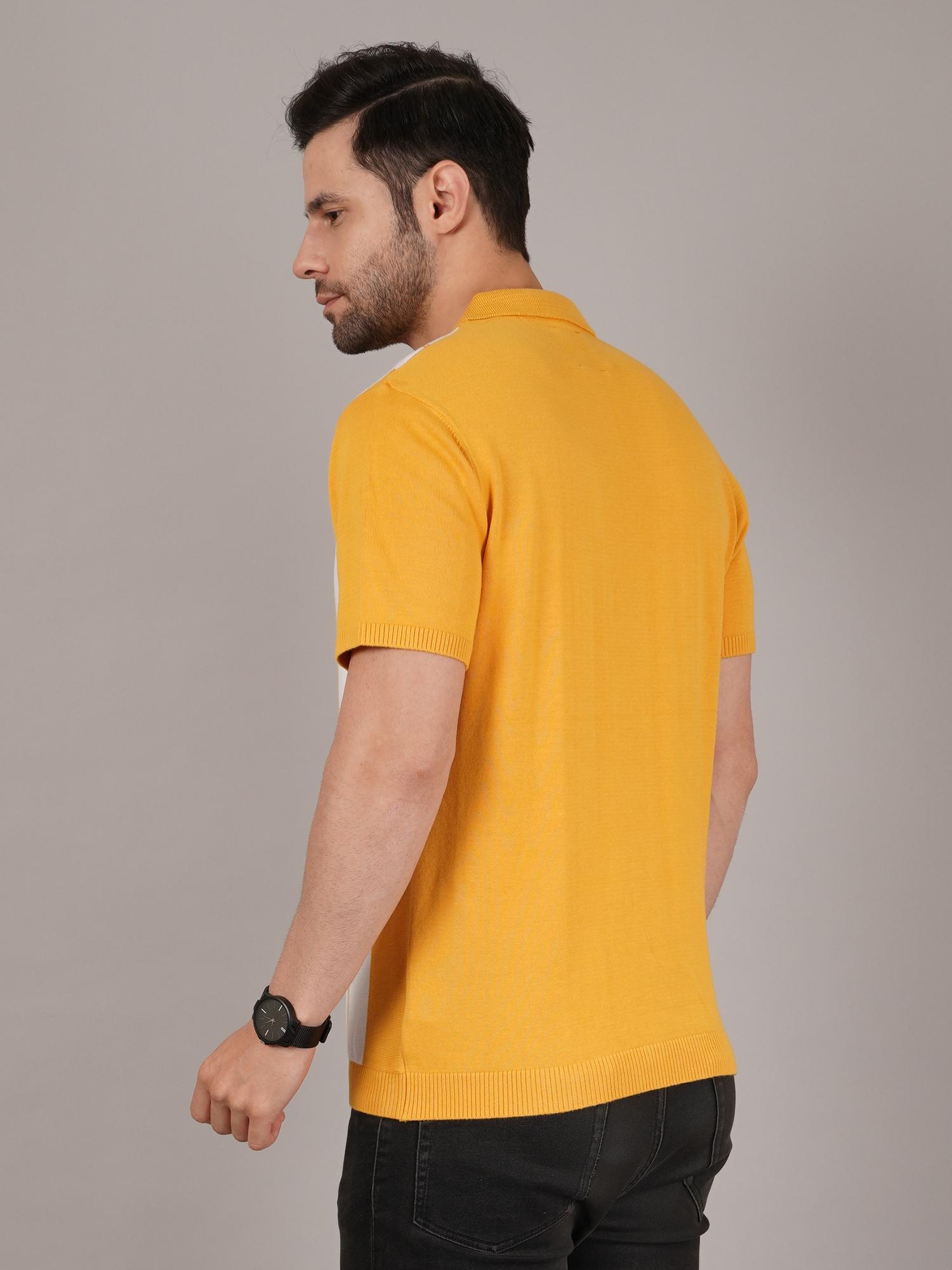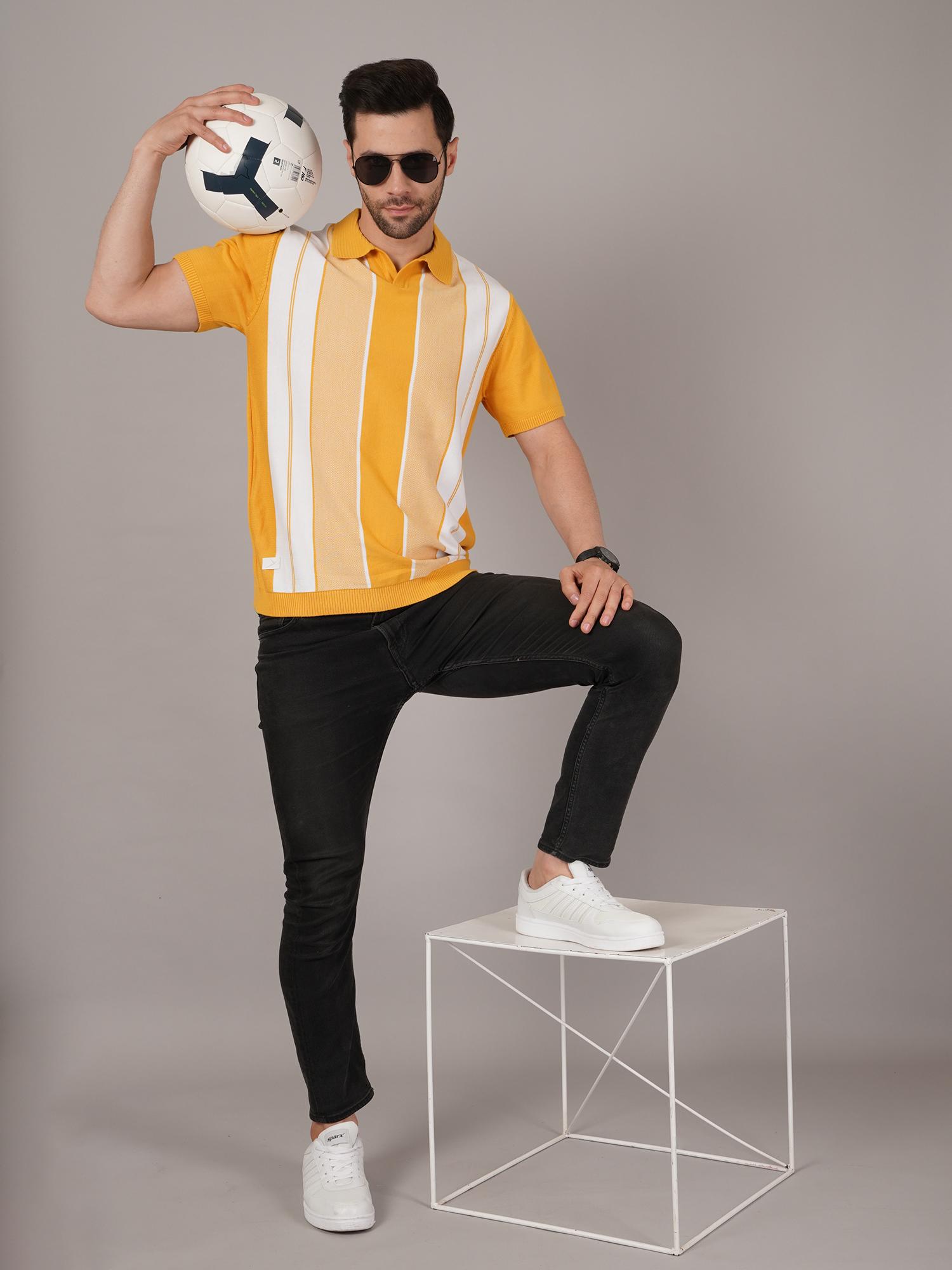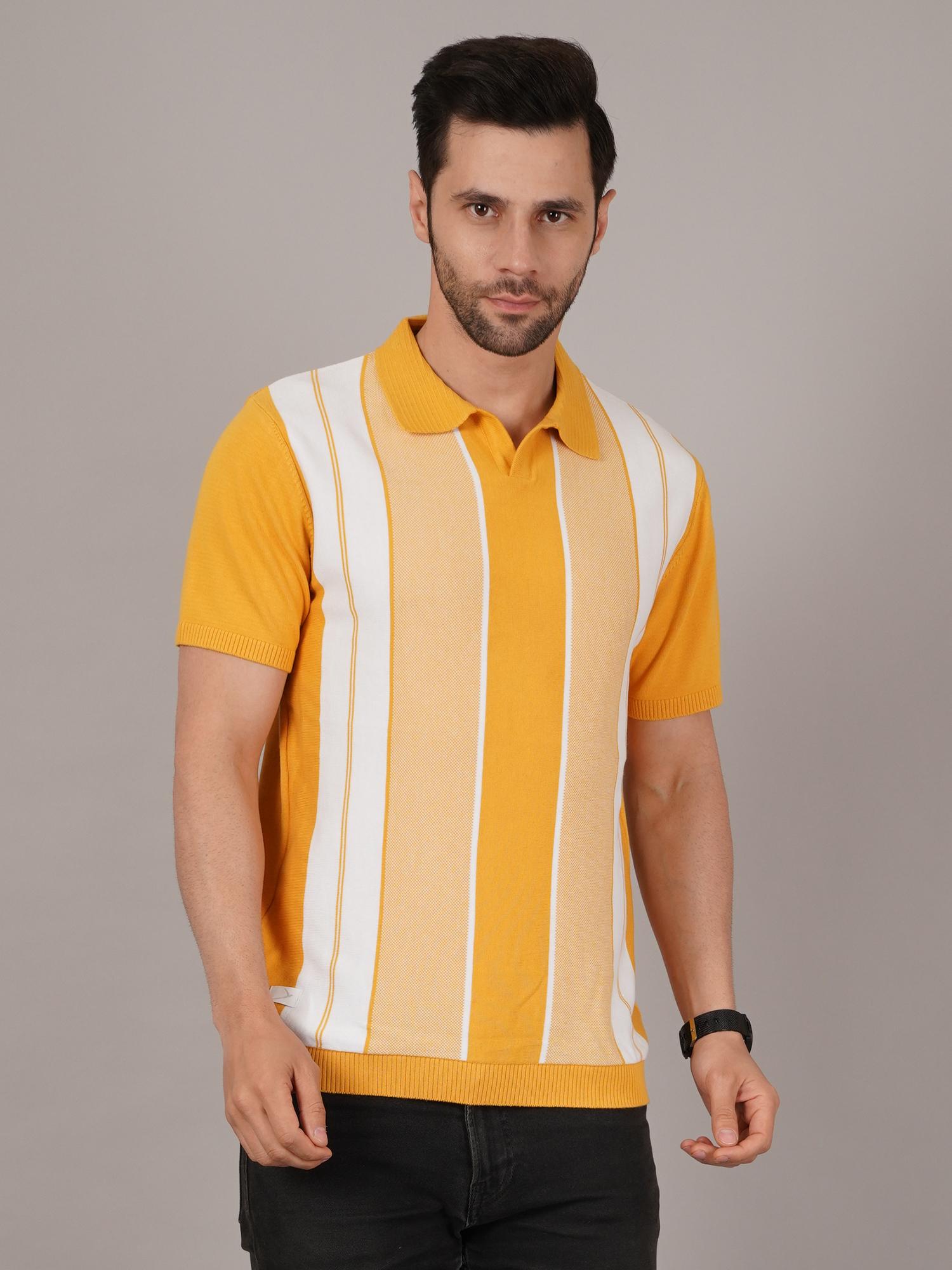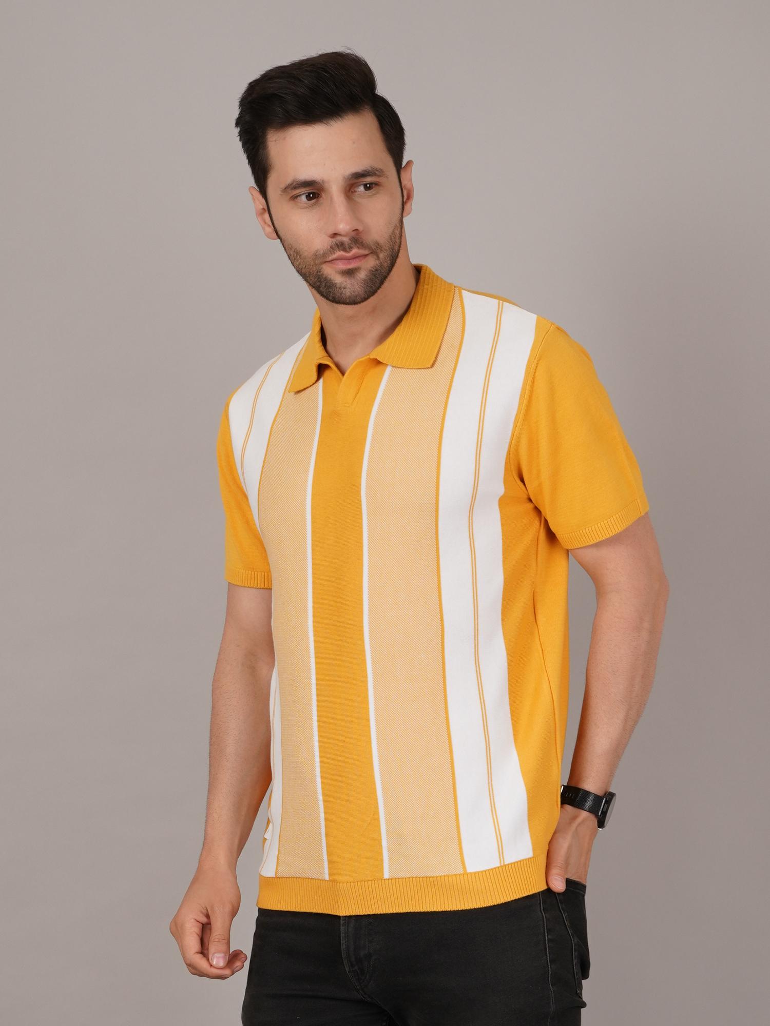 Add a fresh pop of color to your wardrobe with this stylish DAVNO knitted polo t-shirt. Designed in a vibrant mustard yellow with vertical white panels, it offers a retro-inspired yet modern look. The breathable knitted fabric ensures all-day comfort, while the ribbed hem and sleeves provide a neat fit. Perfect for casual outings, weekend wear, or smart-casual styling, this polo pairs effortlessly with jeans, chinos, or trousers.