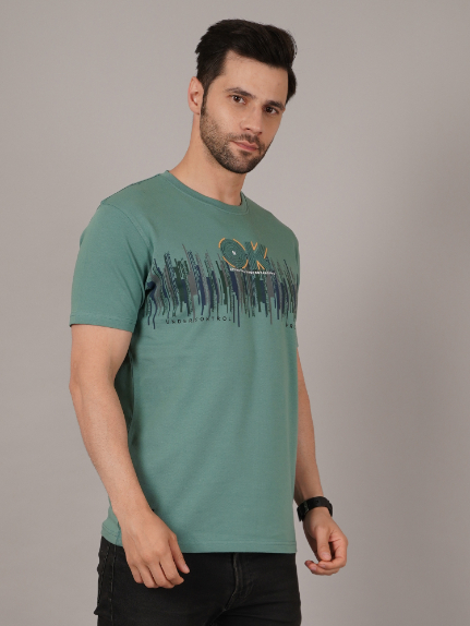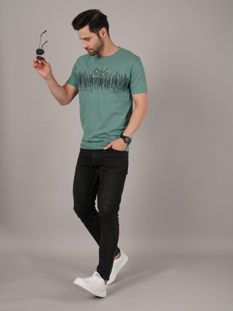 This sea-green T-shirt features a front soundwave motif and “OK” typographic detail. Its smooth texture and relaxed fit give it a stylish yet easy going appeal.