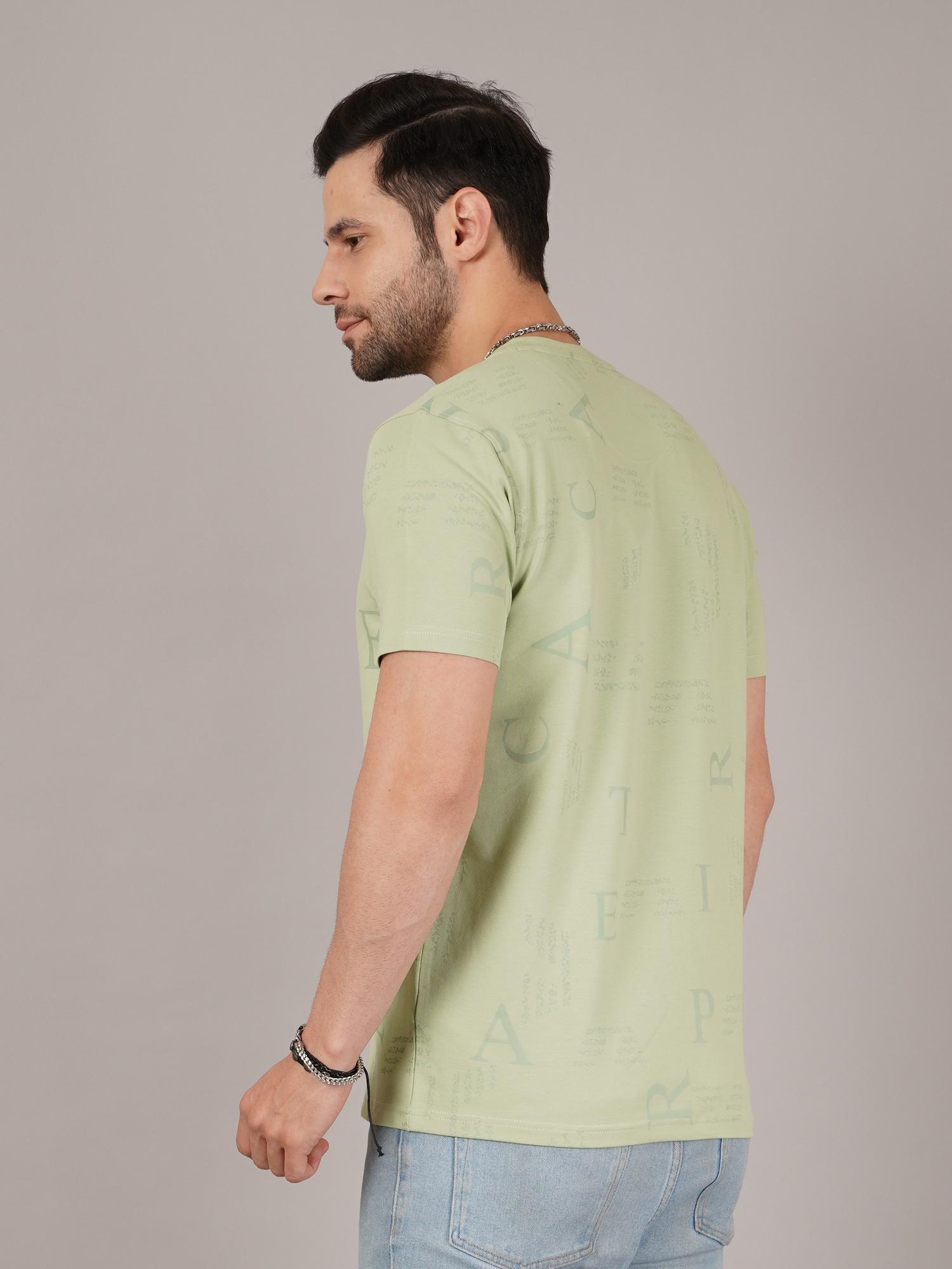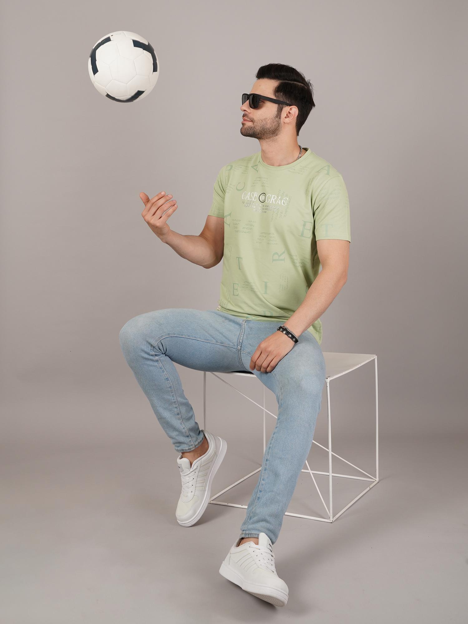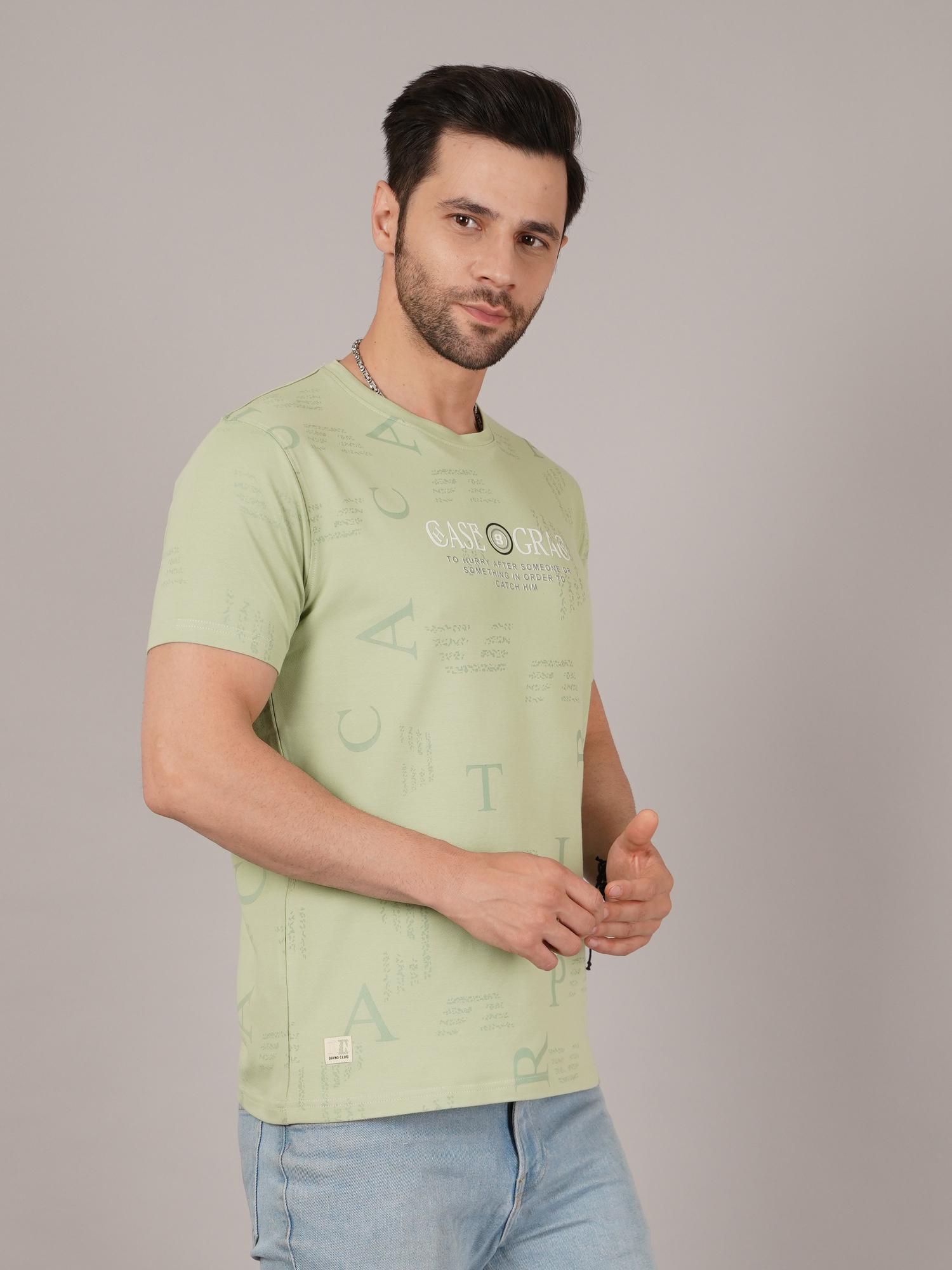 A light green tee with scattered typography and a clean chest print, this piece is designed for effortless daily wear. The breathable cotton blend and relaxed fit make it a perfect casual option for outings or everyday comfort.
