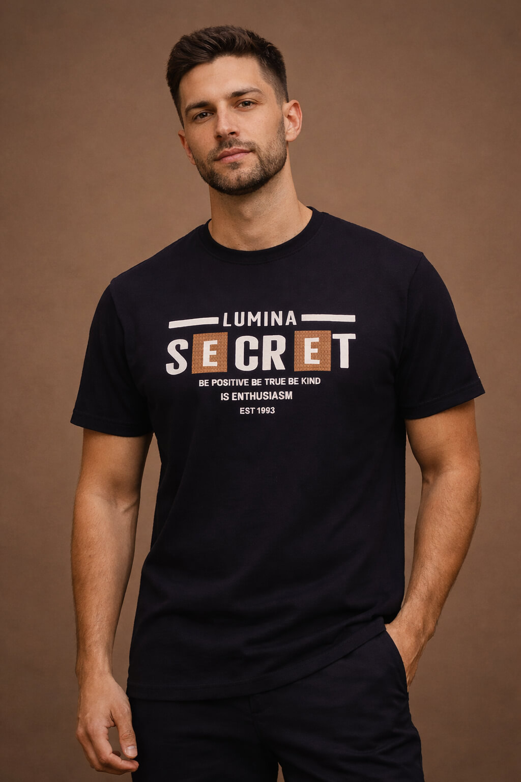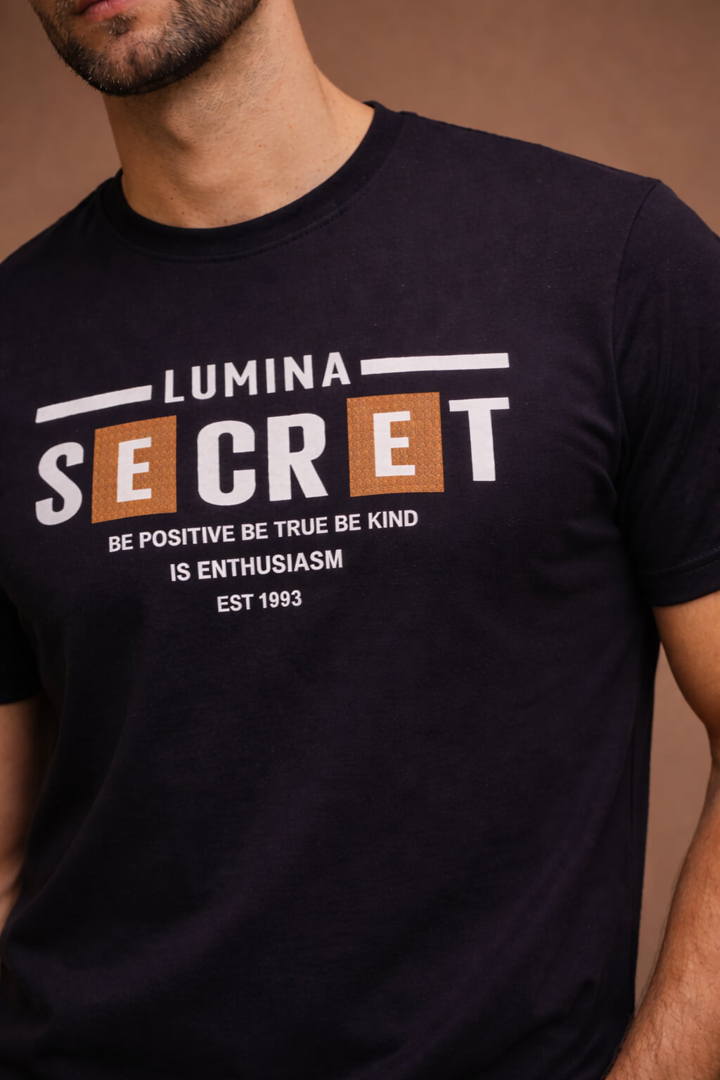 The front features a striking “LUMINA SECRET” typography print, highlighted with contrast detailing that adds depth and dimension. The motivational tagline “Be Positive Be True Be Kind – Is Enthusiasm – Est 1993” adds character and individuality to the design, giving the T-shirt a modern lifestyle appeal.