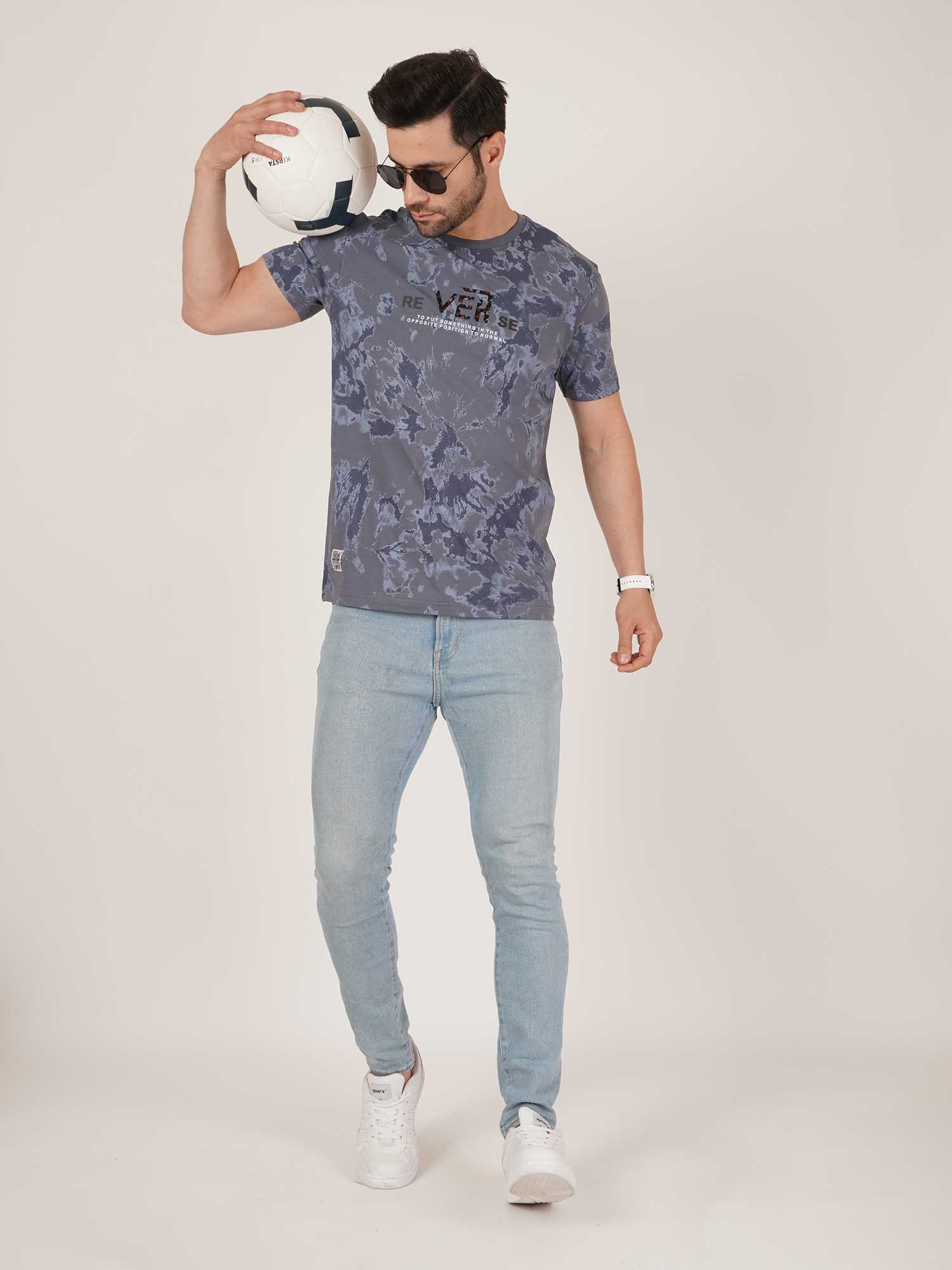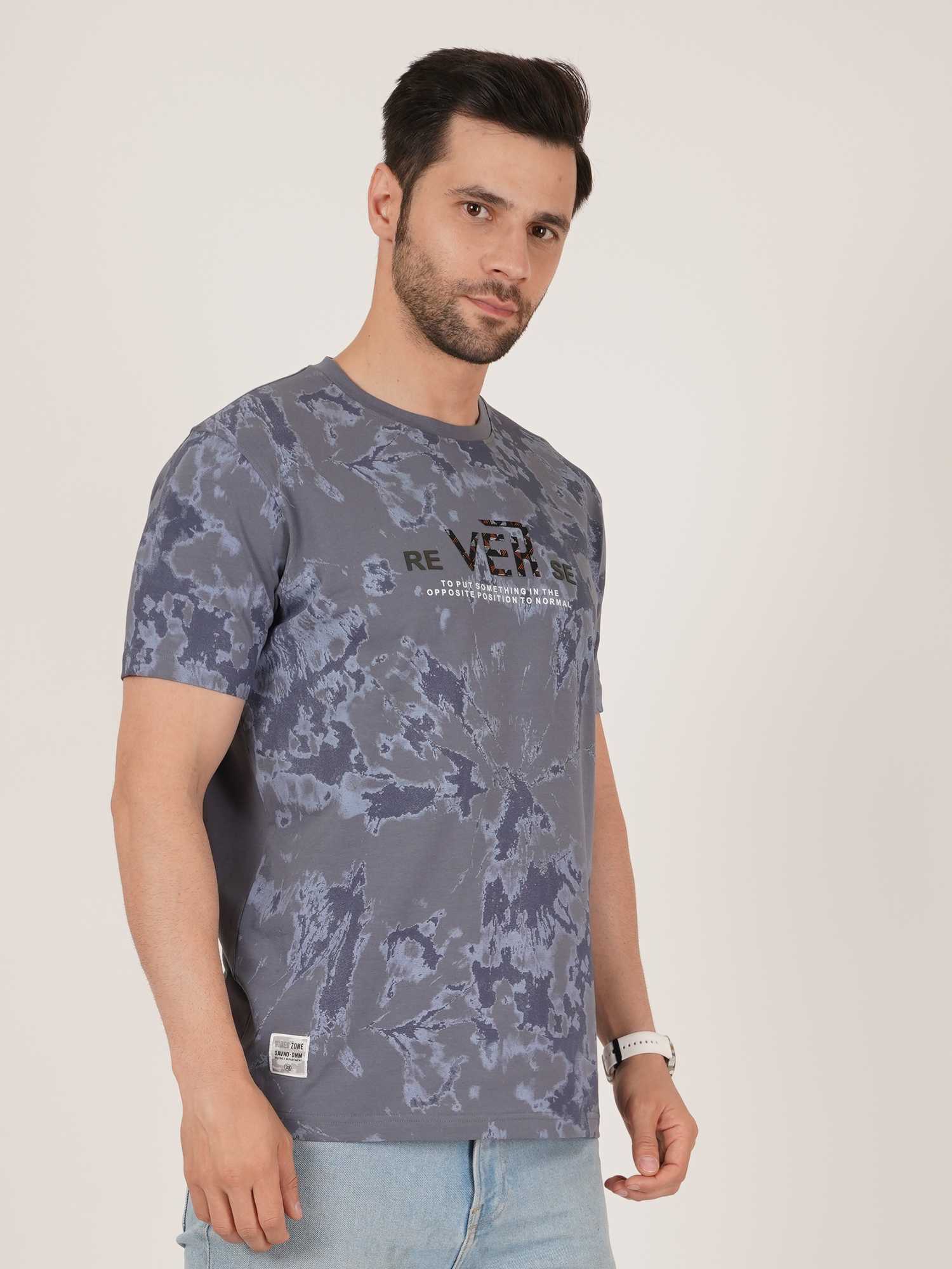 Make a bold statement with this edgy blue tie-dye T-shirt featuring a striking "REVERSE" graphic across the chest. Designed for the fashion-forward man, this tee blends street-style aesthetics with all-day comfort. The round neck and regular fit provide a relaxed yet structured silhouette, perfect for daily wear or casual hangouts.