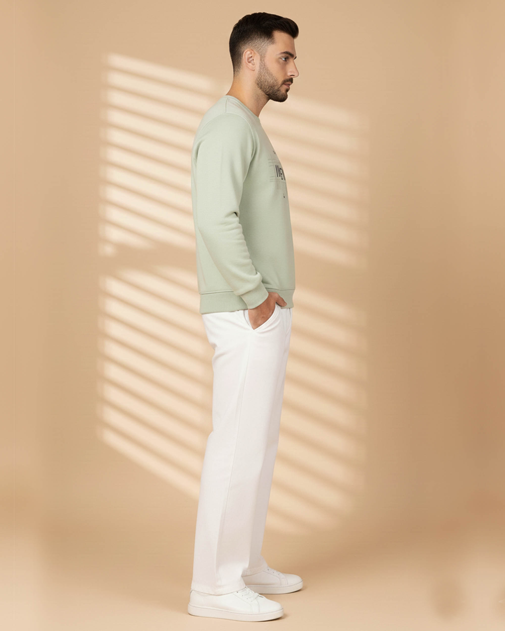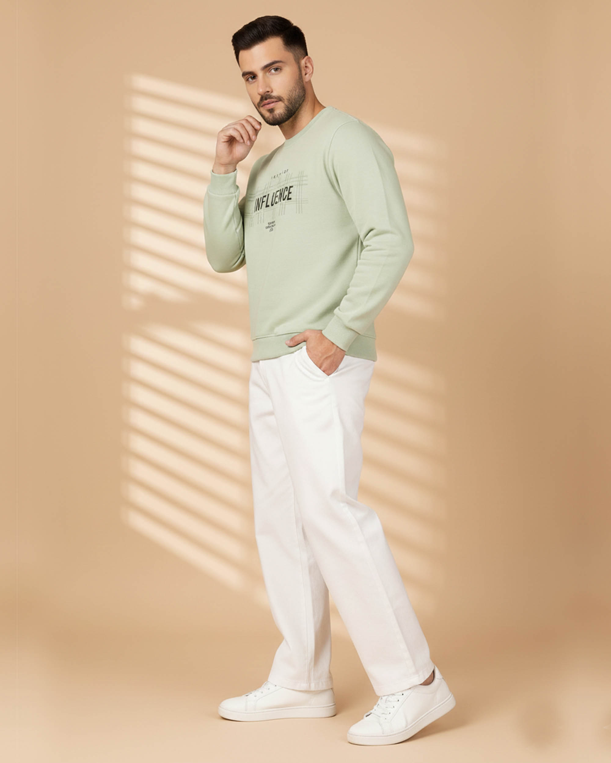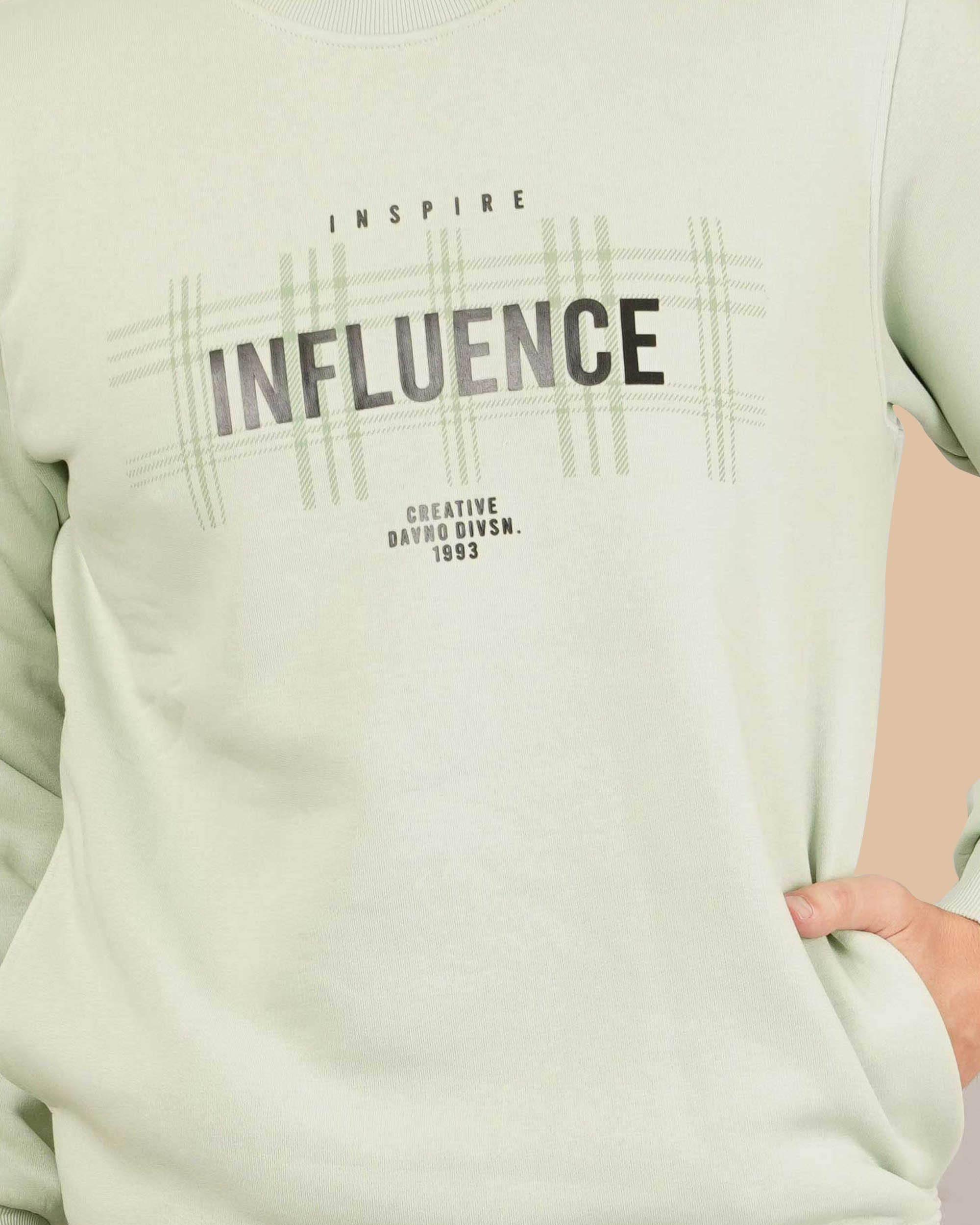 Add a fresh touch to your casual wardrobe with this mint green printed sweatshirt. Featuring a bold "Influence" graphic on the chest, this sweatshirt blends comfort and style perfectly. The soft cotton-blend fabric ensures all-day comfort, while the ribbed hem and cuffs provide a snug fit. Perfect for casual outings, college wear, or lounging in style.