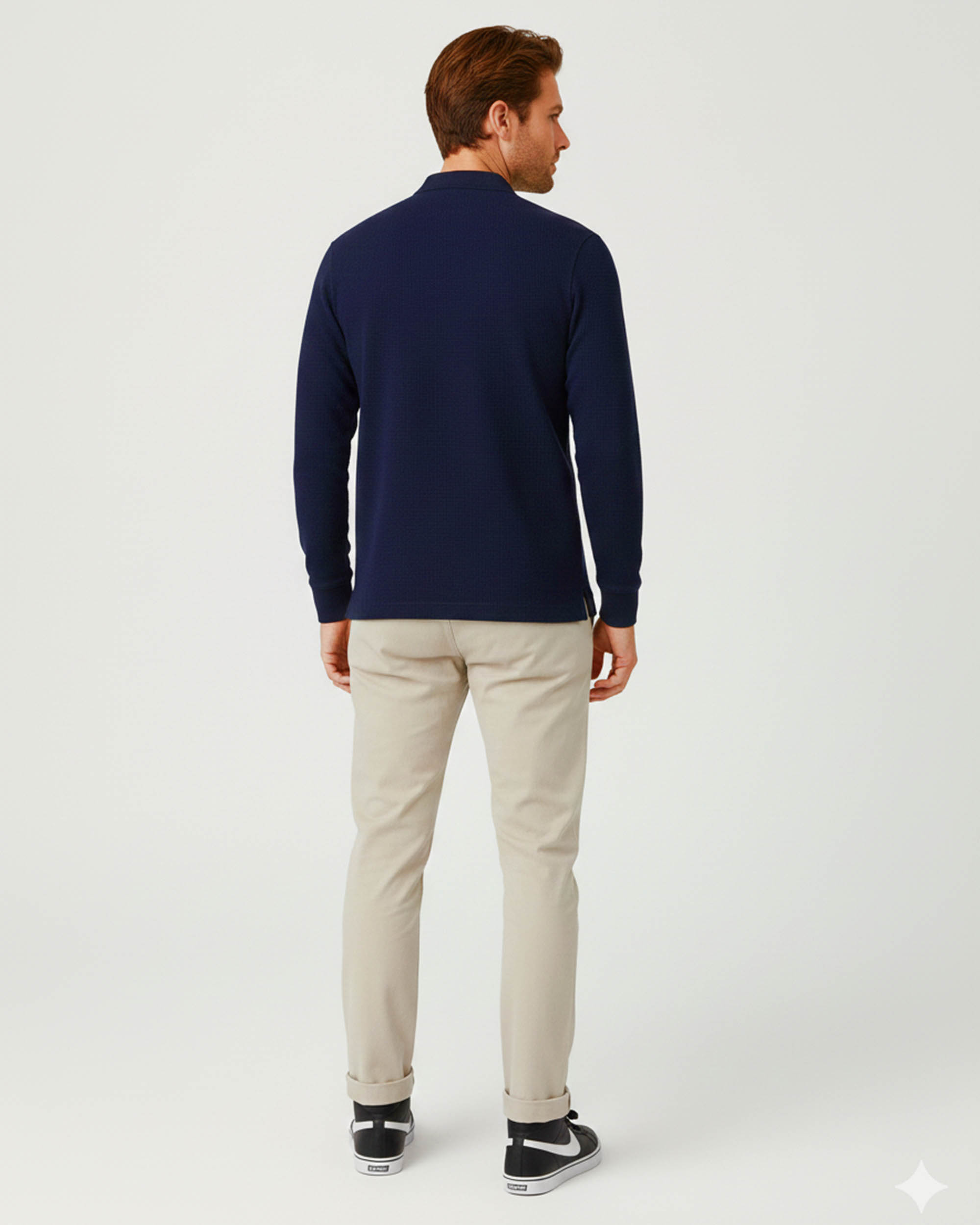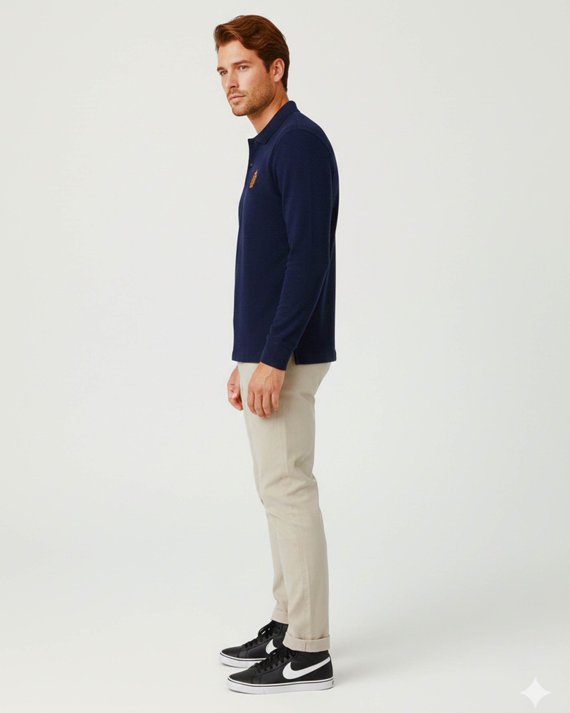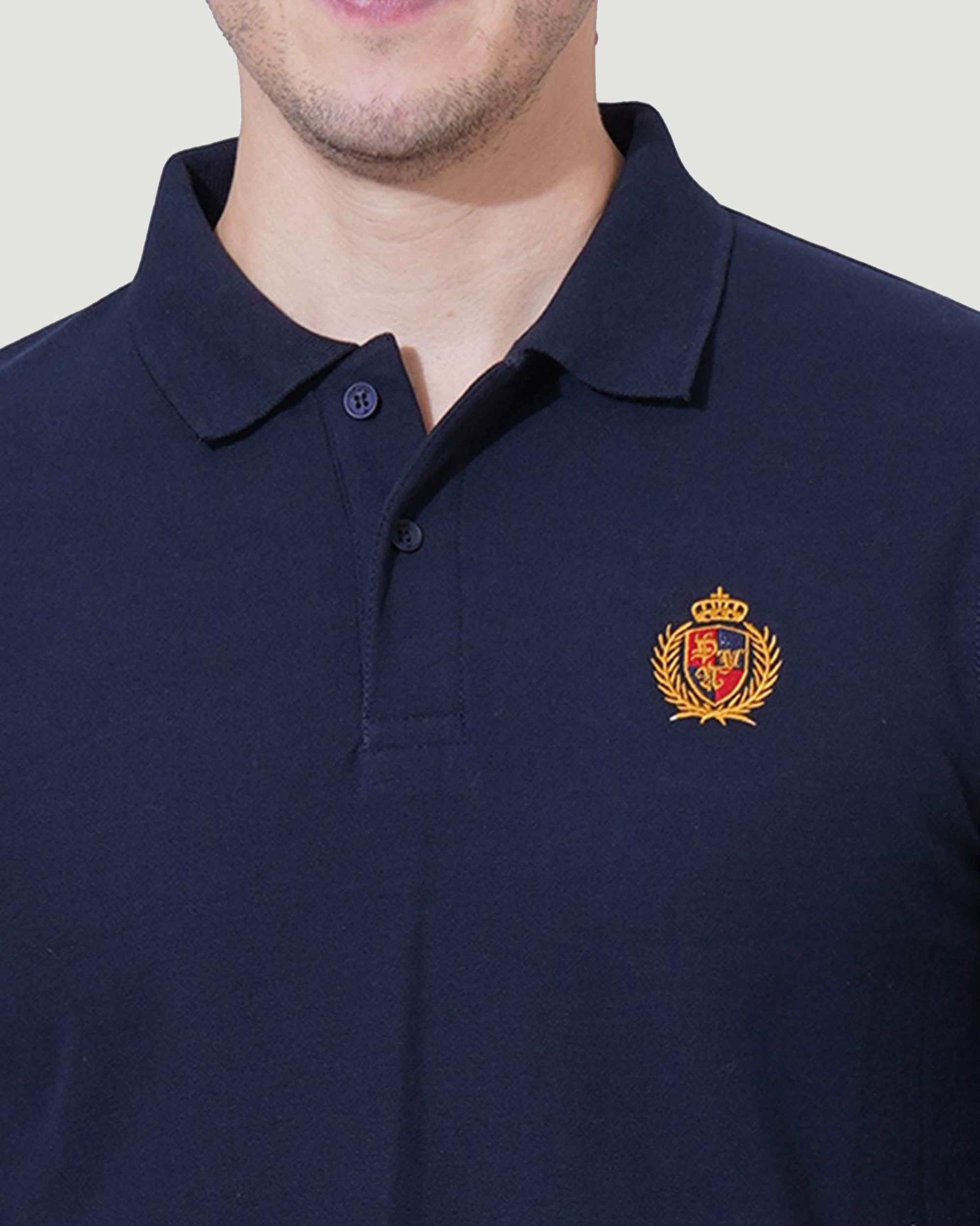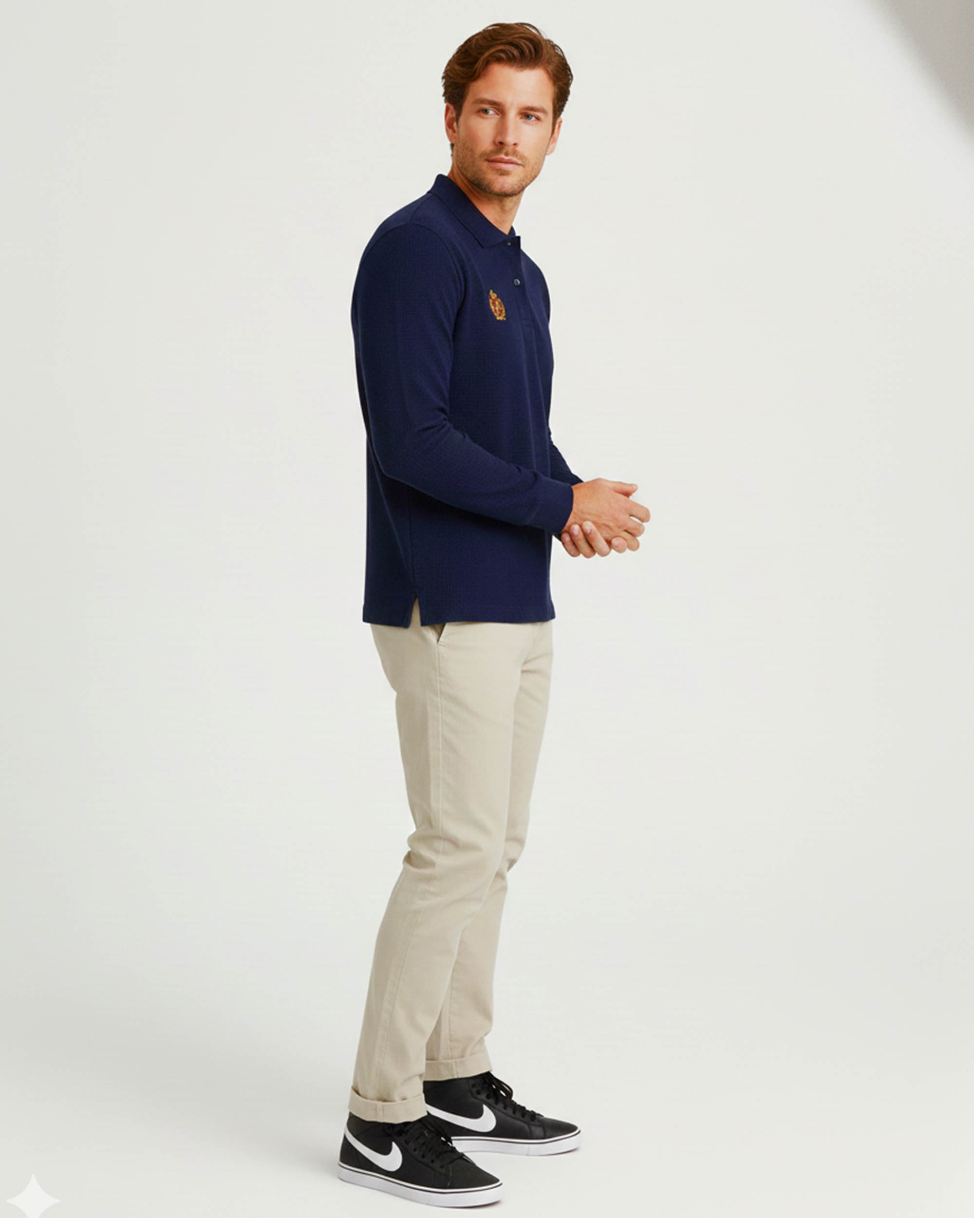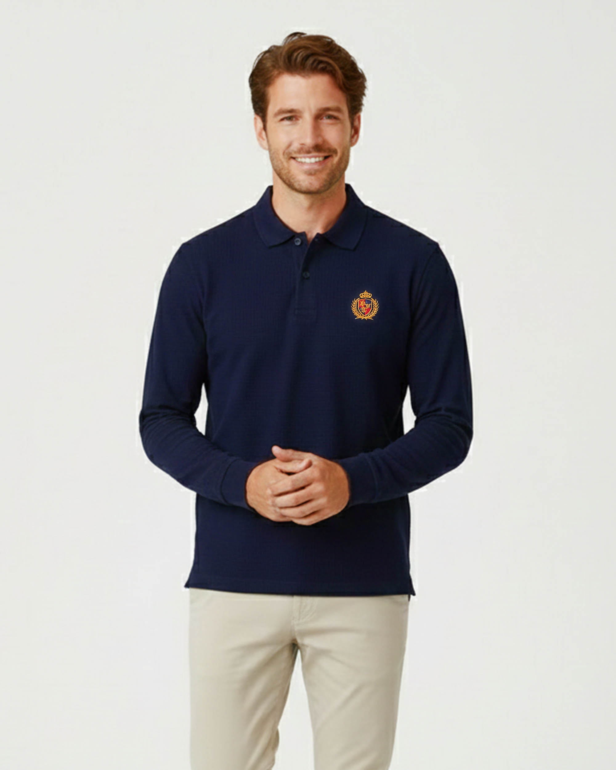 Upgrade your casual wardrobe with this stylish navy blue long sleeve polo t-shirt. Designed with a classic polo collar and button placket, this tee combines comfort and elegance effortlessly. The embroidered crest on the chest adds a touch of sophistication, making it perfect for both casual outings and semi-formal occasions.