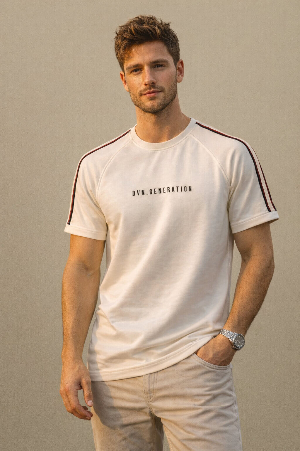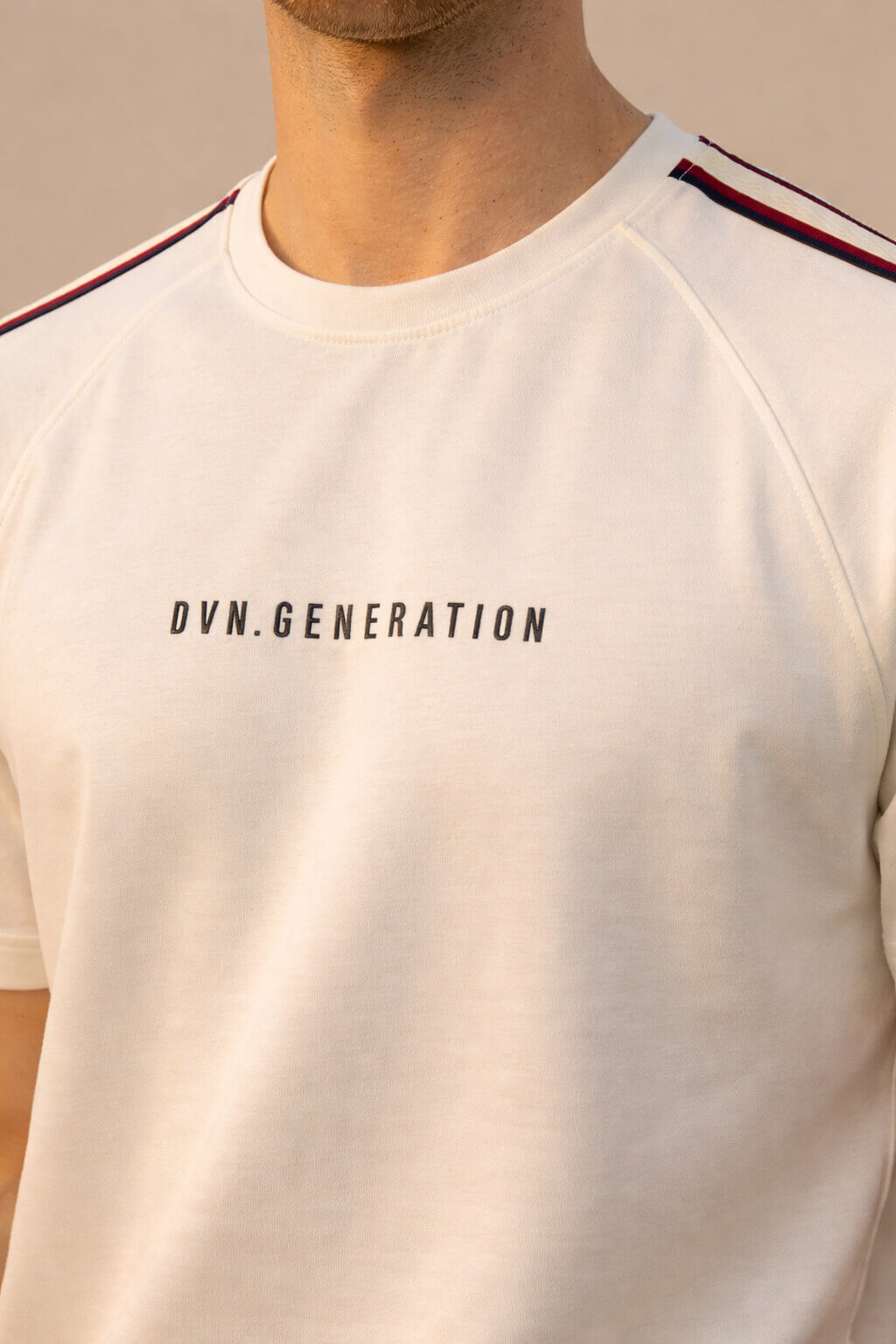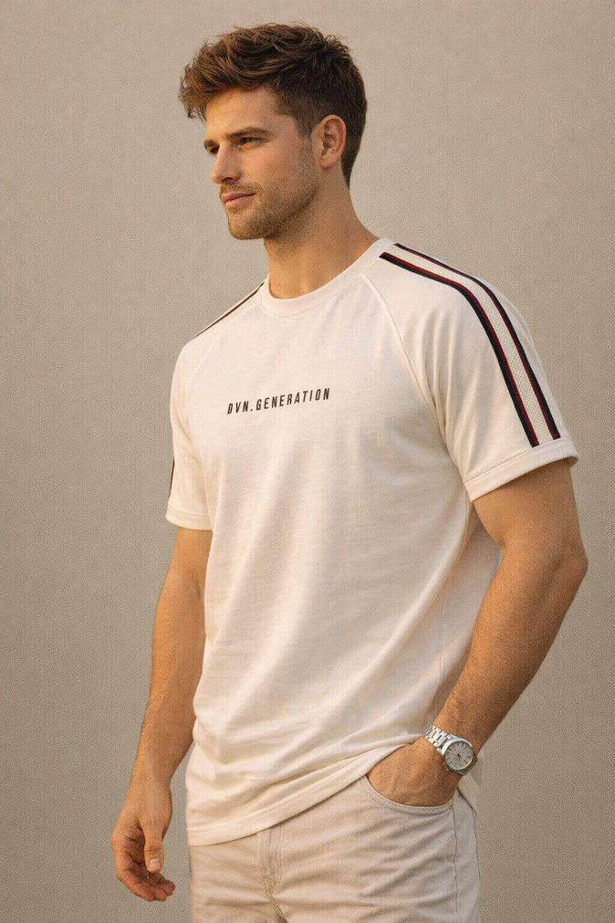 The front features a clean “DVN. GENERATION” typography print, adding a contemporary edge to the minimal design. The highlight of this T-shirt is the contrast stripe detailing on both sleeves, giving it a sporty and stylish finish. The raglan-style sleeve stitching enhances movement and comfort while maintaining a structured fit.