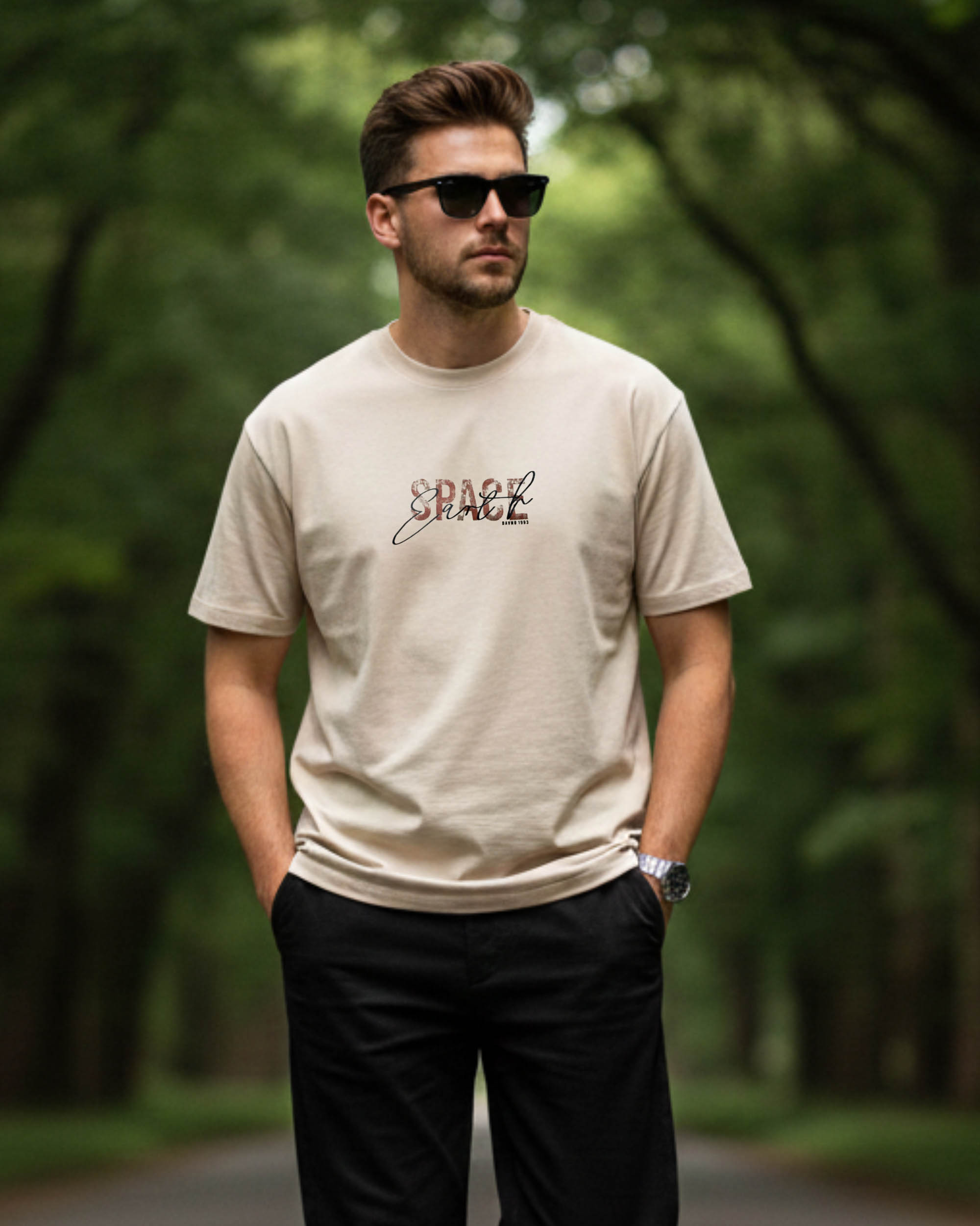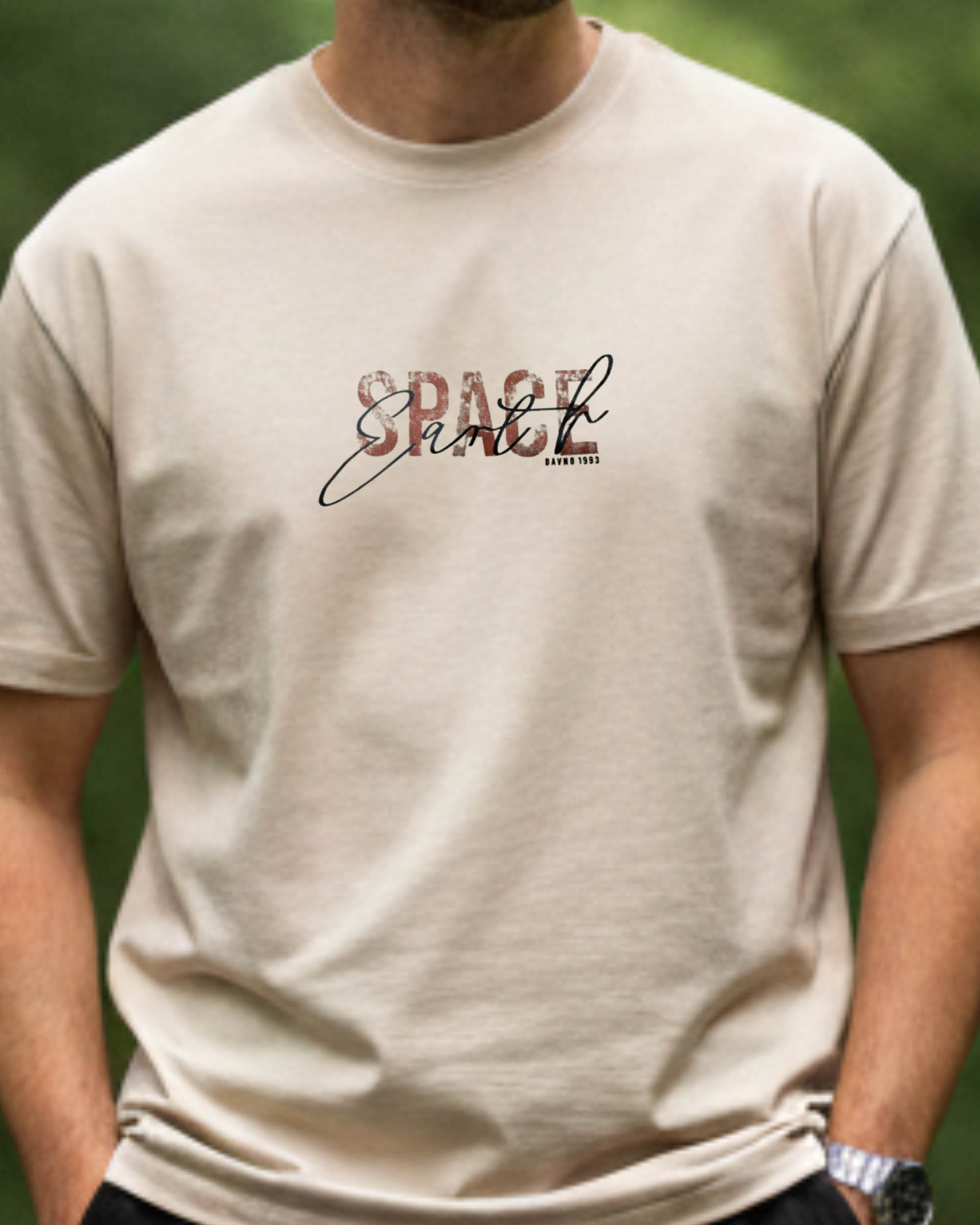 Upgrade your wardrobe with this Men’s Beige Graphic Printed T-Shirt, featuring a unique SPACE EARTH typography print that blends bold and handwritten text elements for a trendy look. The soft and breathable cotton fabric ensures superior comfort throughout the day.