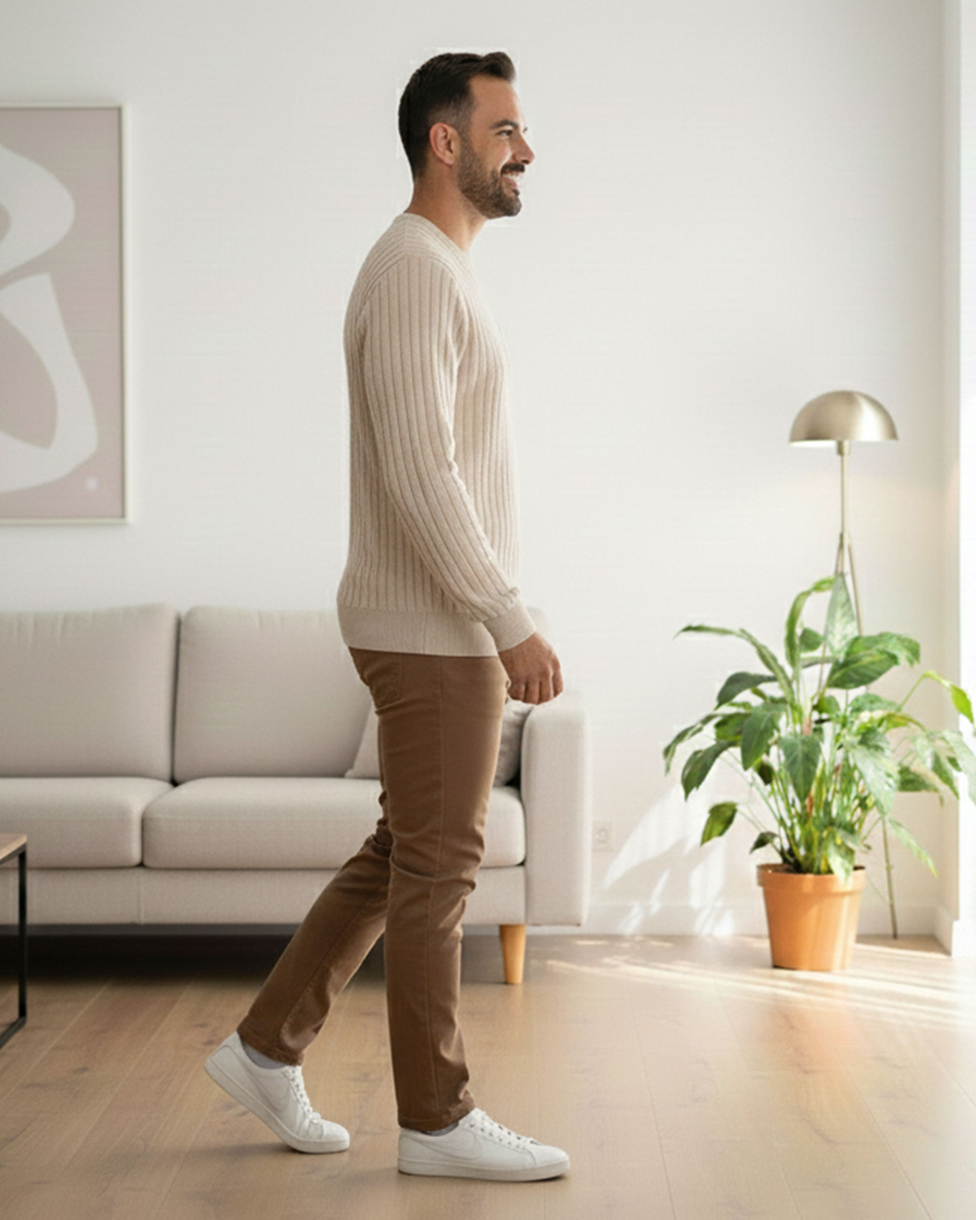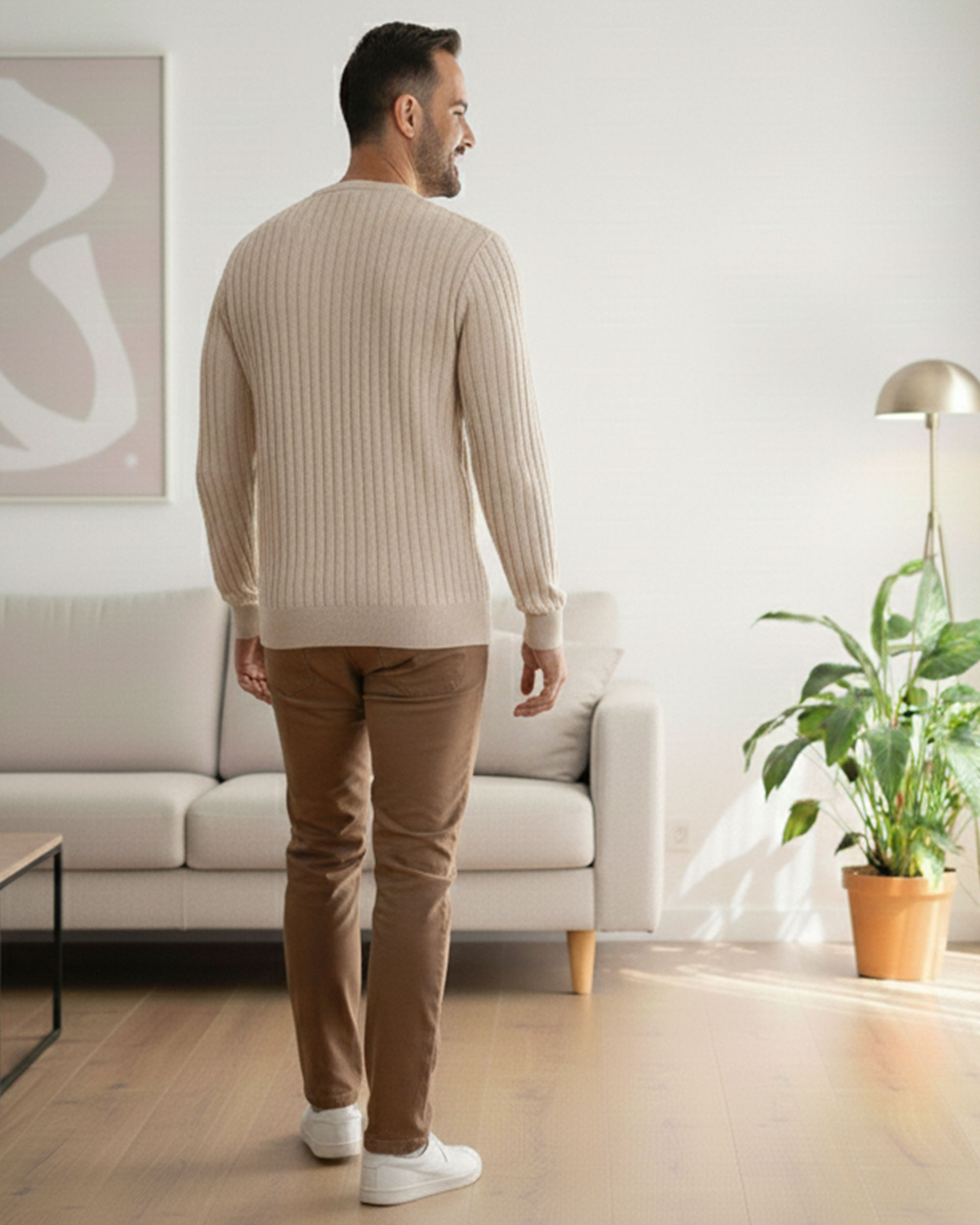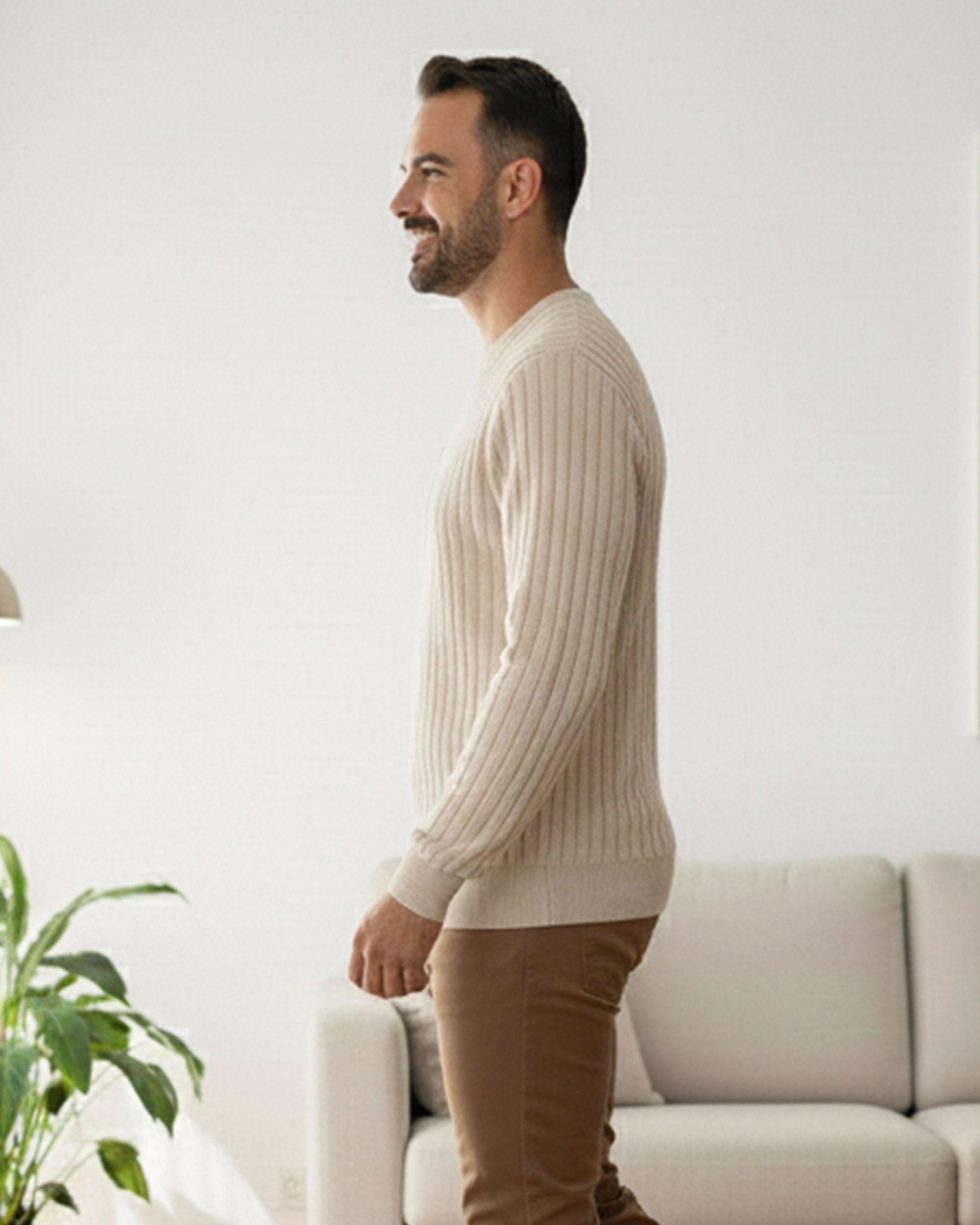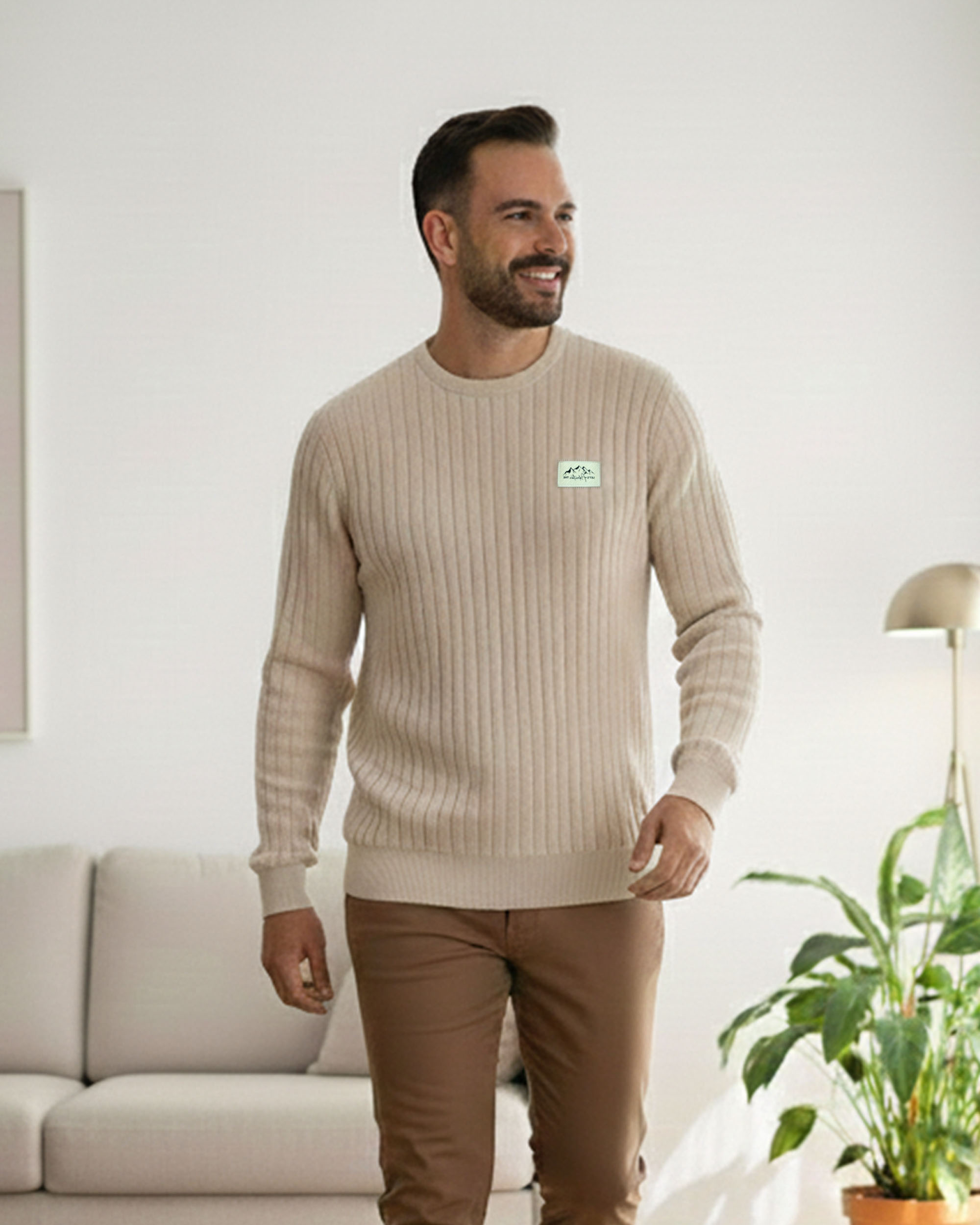 Refresh your smart-casual wardrobe with this elegant Men’s Beige Ribbed Sweater. Designed with a classic crew neck and vertical rib texture, this sweater delivers a refined, modern look while ensuring all-day comfort. Made from a soft, breathable fabric blend, it offers warmth without heaviness—perfect for mild winters, office wear, and evening outings.
