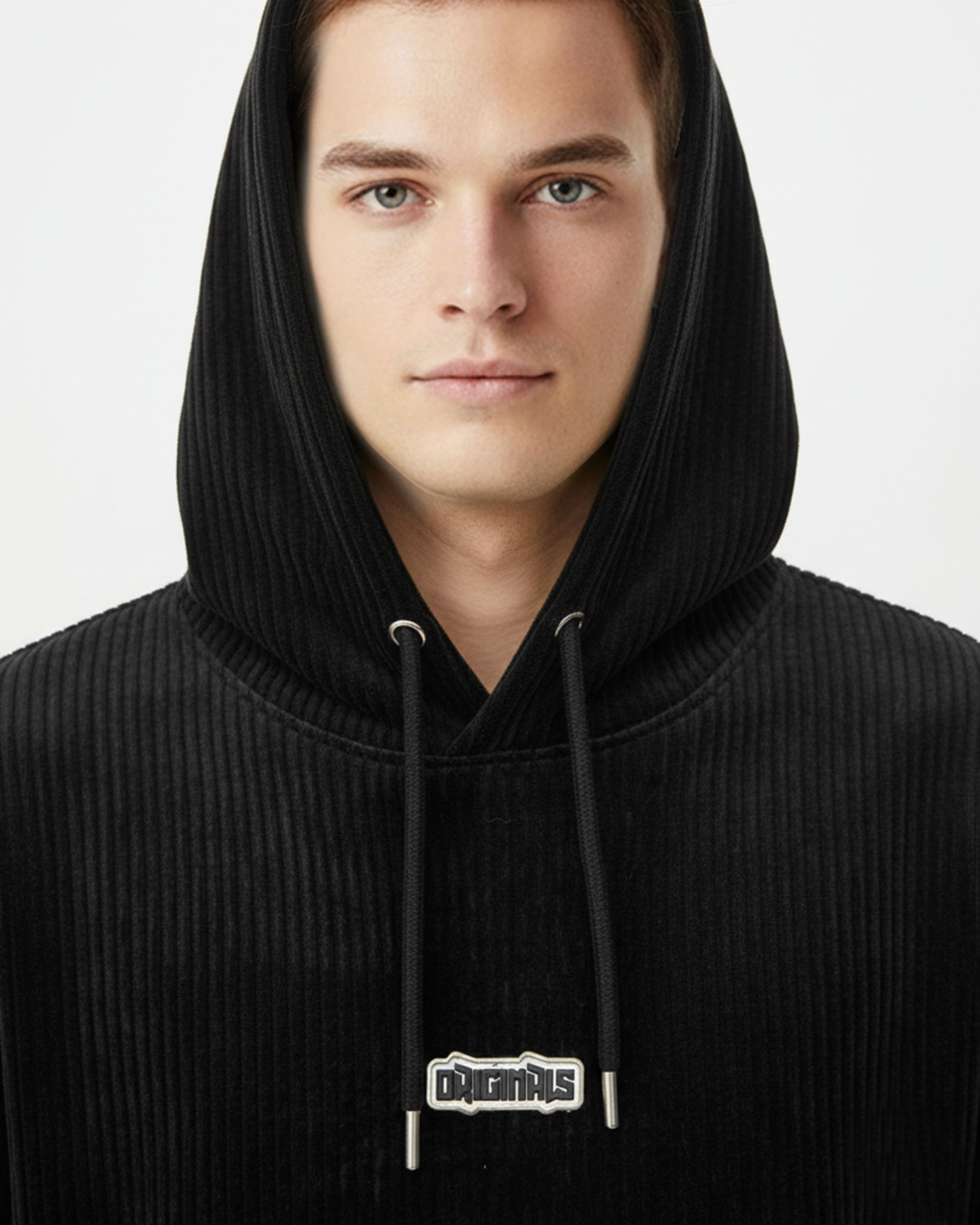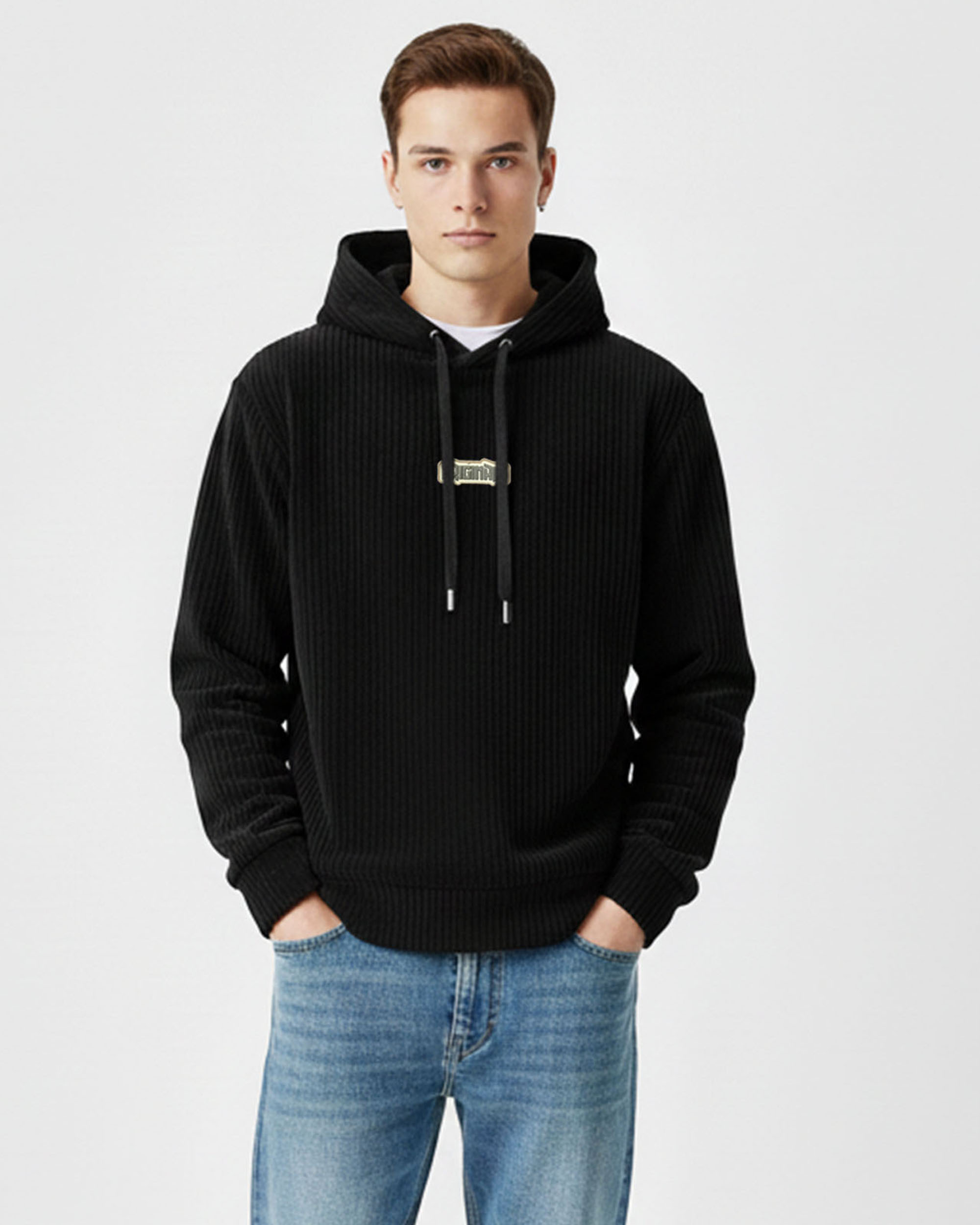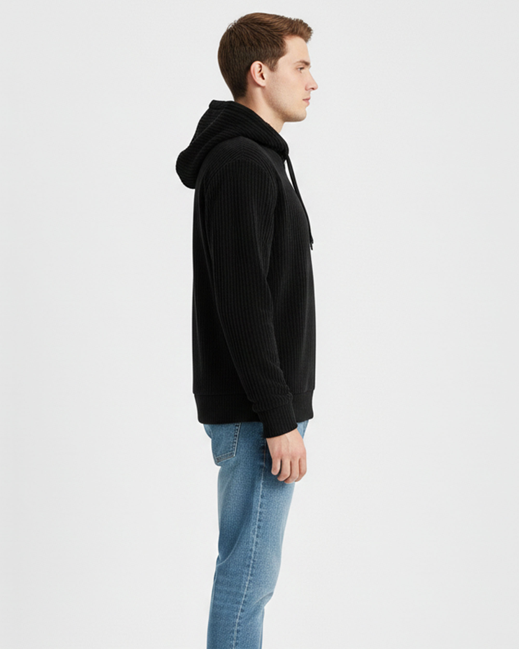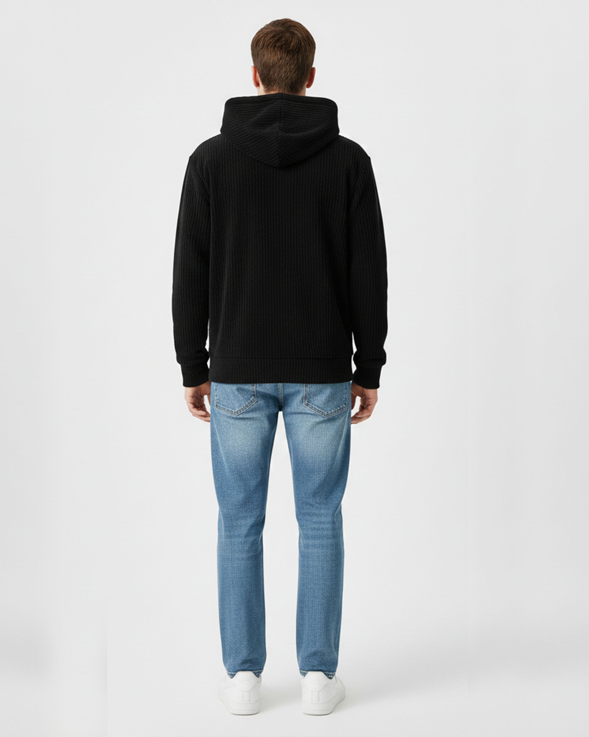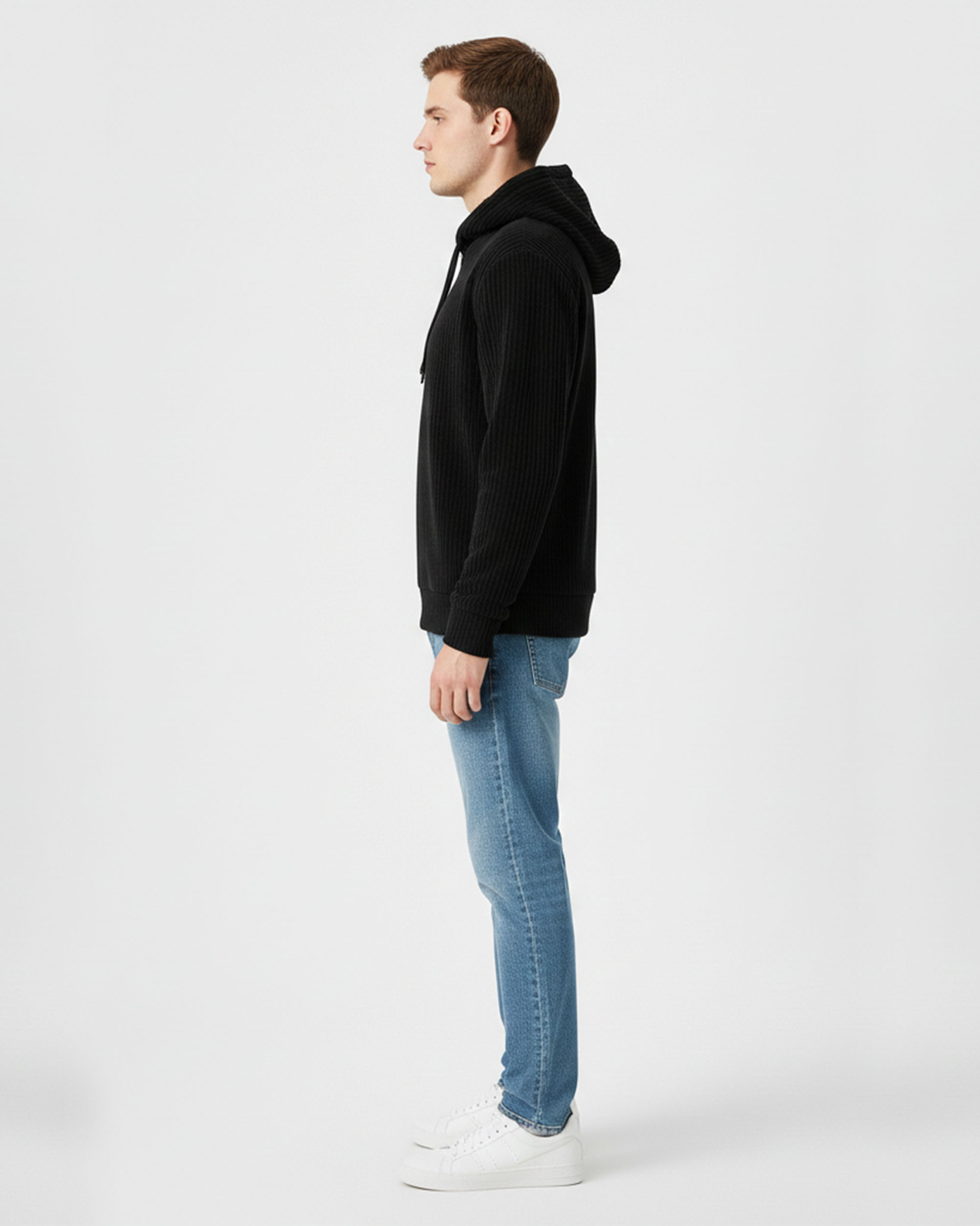 Upgrade your casual and winter wardrobe with this men’s solid black hooded sweatshirt, designed for everyday comfort and effortless style. Crafted with a ribbed textured fabric, this hoodie offers a modern look while ensuring warmth and breathability. The pullover design with an adjustable hood makes it perfect for casual outings, travel, or relaxed evenings.
