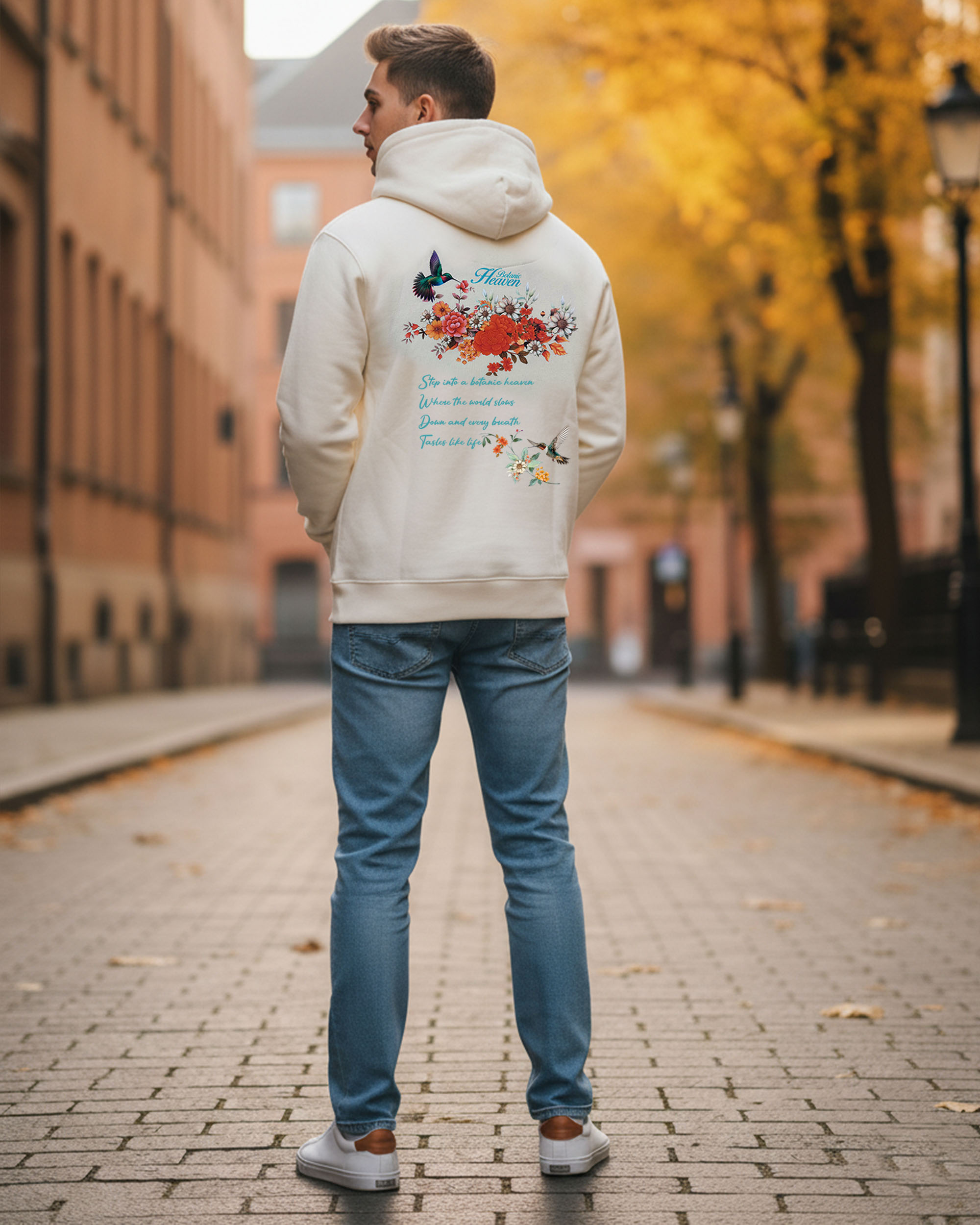 Stay warm and stylish this winter with our men’s premium floral printed hoodie. Crafted from soft fleece fabric, this sweatshirt offers superior comfort and insulation during cold weather. The trendy design features a clean front logo and an elegant multi colour floral + bird graphic on the back, adding a modern fashion-forward appeal.