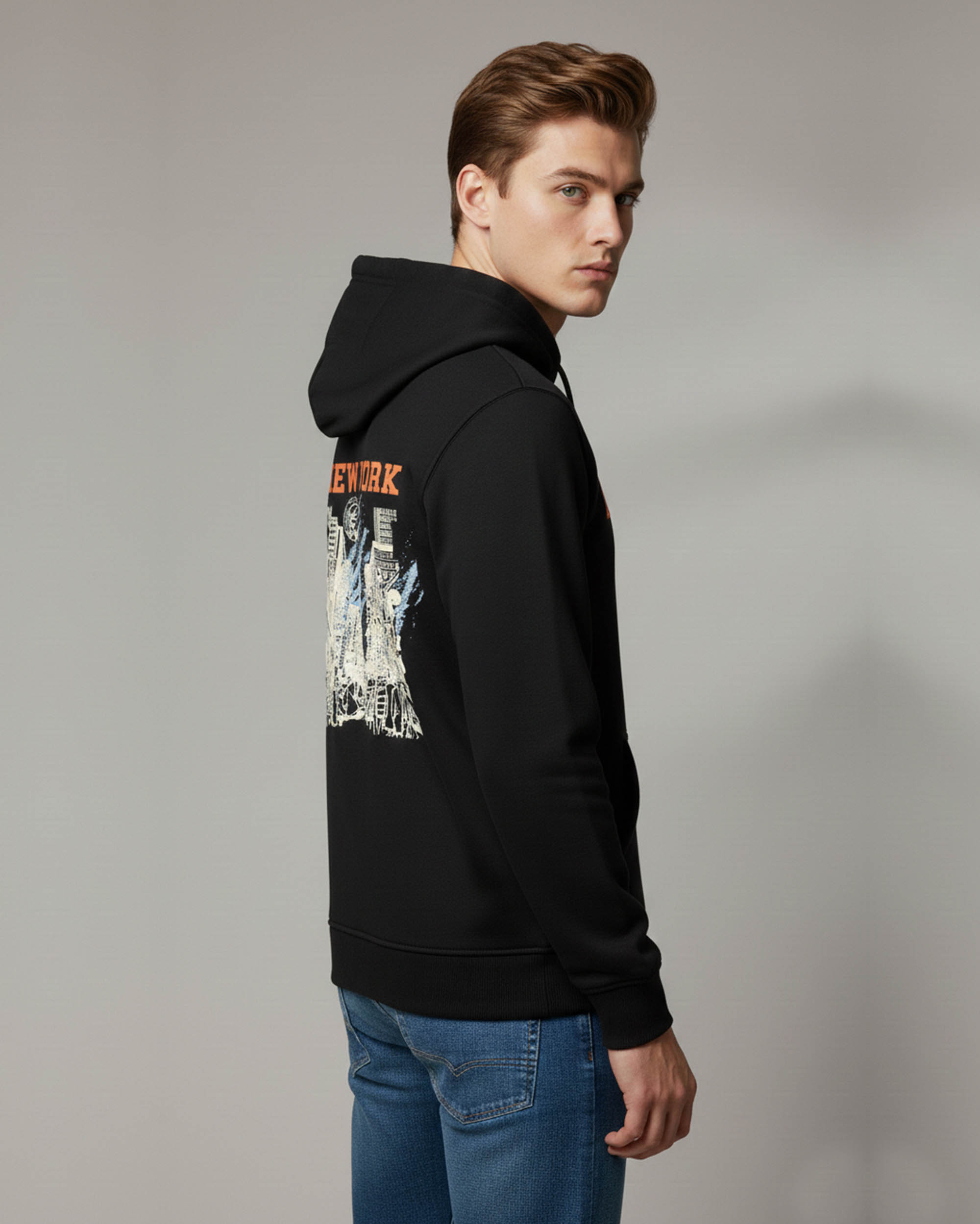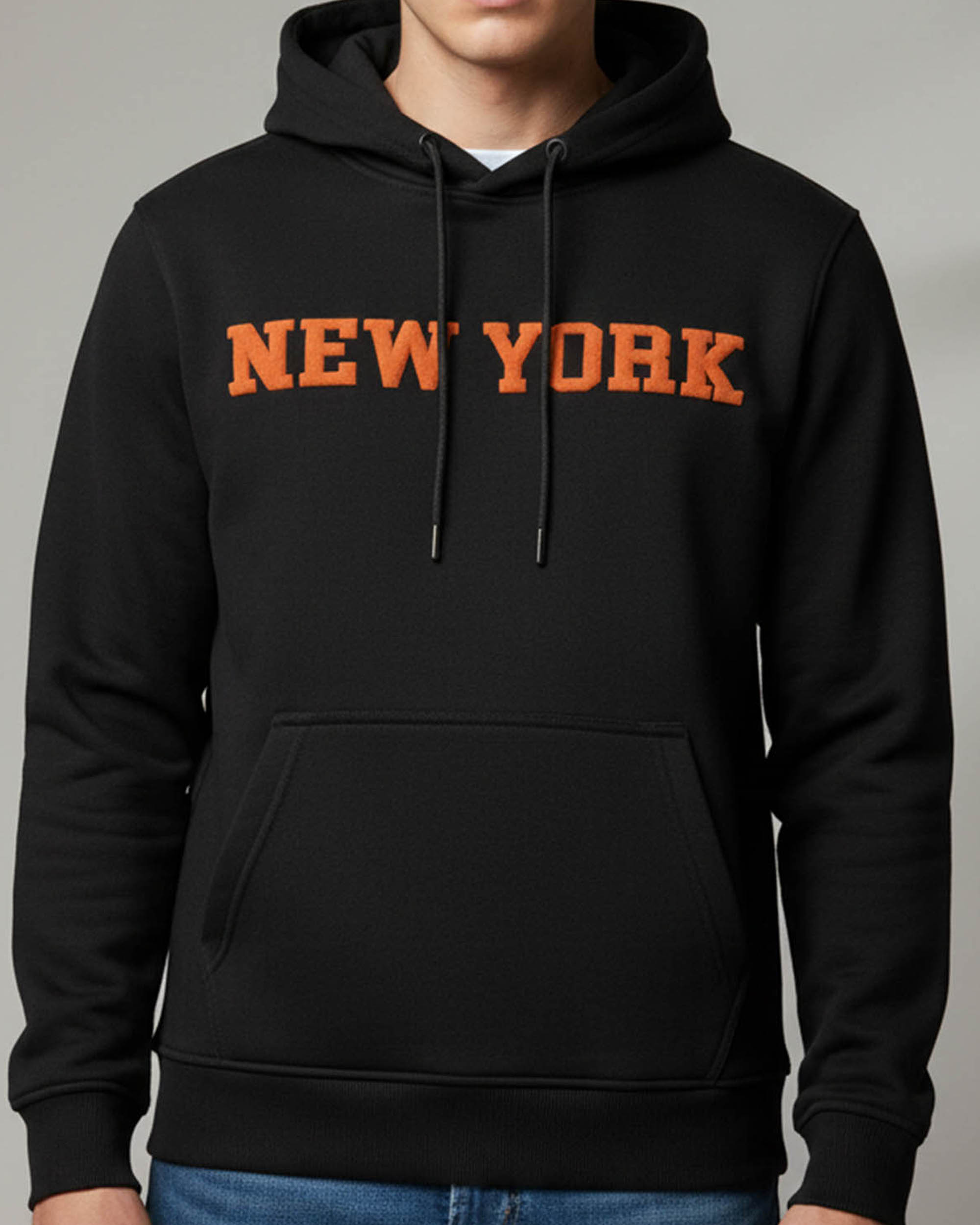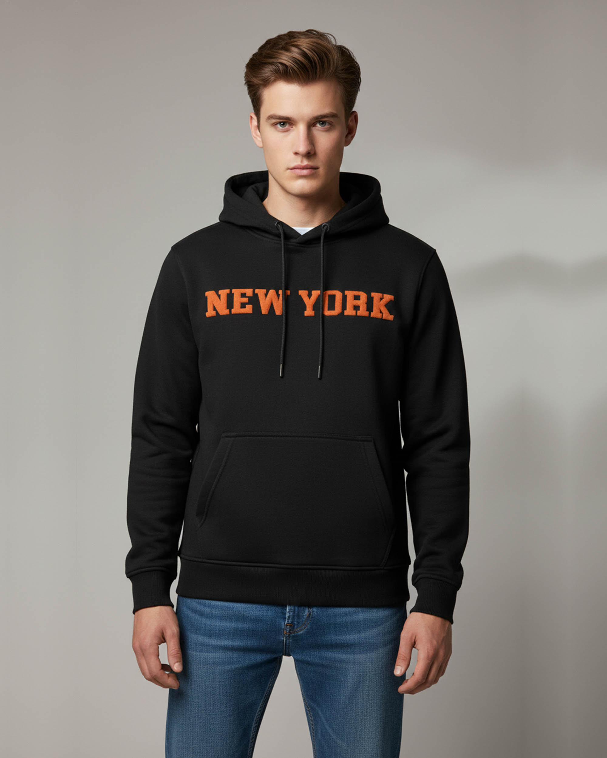 Stay stylish and comfortable with this Men’s Black Printed Hooded Sweatshirt featuring a bold “NEW YORK” chest print. Crafted from a soft cotton-blend fabric, this hoodie offers warmth without heaviness. The adjustable drawstring hood and kangaroo pocket add functionality, making it perfect for winter wear, casual outings, travel, or streetwear looks. Pair it with jeans or joggers for an effortless urban style.