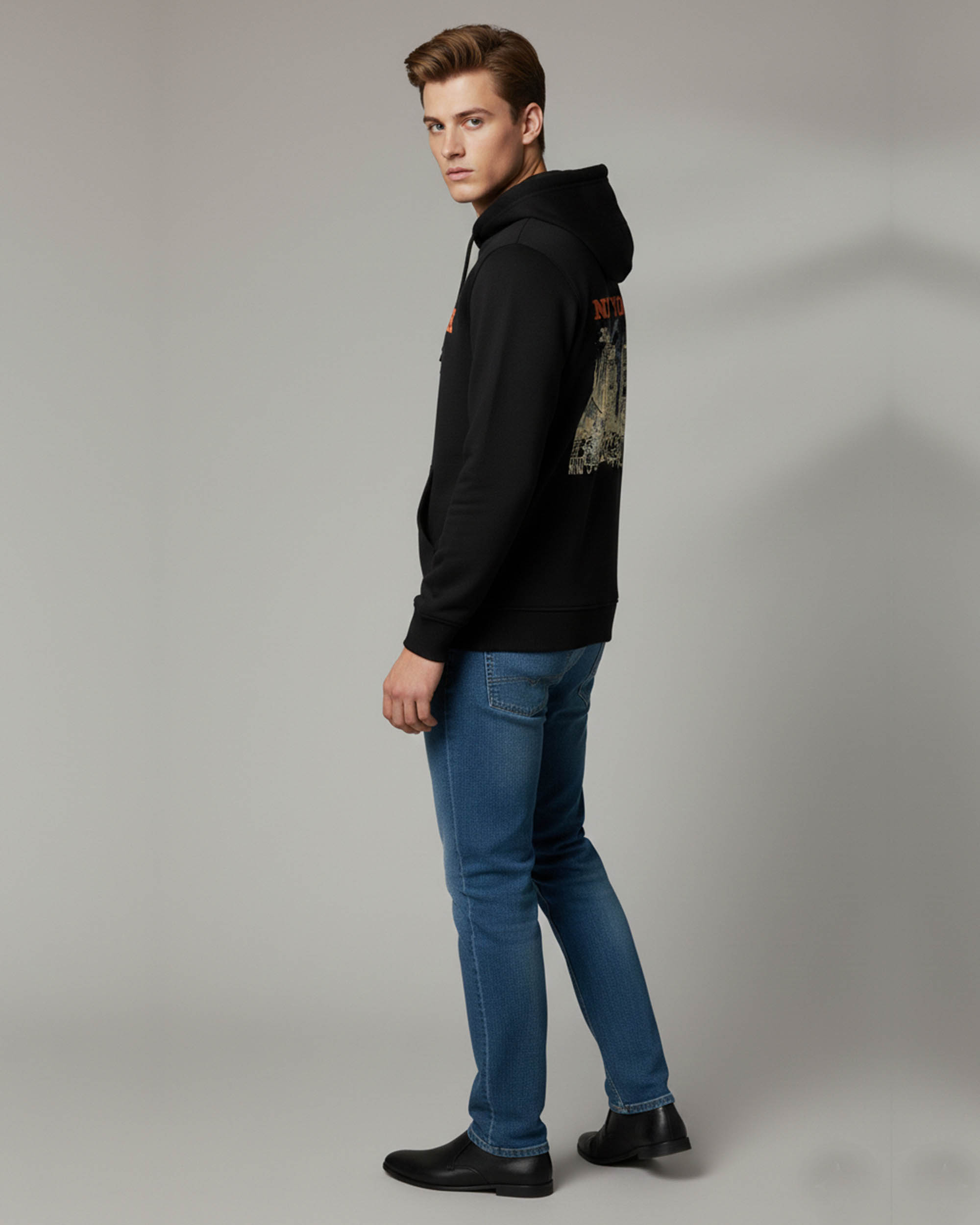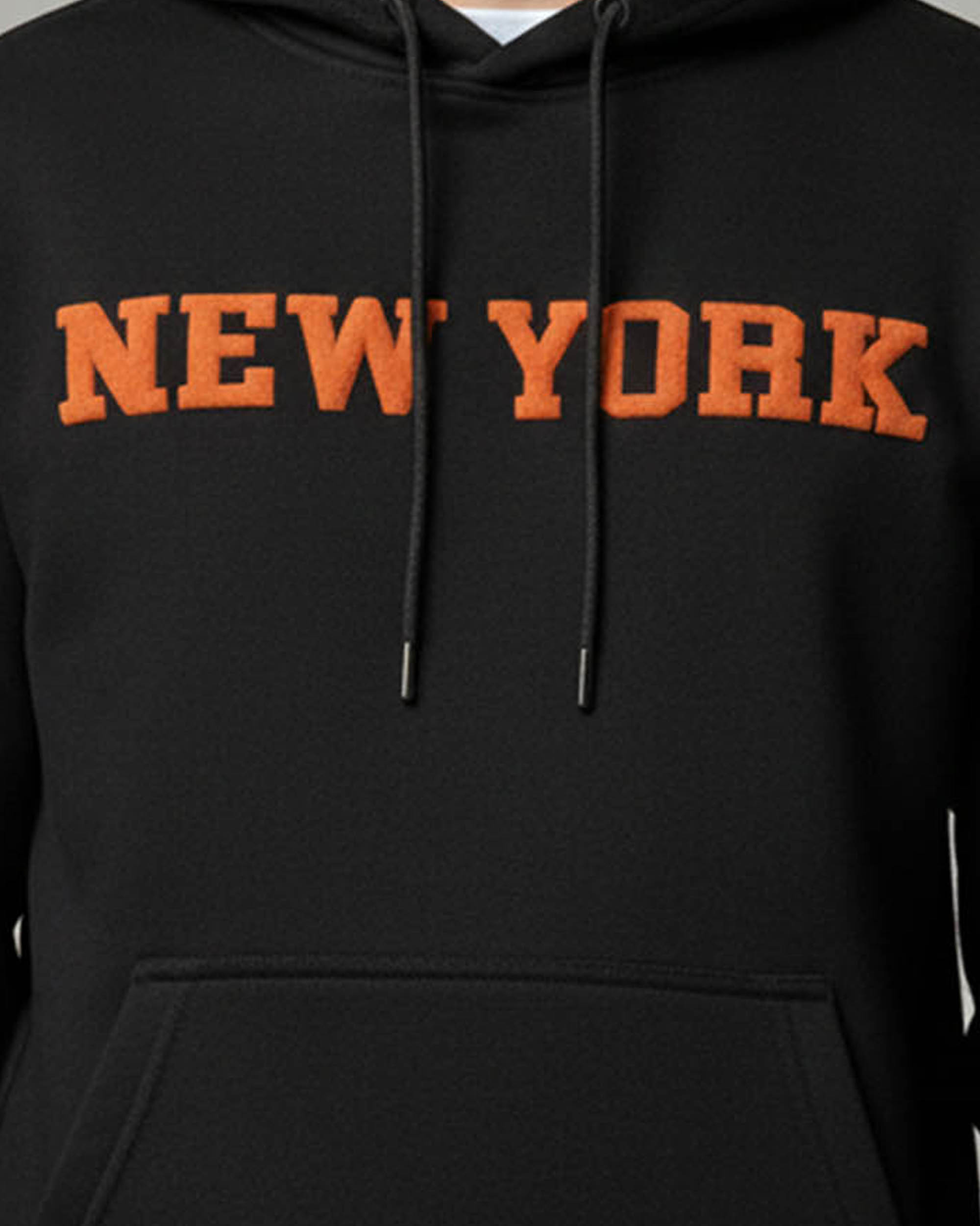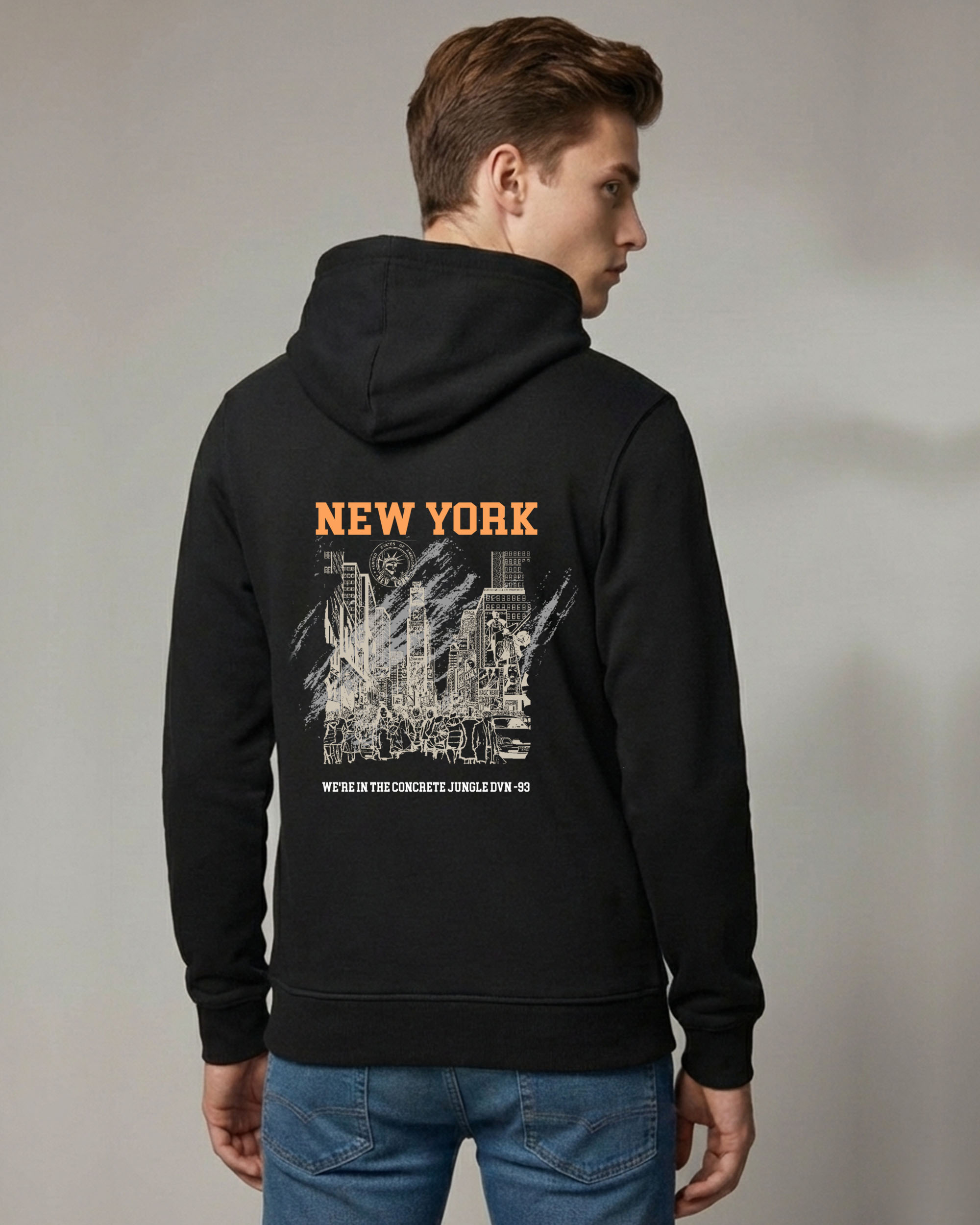 Stay stylish and comfortable with this Men’s Black Printed Hooded Sweatshirt featuring a bold “NEW YORK” chest print. Crafted from a soft cotton-blend fabric, this hoodie offers warmth without heaviness. The adjustable drawstring hood and kangaroo pocket add functionality, making it perfect for winter wear, casual outings, travel, or streetwear looks. Pair it with jeans or joggers for an effortless urban style.