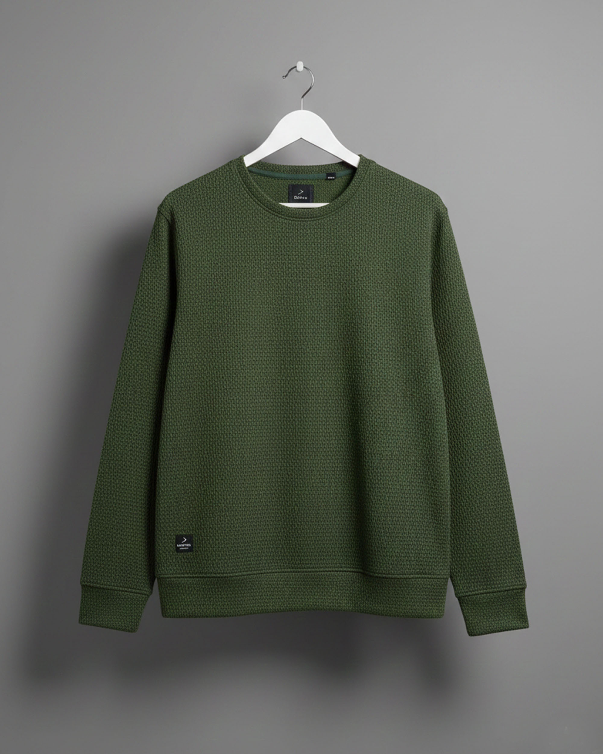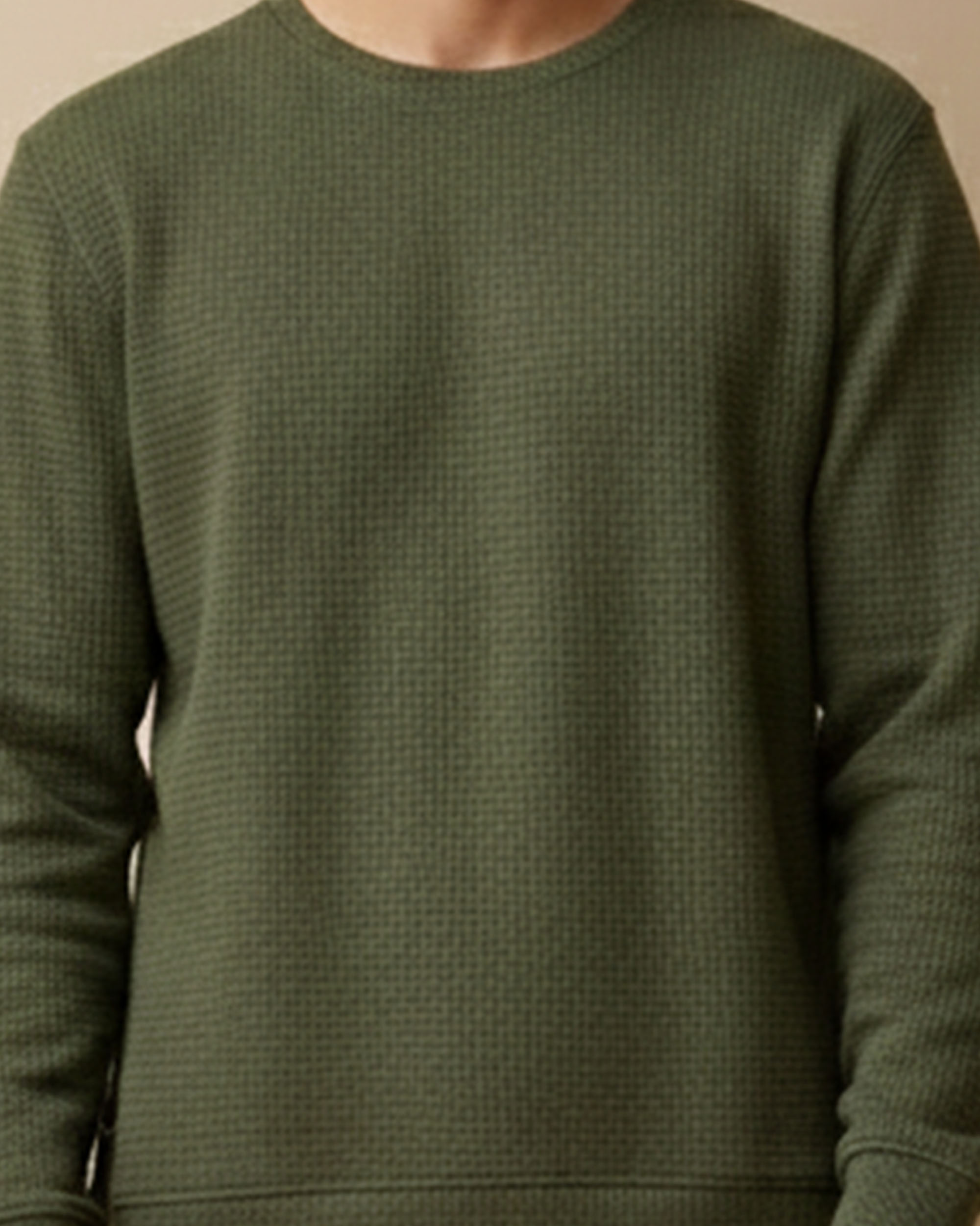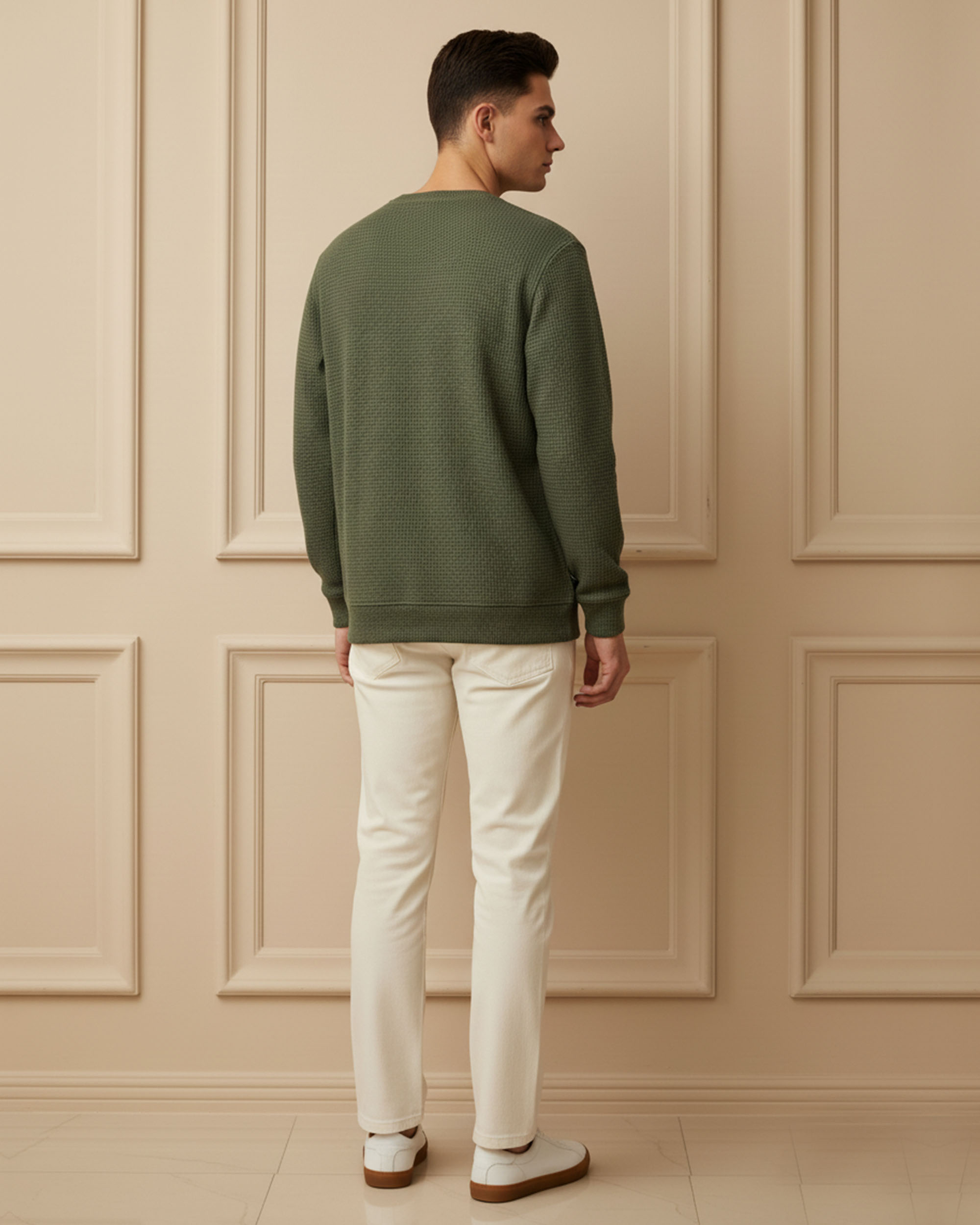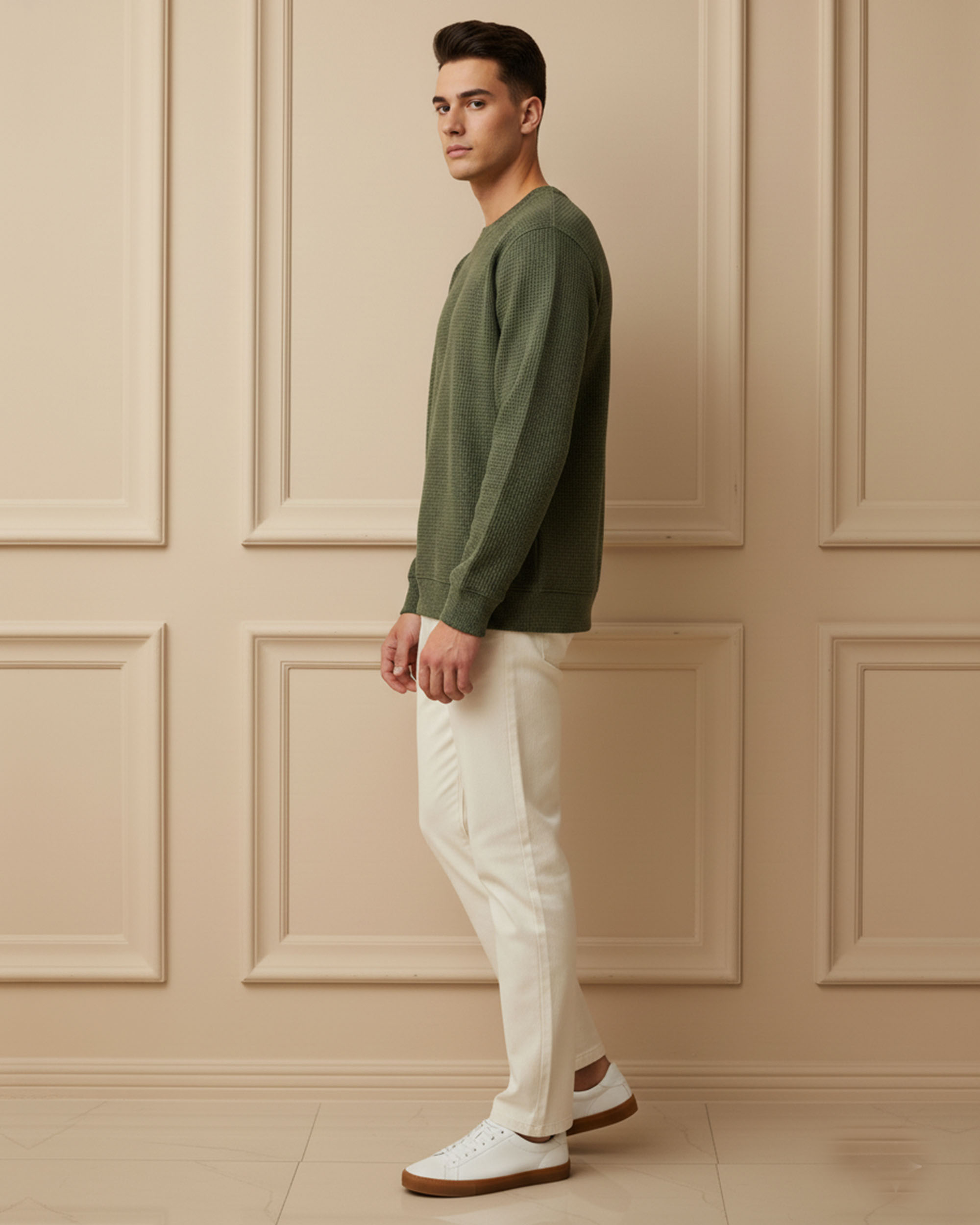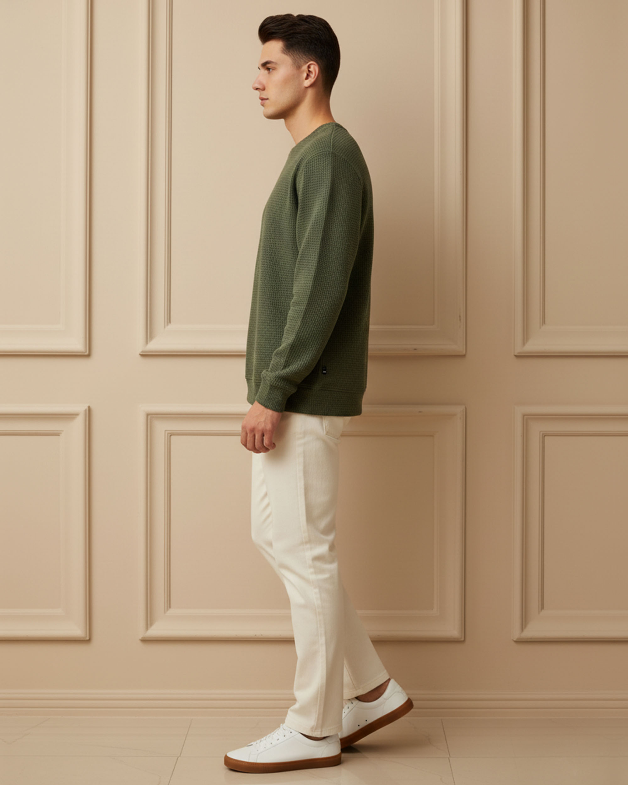 Upgrade your winter wardrobe with this Premium Olive Green Round-Neck Sweatshirt for Men, designed for everyday comfort and style. Made from a high-quality cotton blend with a soft waffle-knit texture, it gives superior warmth without feeling heavy. The sweatshirt comes in a modern slim-fit profile, ribbed cuffs and hem, making it perfect for casual outings, college wear, travel, gym warm-ups, or cozy daily wear.