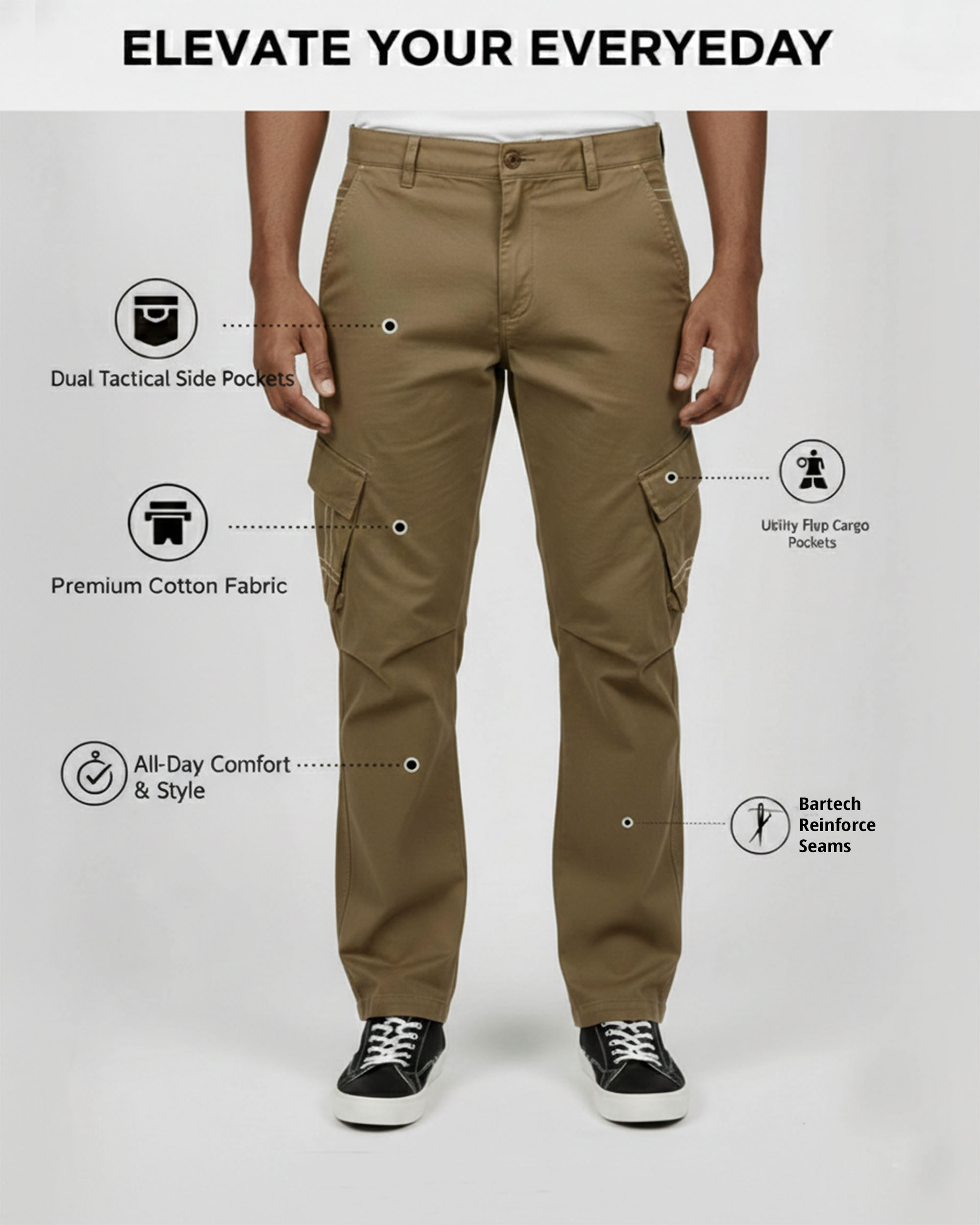 Step into comfort and functionality with these Men’s Dark Khaki Cargo Pants, designed for modern lifestyles. Made from premium-quality cotton fabric, these trousers offer a soft touch, excellent breathability, and long-lasting durability for everyday use. Perfect for casual outings, travel, office wear, or outdoor activities, the versatile dark khaki shade pairs effortlessly with t-shirts, polos, or shirts for a smart-casual look. Whether you're on the move or relaxing, these cargo pants keep you looking stylish all day.