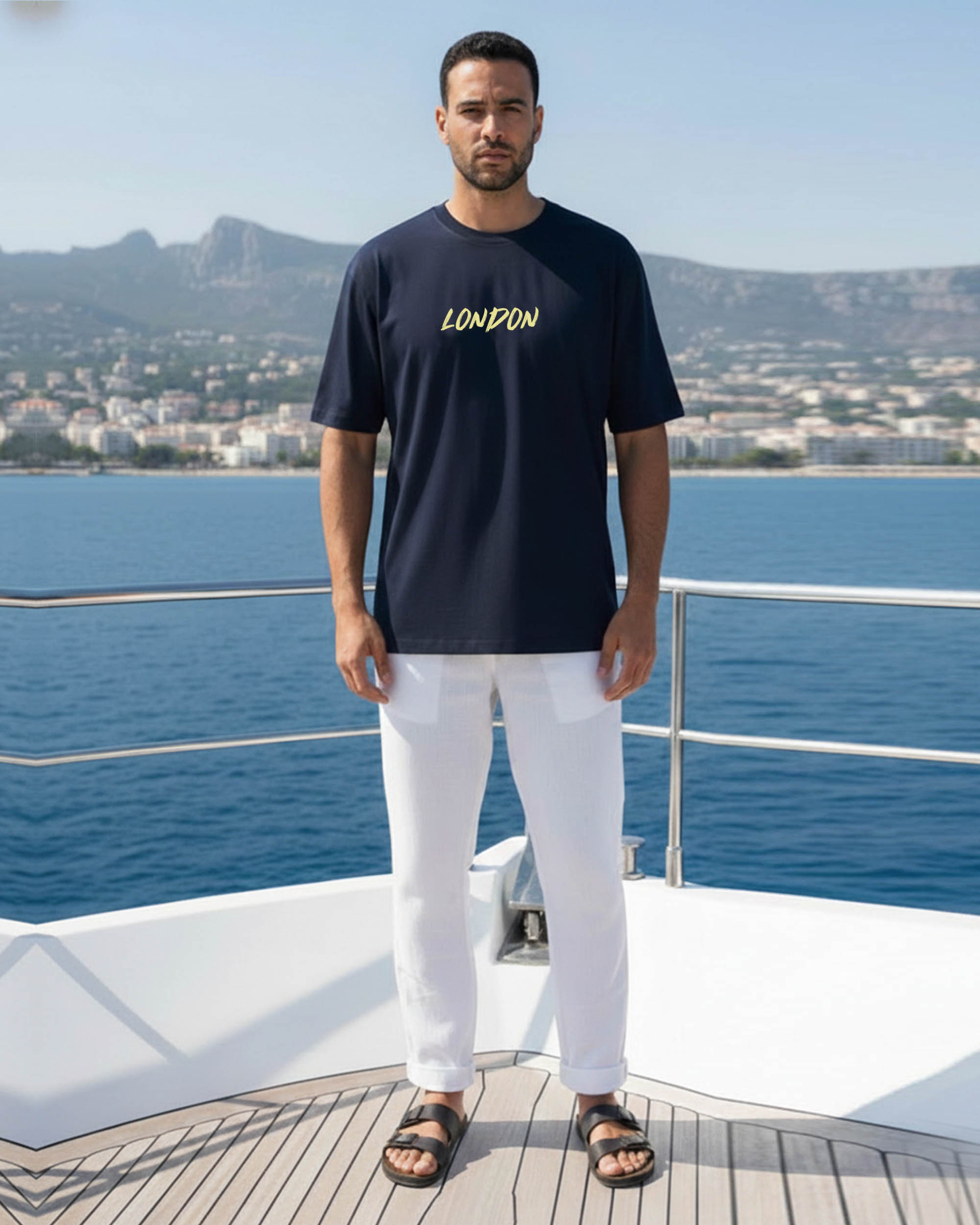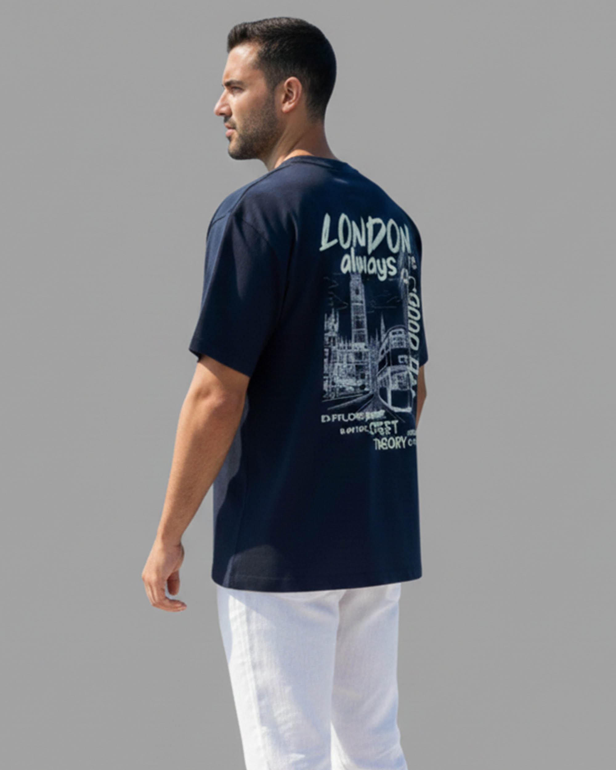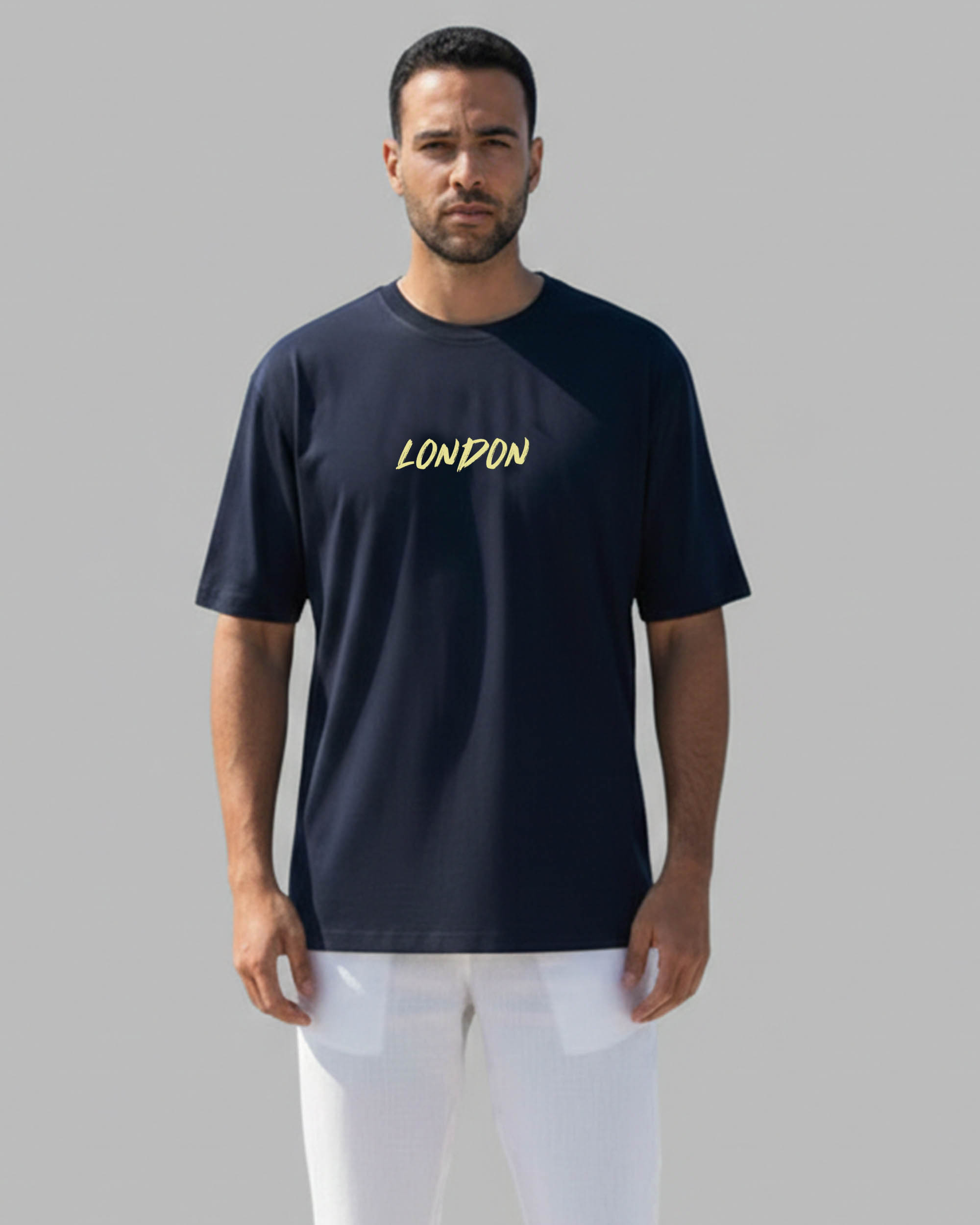 Refresh your wardrobe with this navy blue oversized T-shirt featuring a bold “London” typography print that captures modern urban style. Crafted from a premium cotton blend, this tee delivers exceptional softness and breathability to keep you comfortable throughout the day.