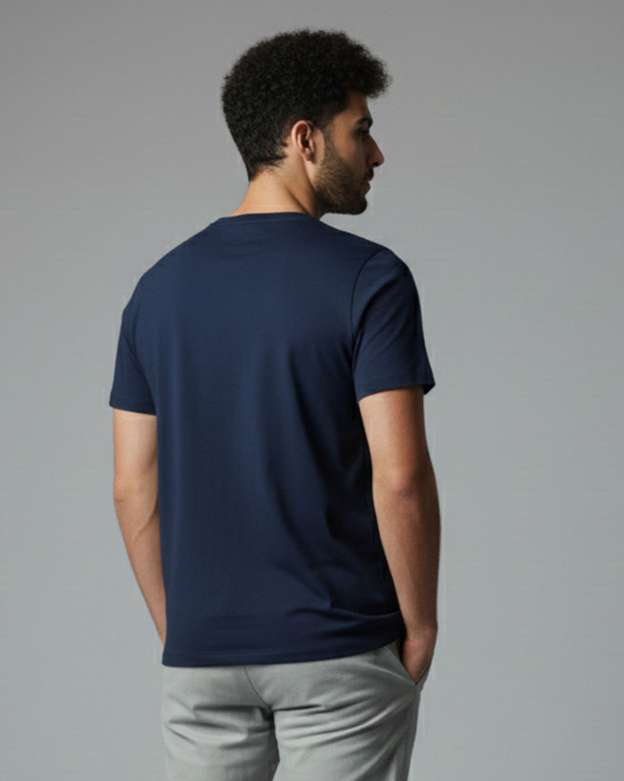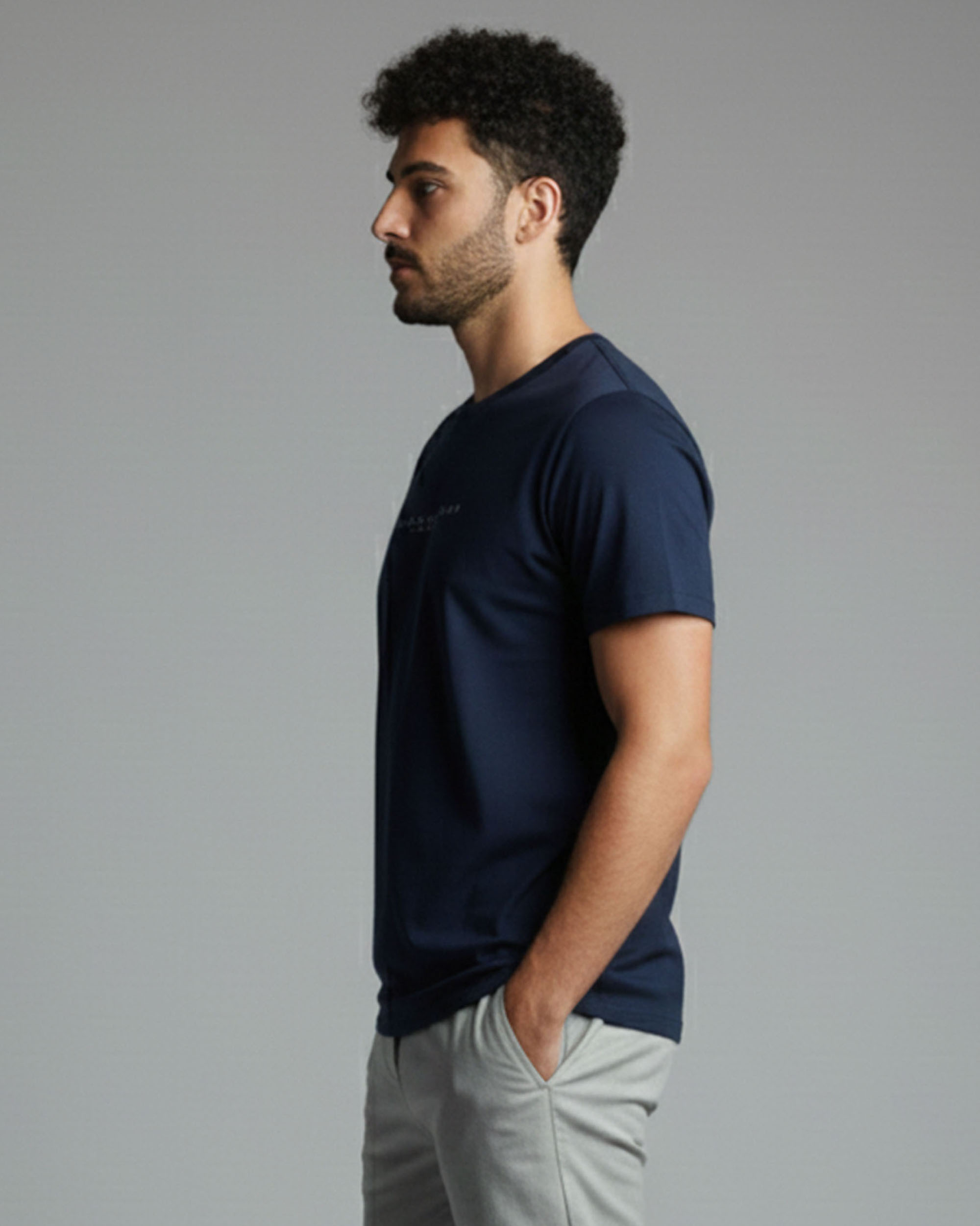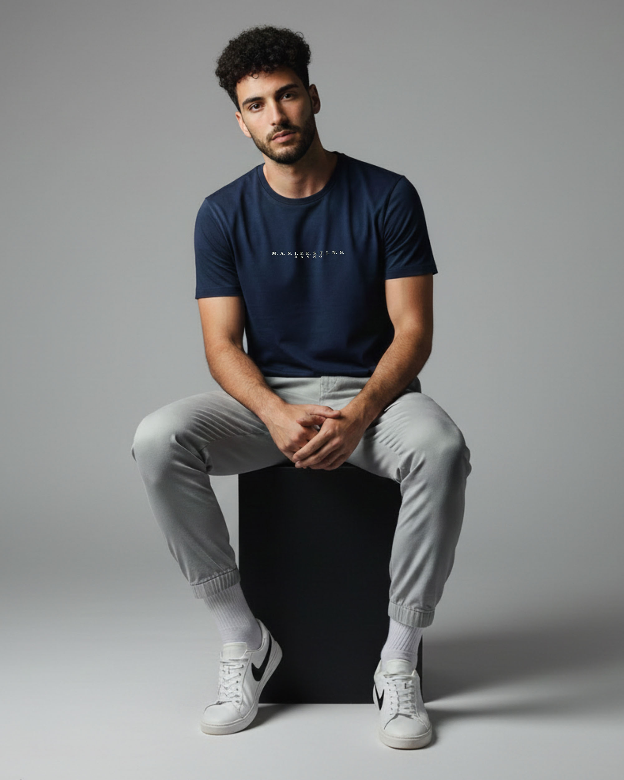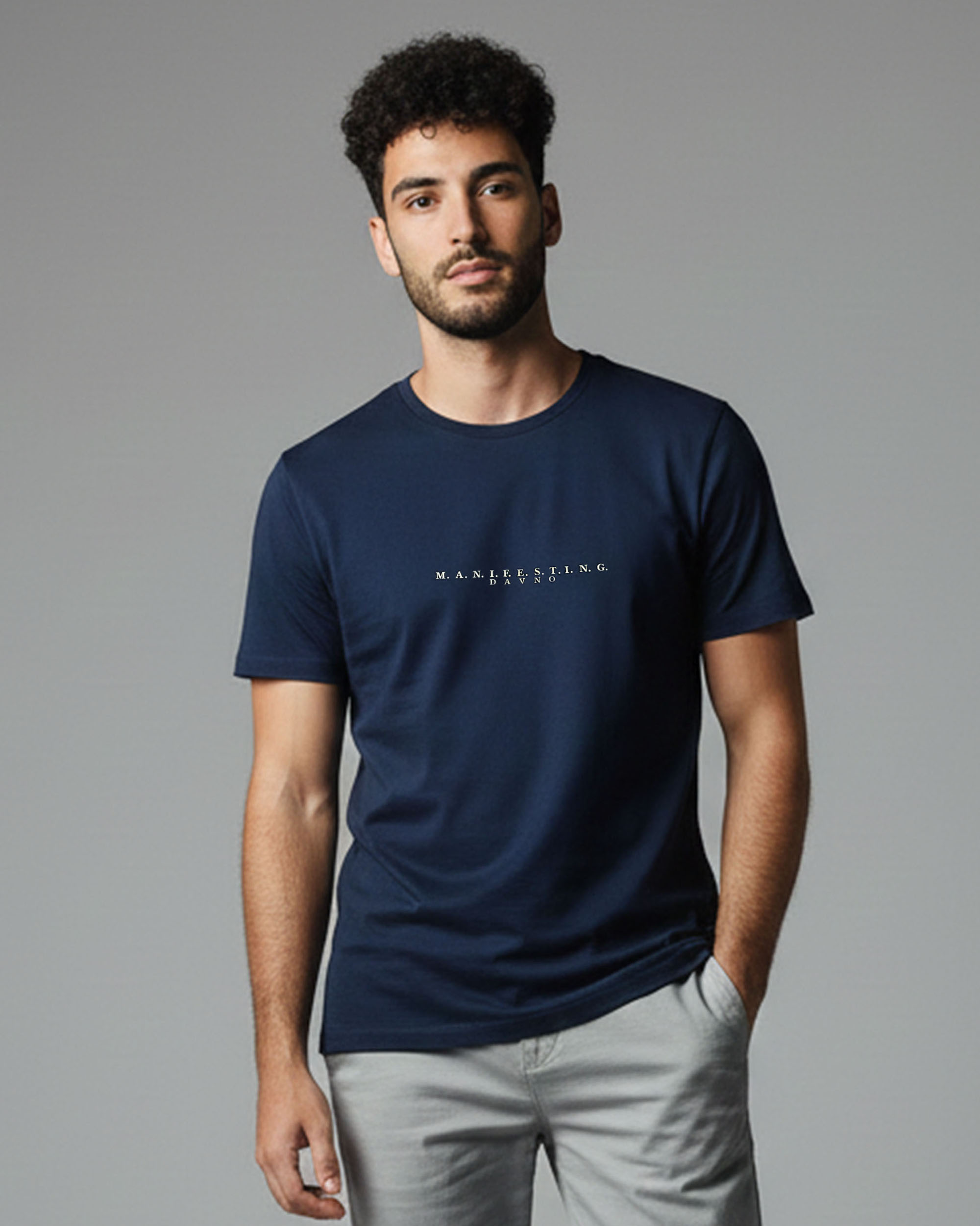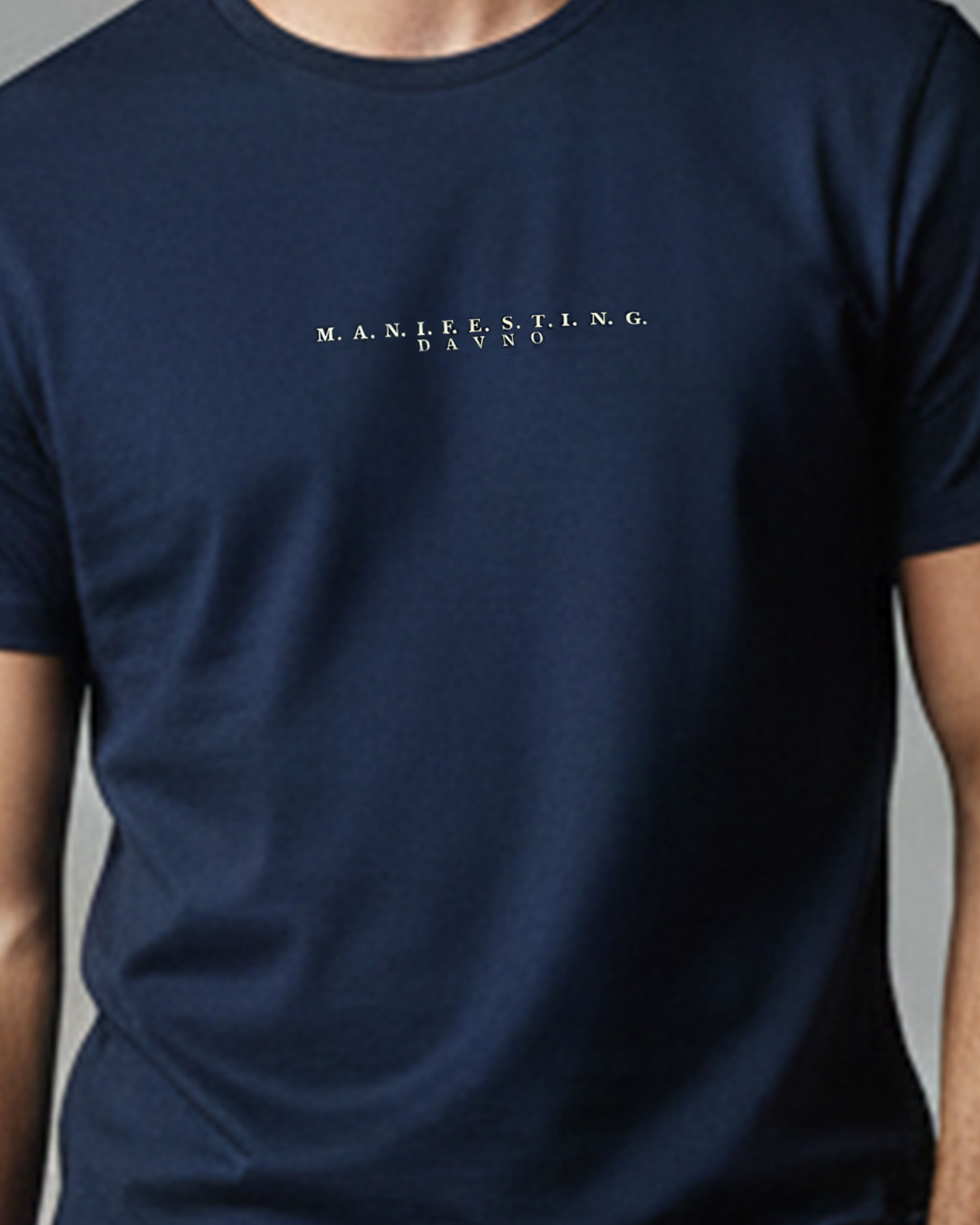 A stylish navy blue T-shirt for men made from soft, breathable cotton fabric. Designed with a clean round neck, comfortable regular fit, and minimal chest print reading “Manifesting Dawn”. Perfect for casual outings, daily wear, or street-style fashion.