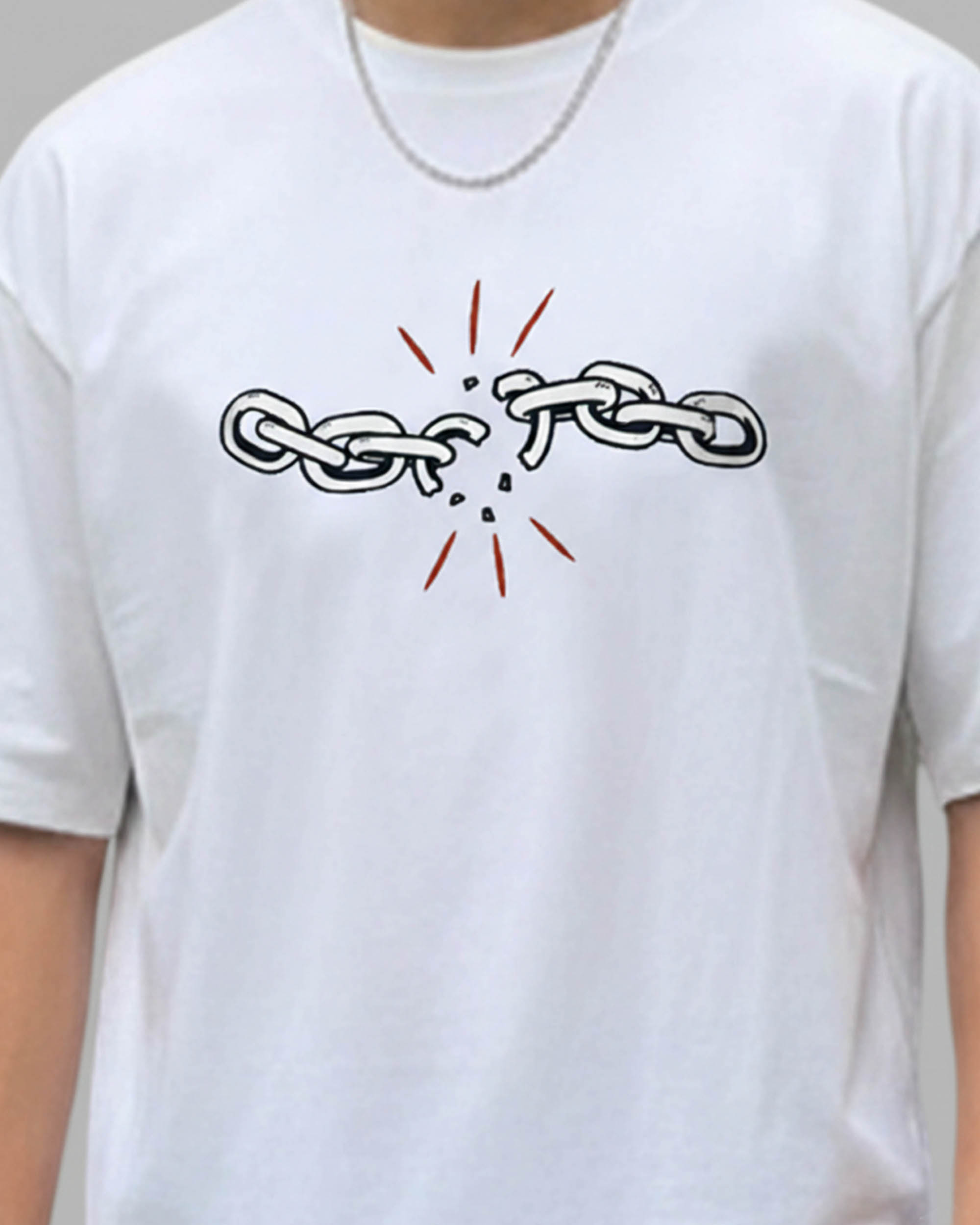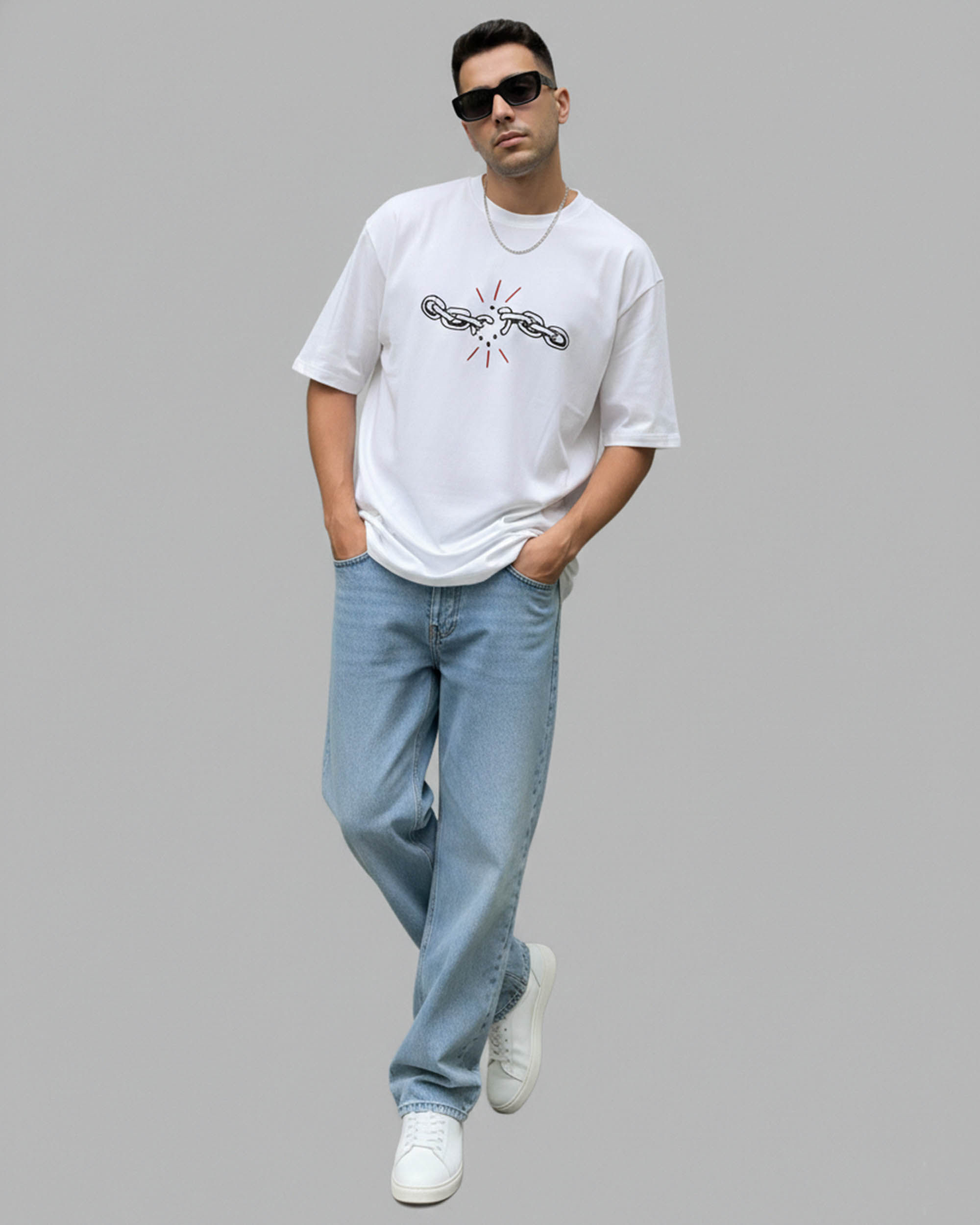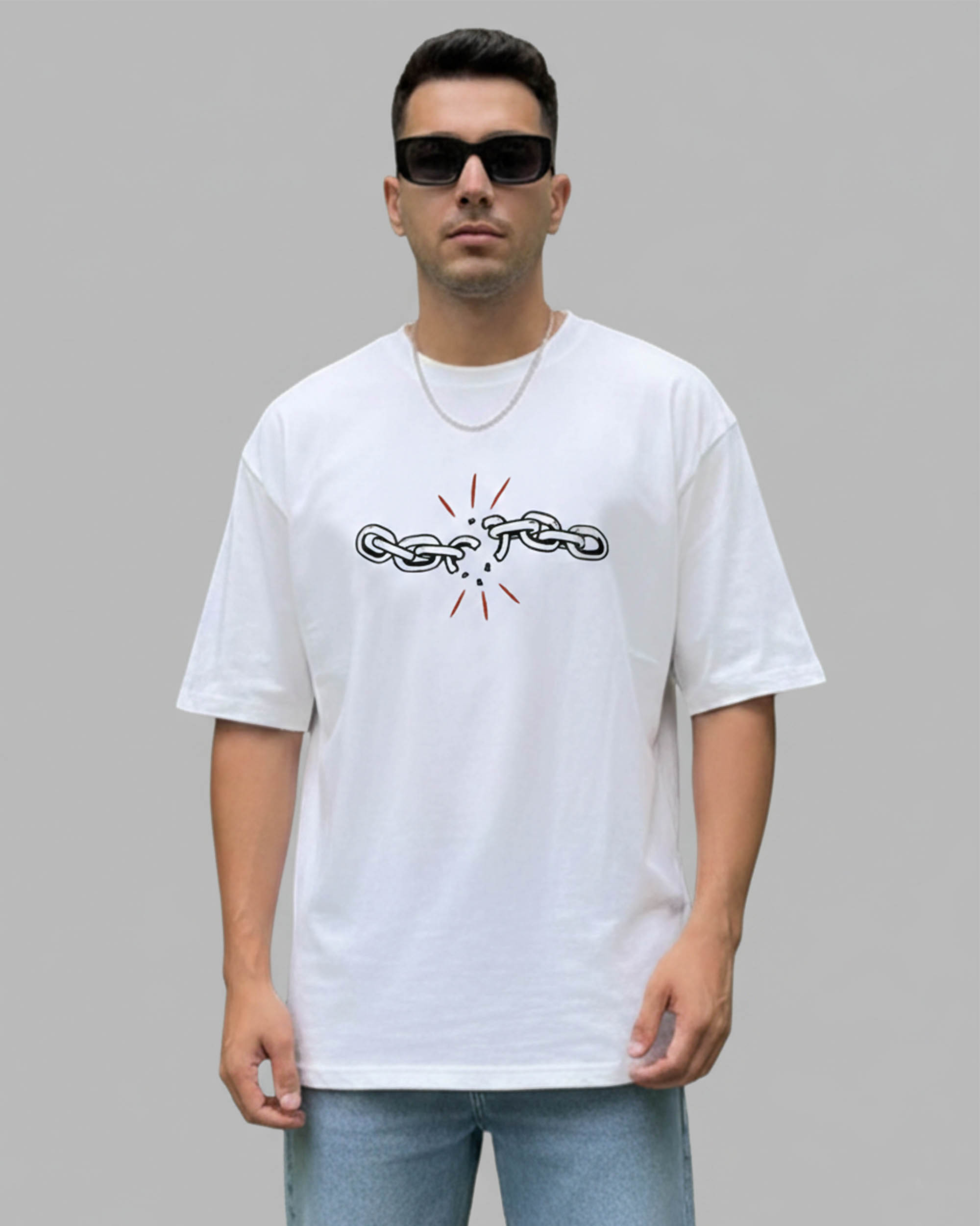 Upgrade your style with this trendy white oversized T-shirt featuring a striking broken chain graphic that symbolizes strength and freedom. Designed for men who appreciate both comfort and statement fashion, this tee is made from a premium cotton blend that feels soft against the skin while allowing excellent airflow.