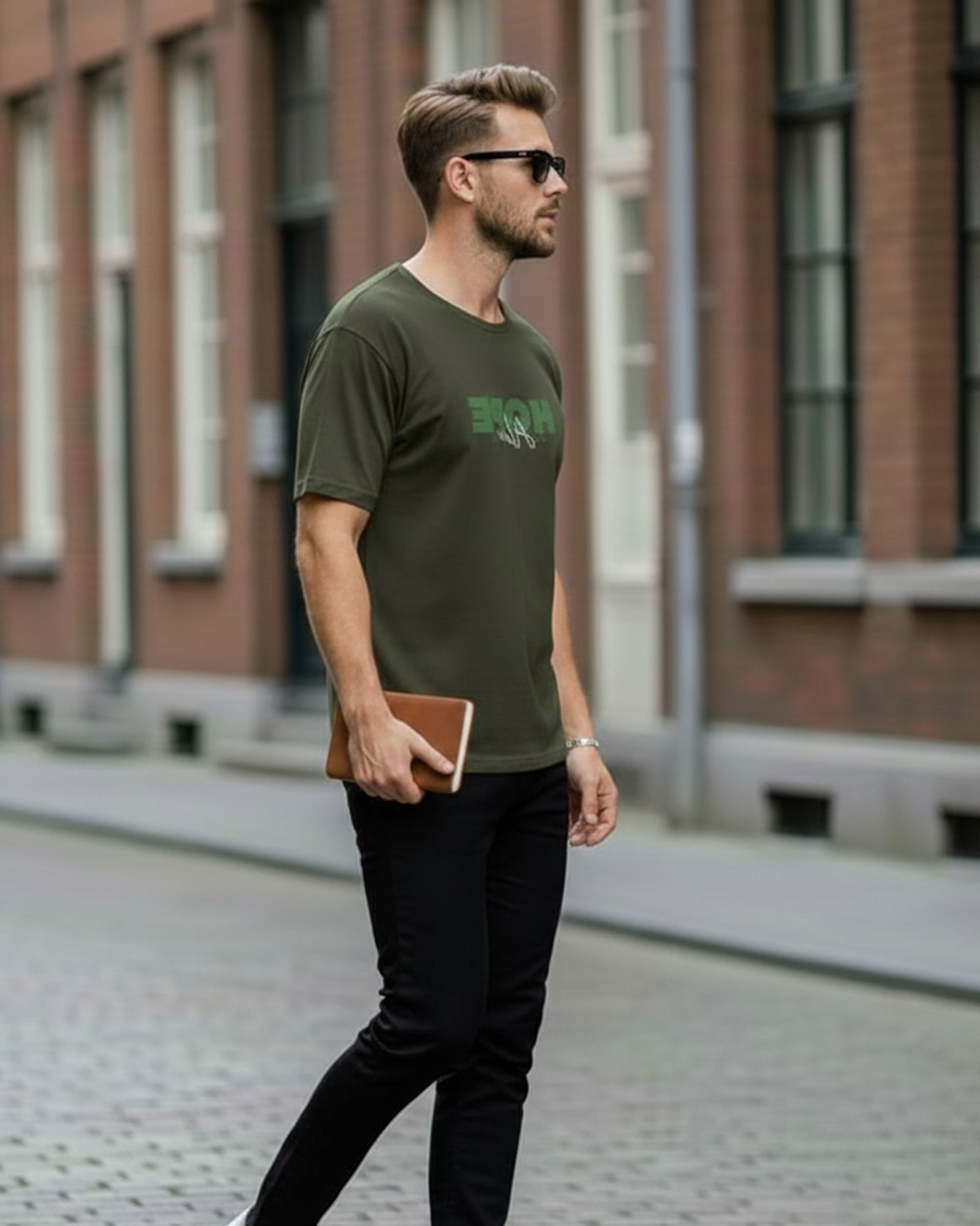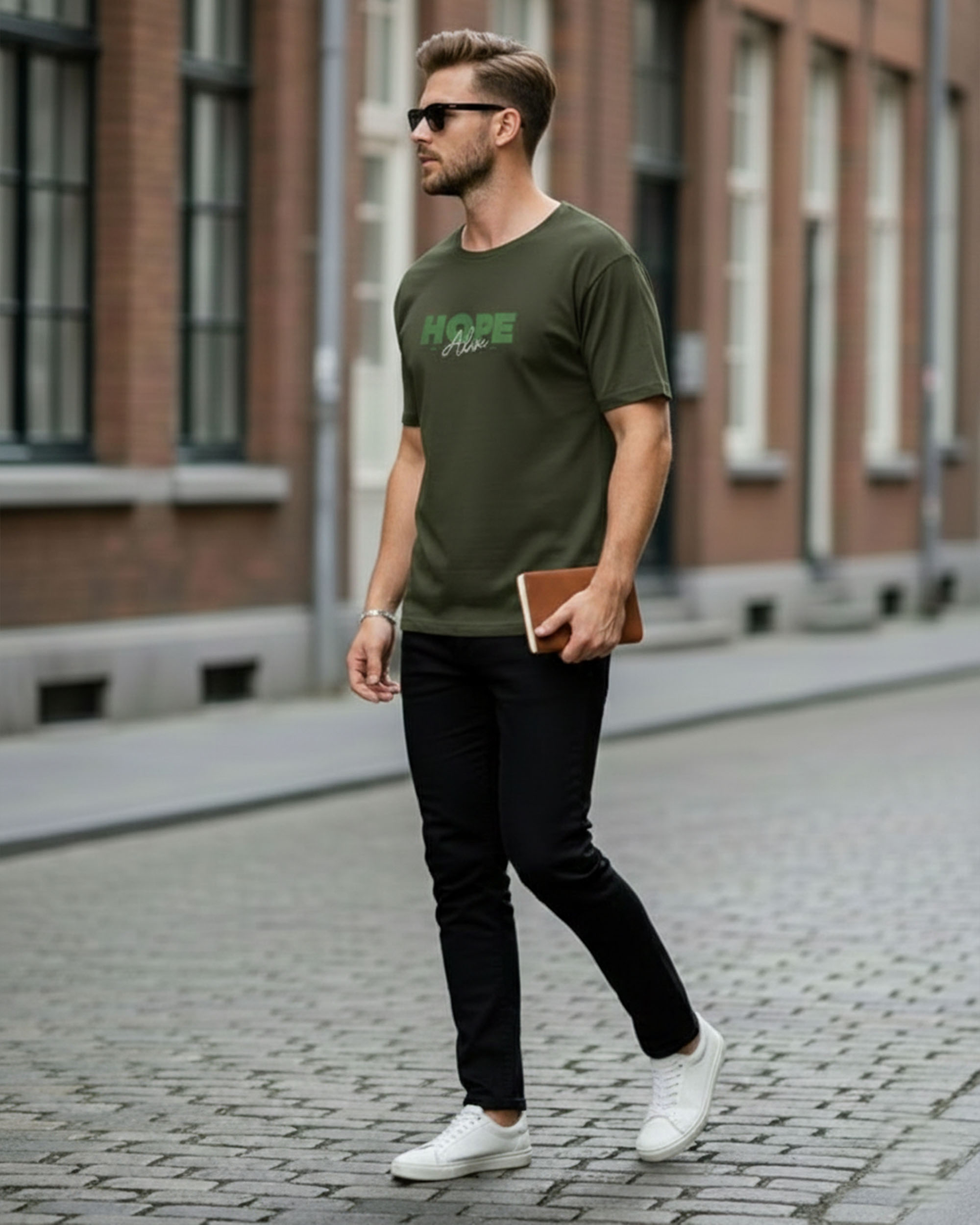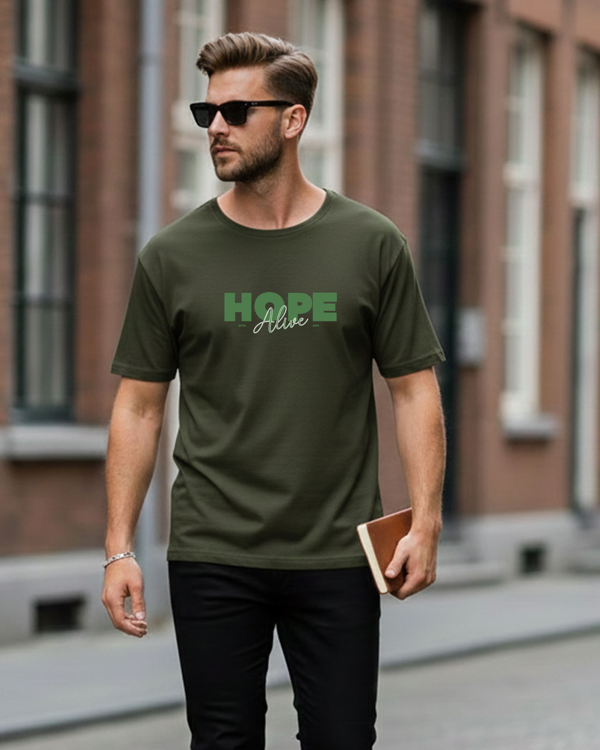 Stay stylish and comfortable with this premium “HOPE Alive” Printed T-Shirt, designed to add positivity to your everyday wardrobe. Made from soft, breathable cotton fabric, this olive green tee offers unmatched comfort and durability. The minimal yet impactful typography print, “HOPE Alive,” gives the T-shirt a modern, motivational vibe—perfect for casual outings, college wear, streetwear, travel, and daily use. Its regular fit, round neck, and half sleeves make it suitable for all-day comfort and all seasons.