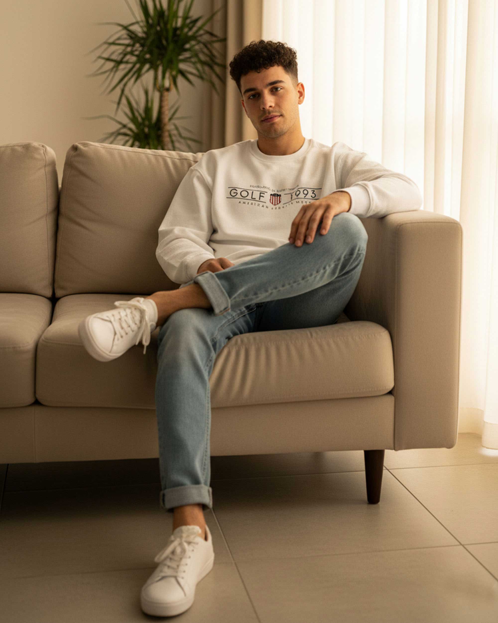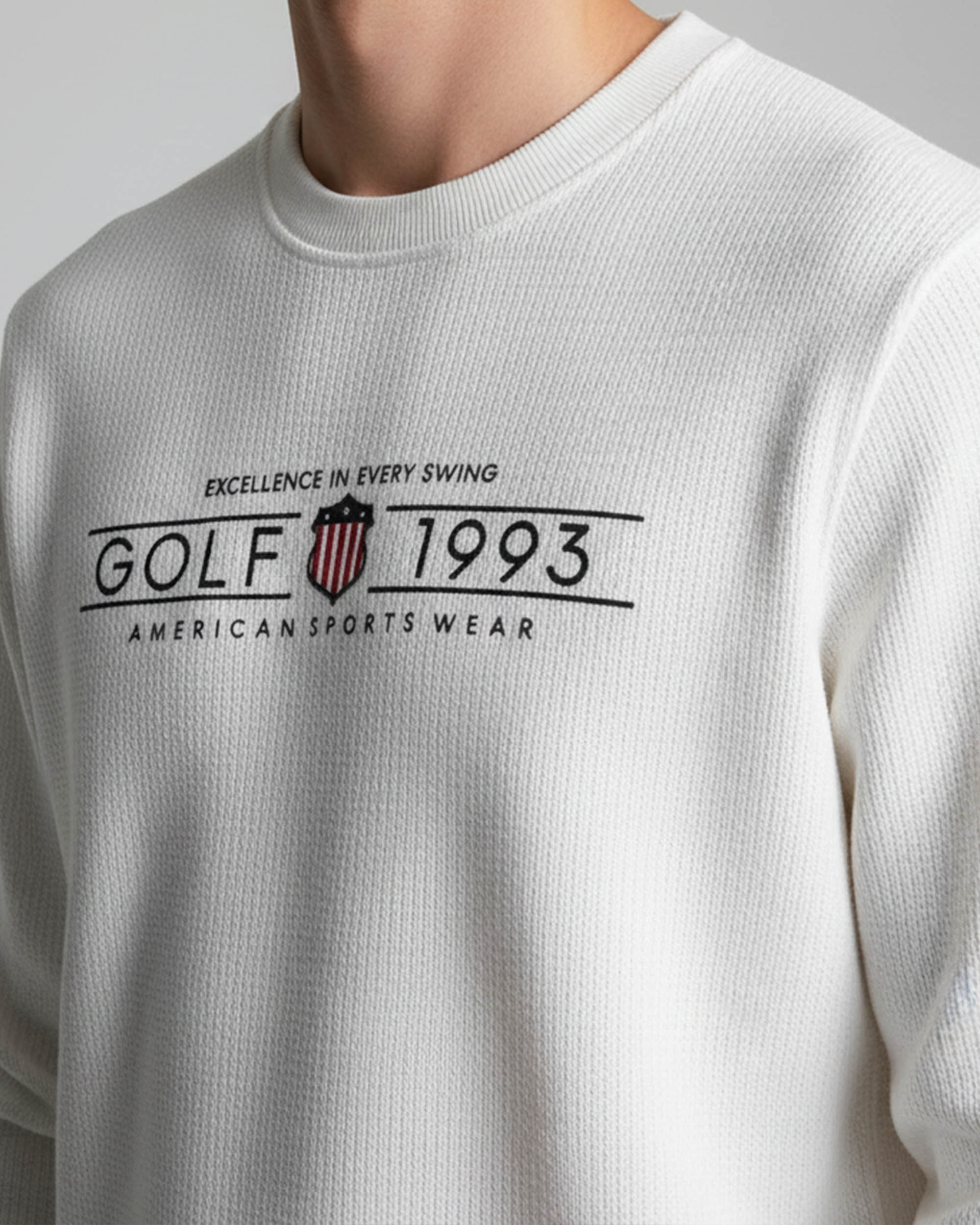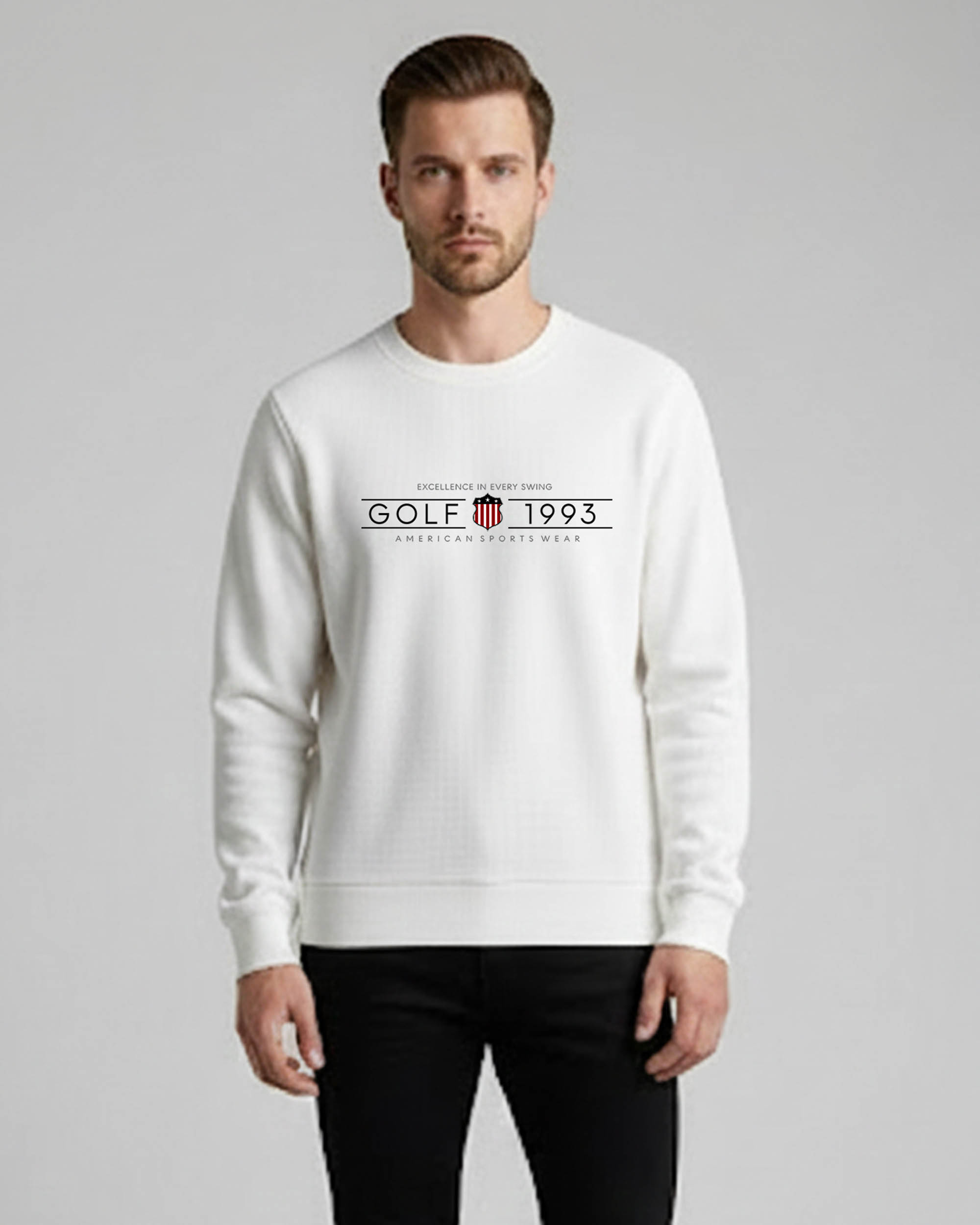 Give your winter wardrobe a stylish update with this premium “GOLF 1993” printed sweatshirt for men. Crafted from super-soft fleece fabric, this sweatshirt offers superior warmth, comfort and durability. The minimalist chest print combined with a clean white color makes this the perfect choice for classy everyday styling. Designed with a round neckline, ribbed cuffs and hem, and a regular fit silhouette