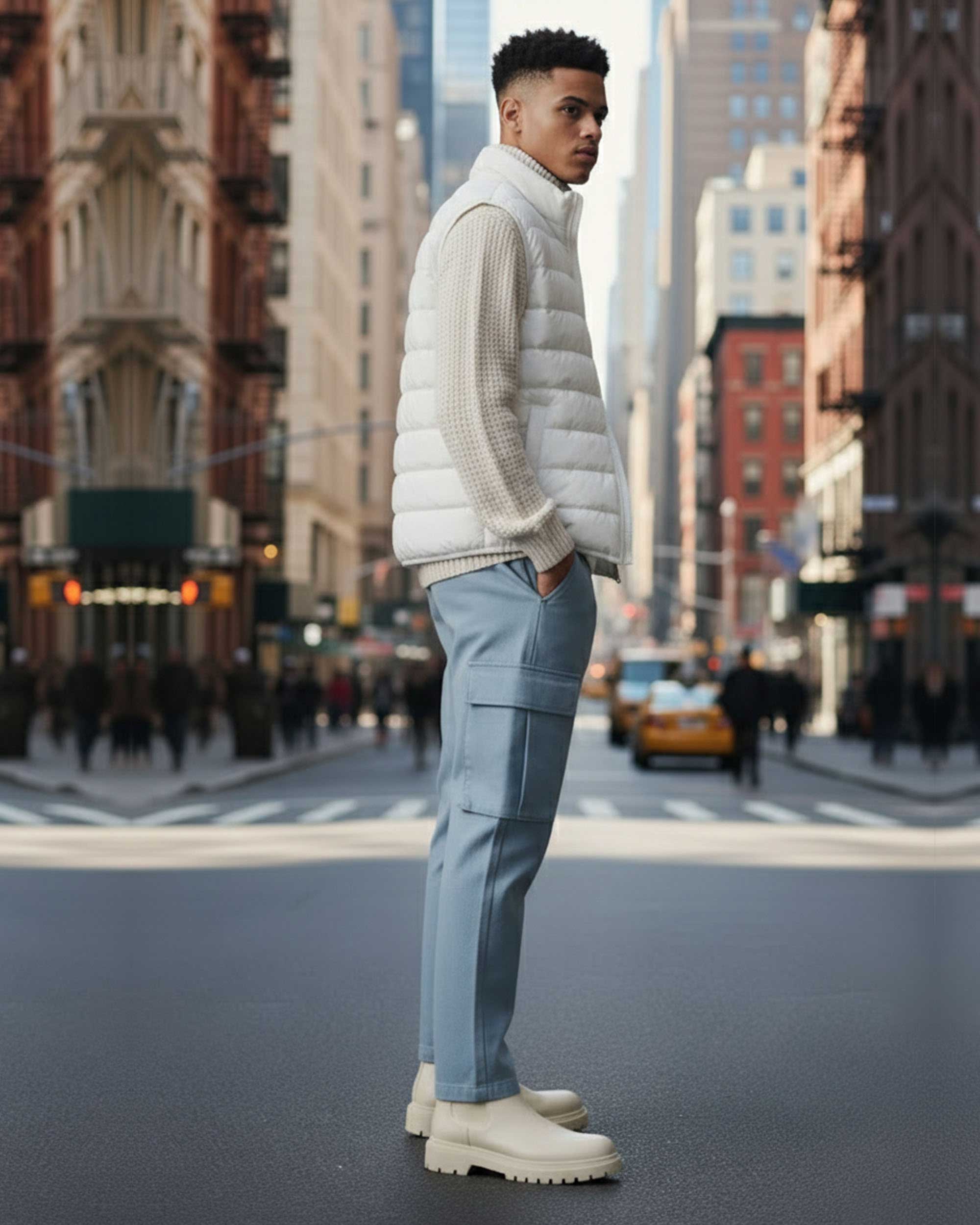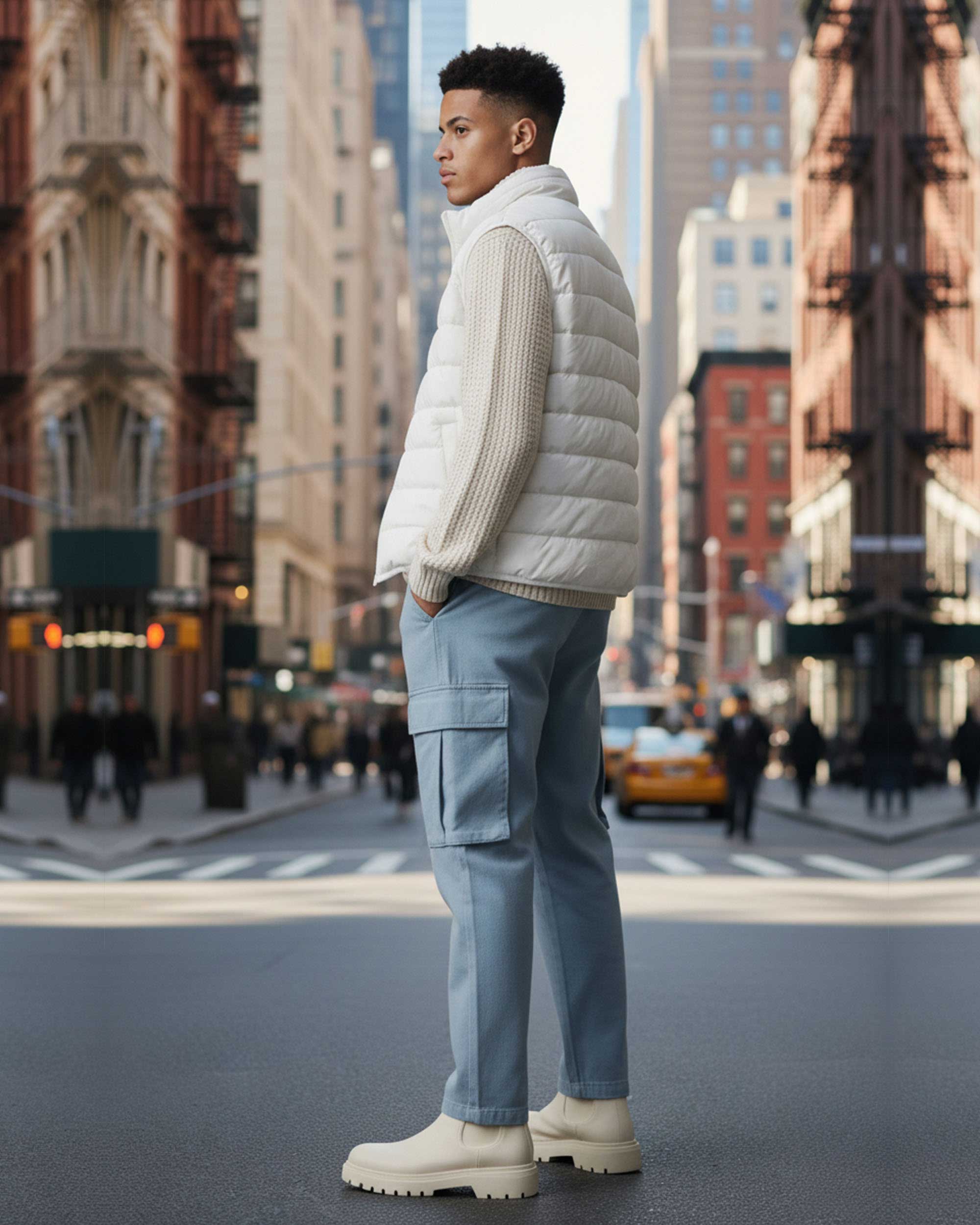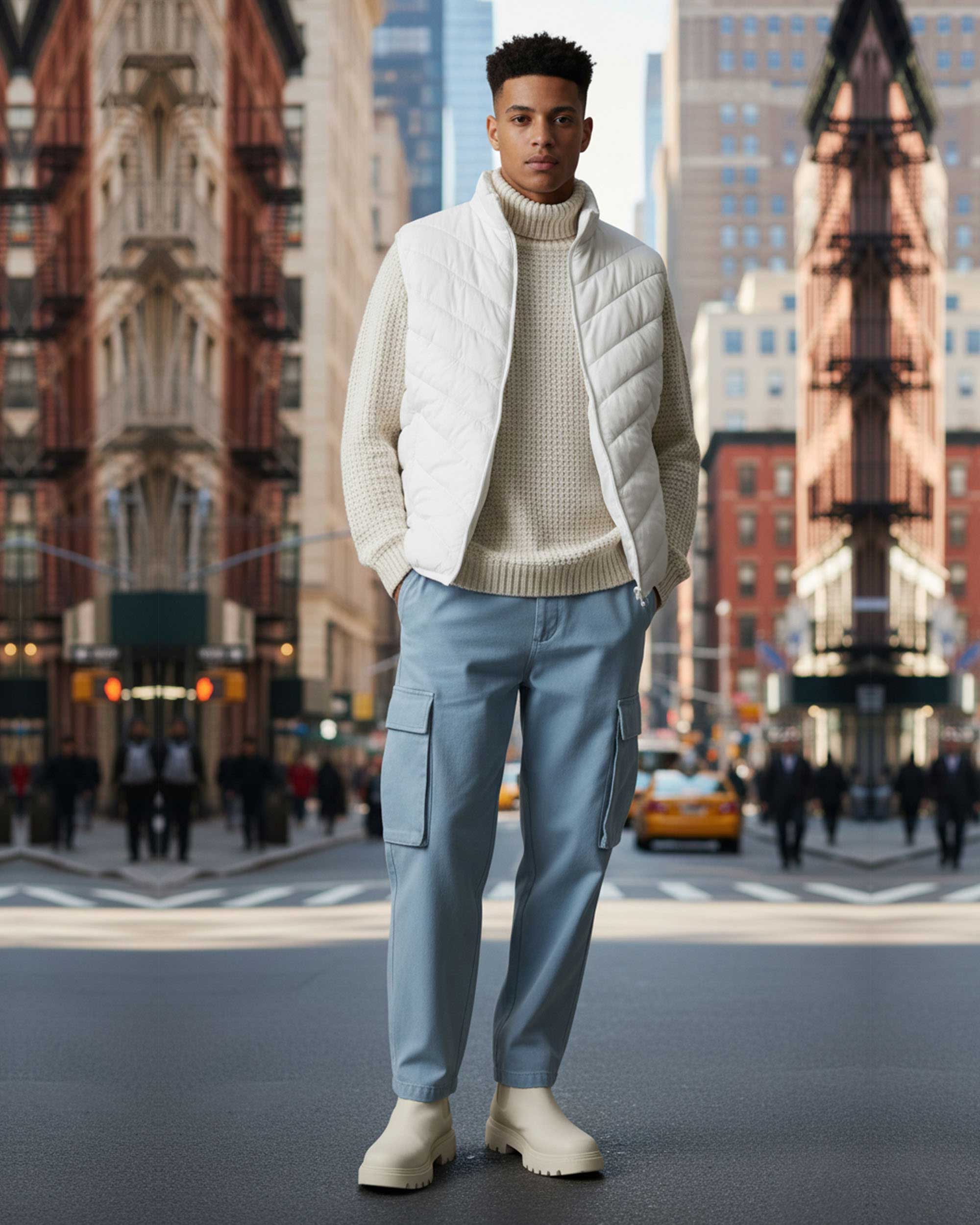 Elevate your layering game with our classic WHITE puffer vest. This essential piece features a contemporary chevron quilted design for a sleek, slimming look and optimal insulation. The stand collar provides extra warmth, while the smooth full-zip closure and lightweight filling make it the perfect versatile layer over a sweater, hoodie, or long-sleeve tee