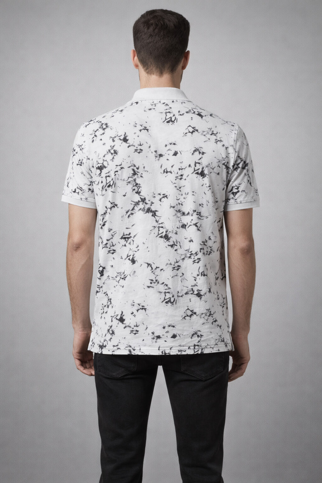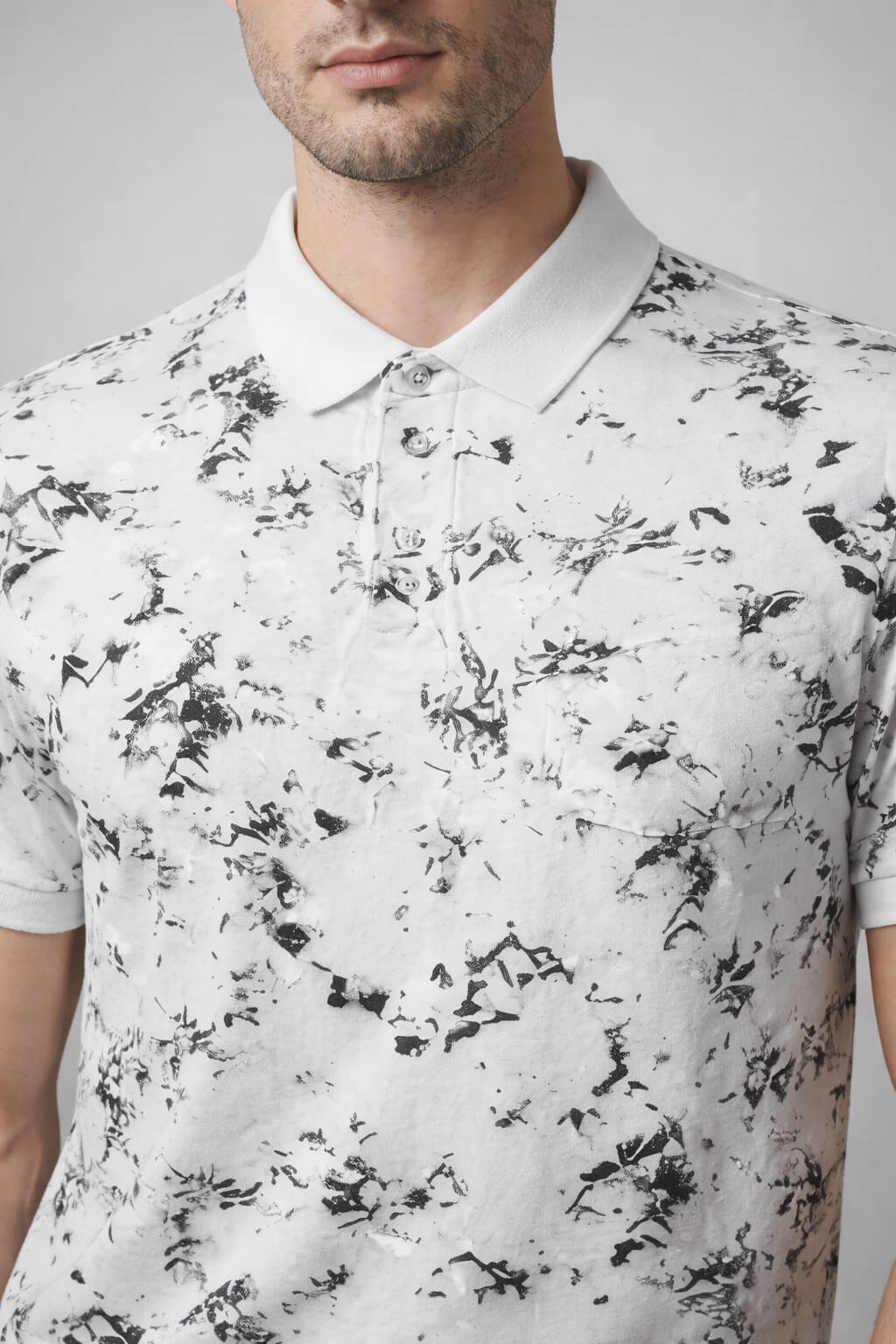 Make a statement with this white abstract printed polo T-shirt from Davno. Crafted from soft breathable cotton blend fabric, it features a striking marble-inspired pattern that adds a contemporary edge while maintaining a clean, premium feel. The structured polo collar and regular fit ensure comfort and versatility, making it ideal for both relaxed outings and elevated casual styling.