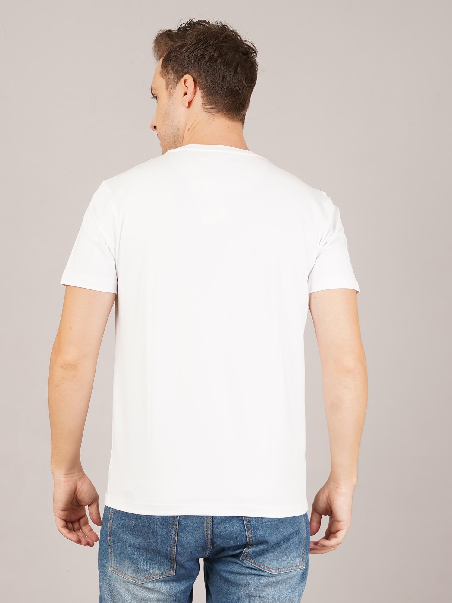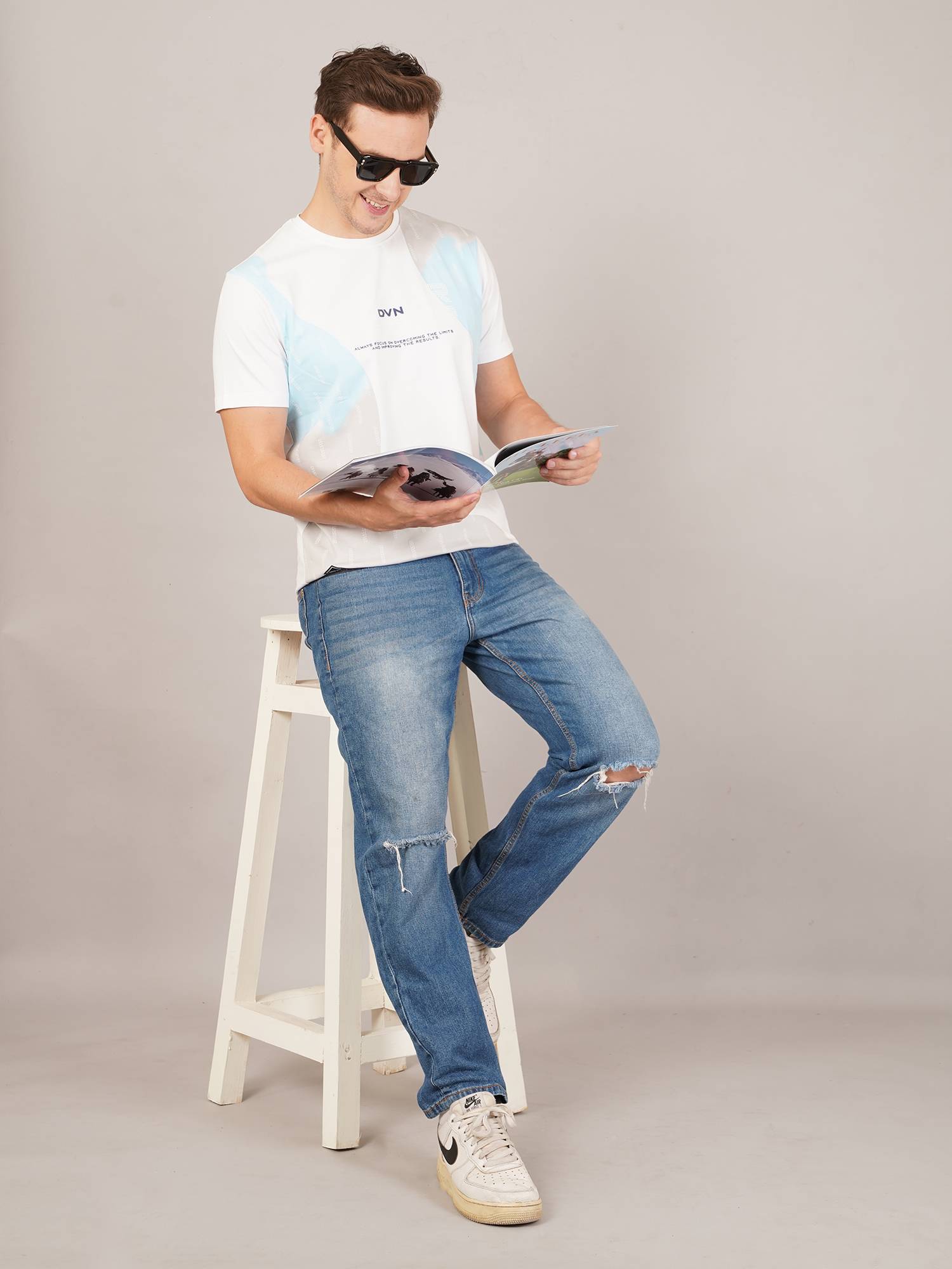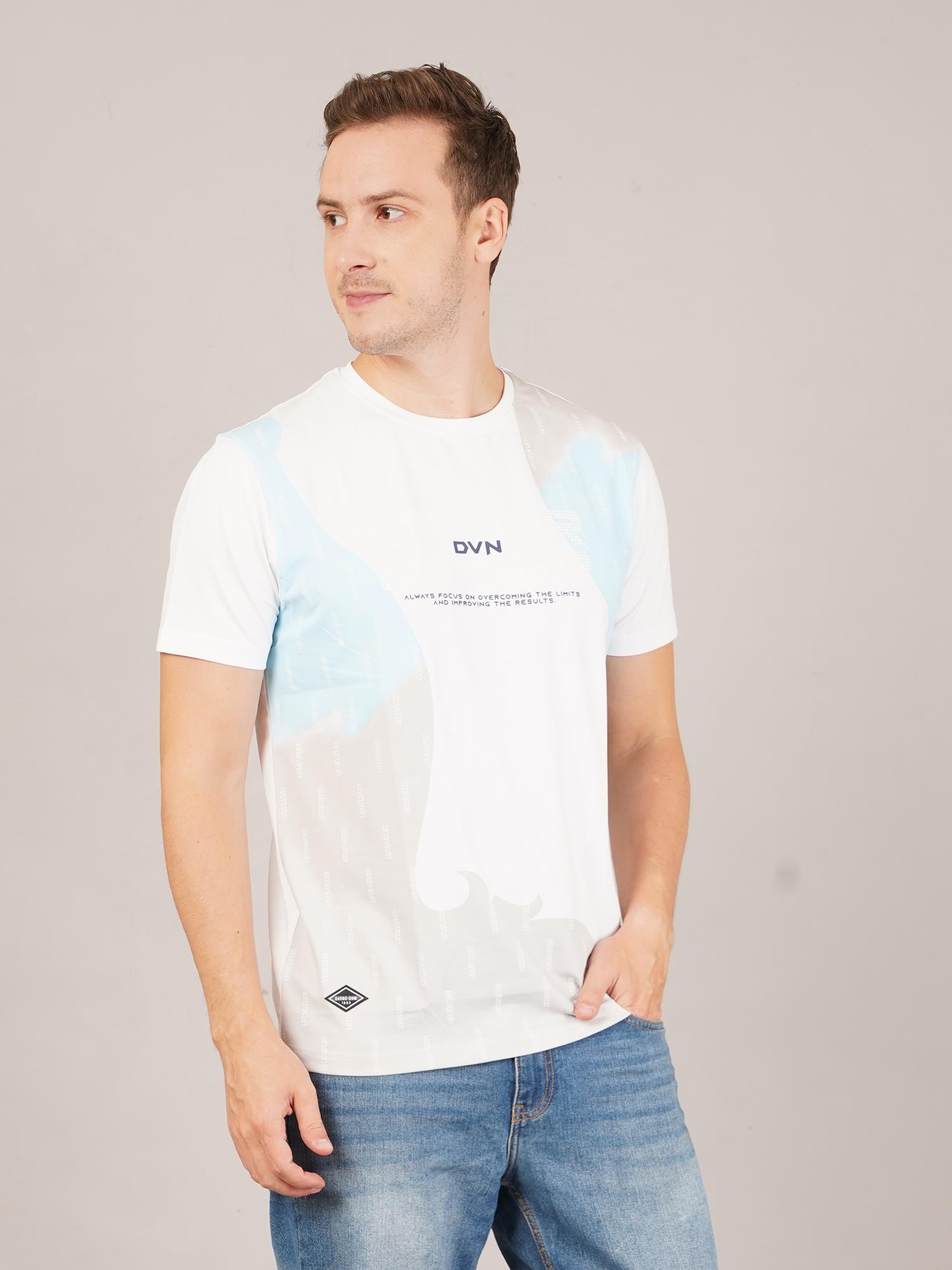 tay effortlessly stylish with this white printed t-shirt for men, crafted with a round neck and half sleeves for a relaxed everyday look. The subtle blue & Grey abstract print with text design gives it a modern edge, making it perfect for pairing with jeans, joggers, or shorts. Made from a soft cotton-blend fabric, this tee is lightweight, breathable, and ideal for casual wear, travel, and weekend outings.