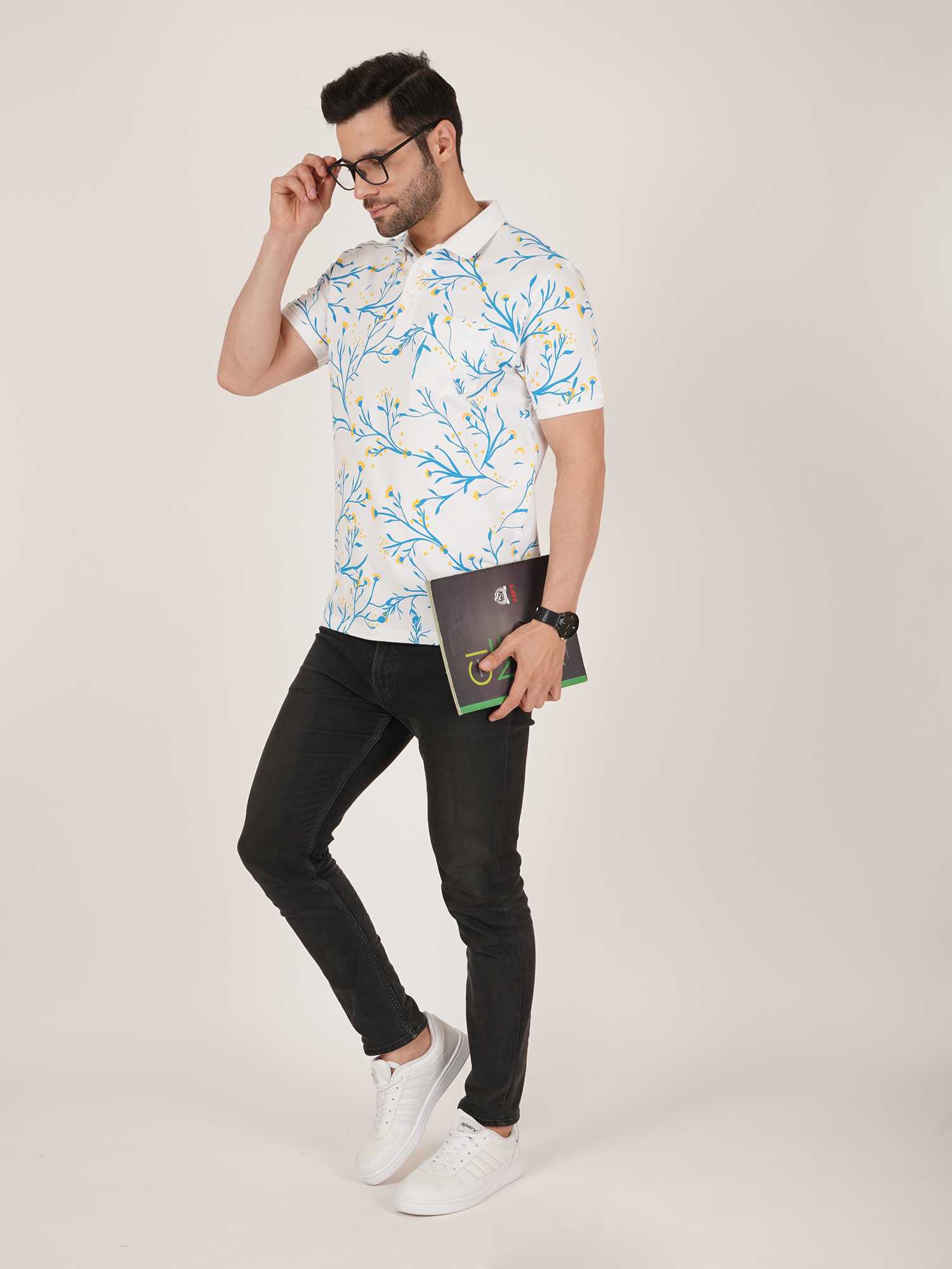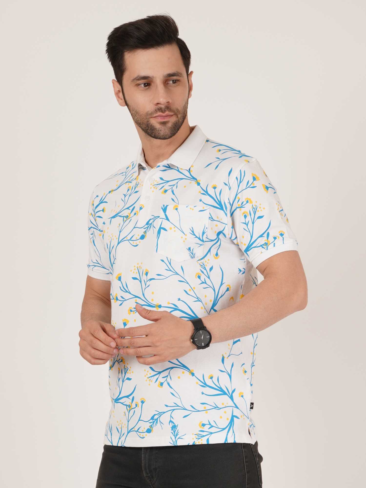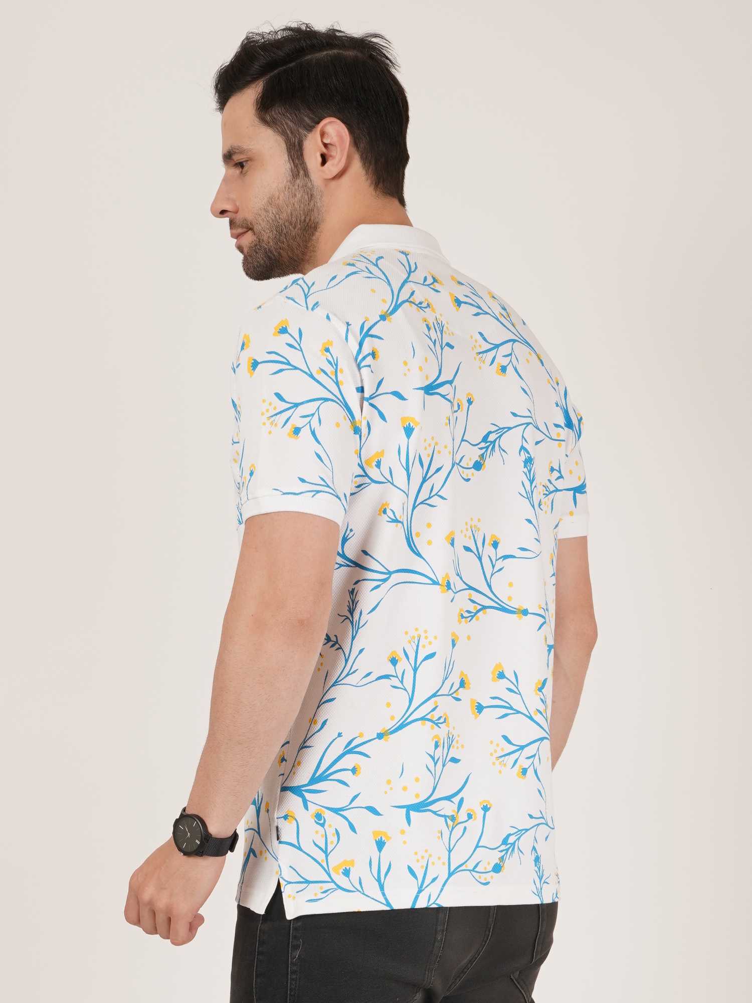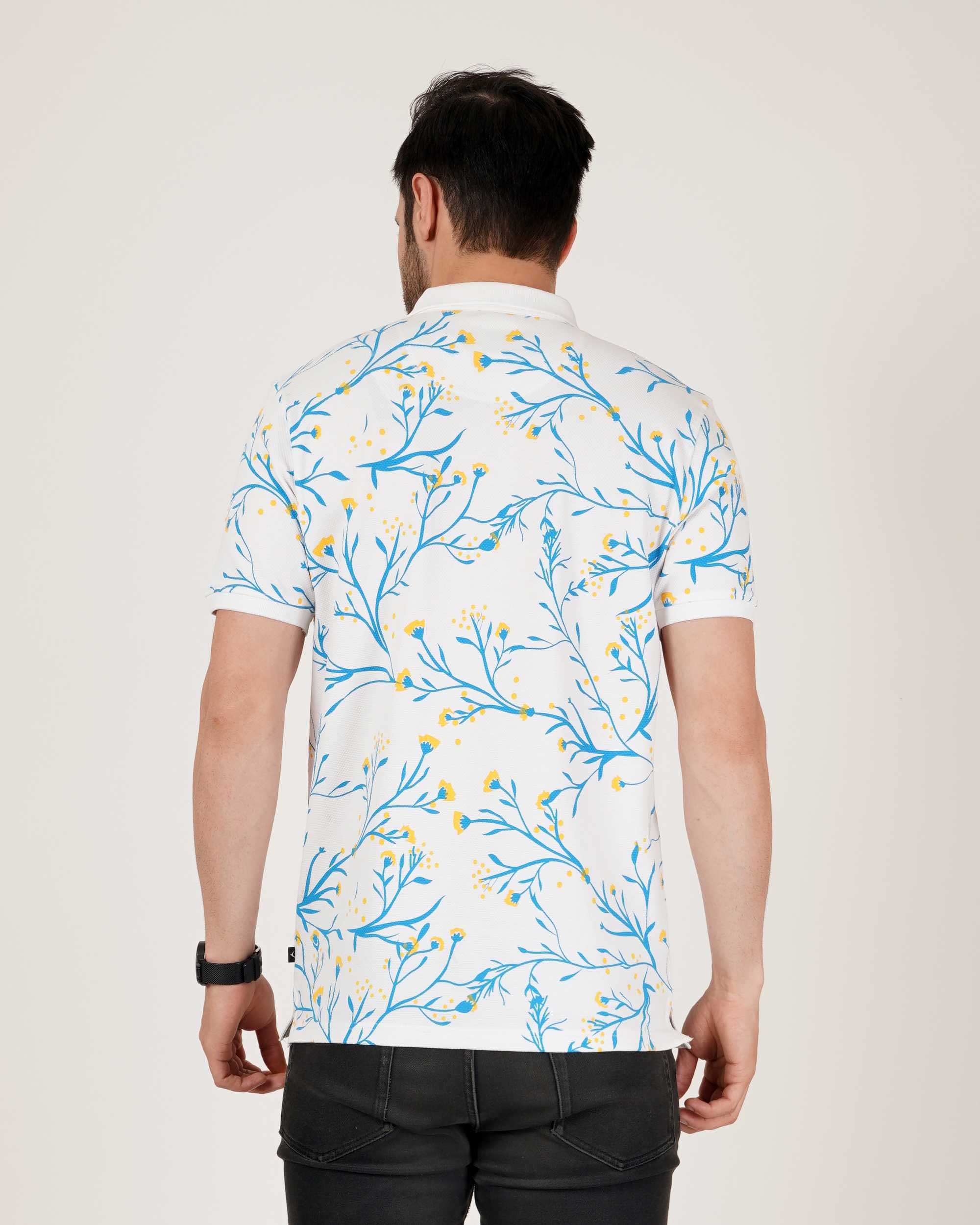 Bring a burst of freshness to your wardrobe with this vibrant white polo T-shirt, adorned with an all-over blue and yellow floral print. Tailored for comfort and style, this polo features a classic collar with a button placket and short sleeves—perfect for casual outings or relaxed weekends. Made from breathable cotton-rich fabric, it ensures you stay cool and confident all day.