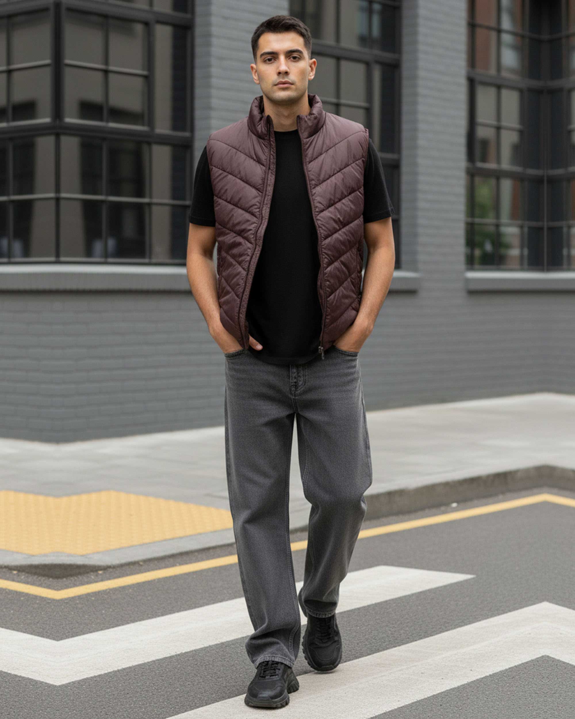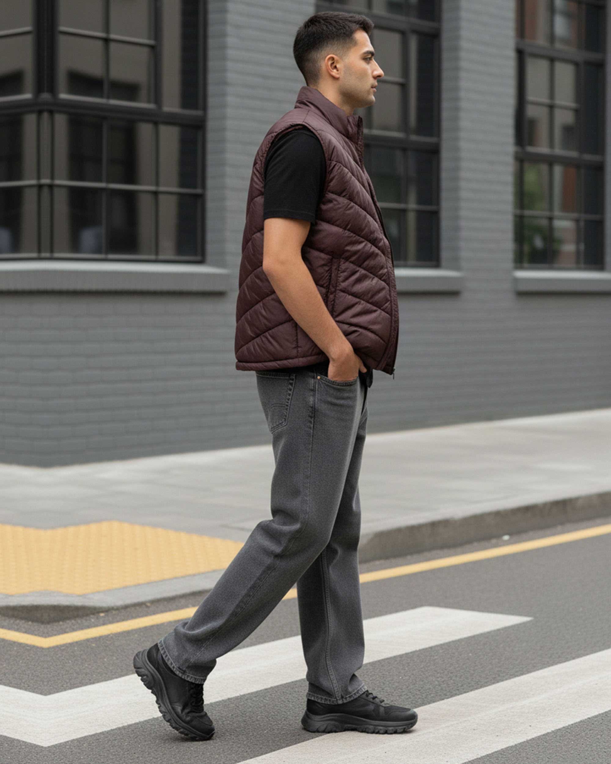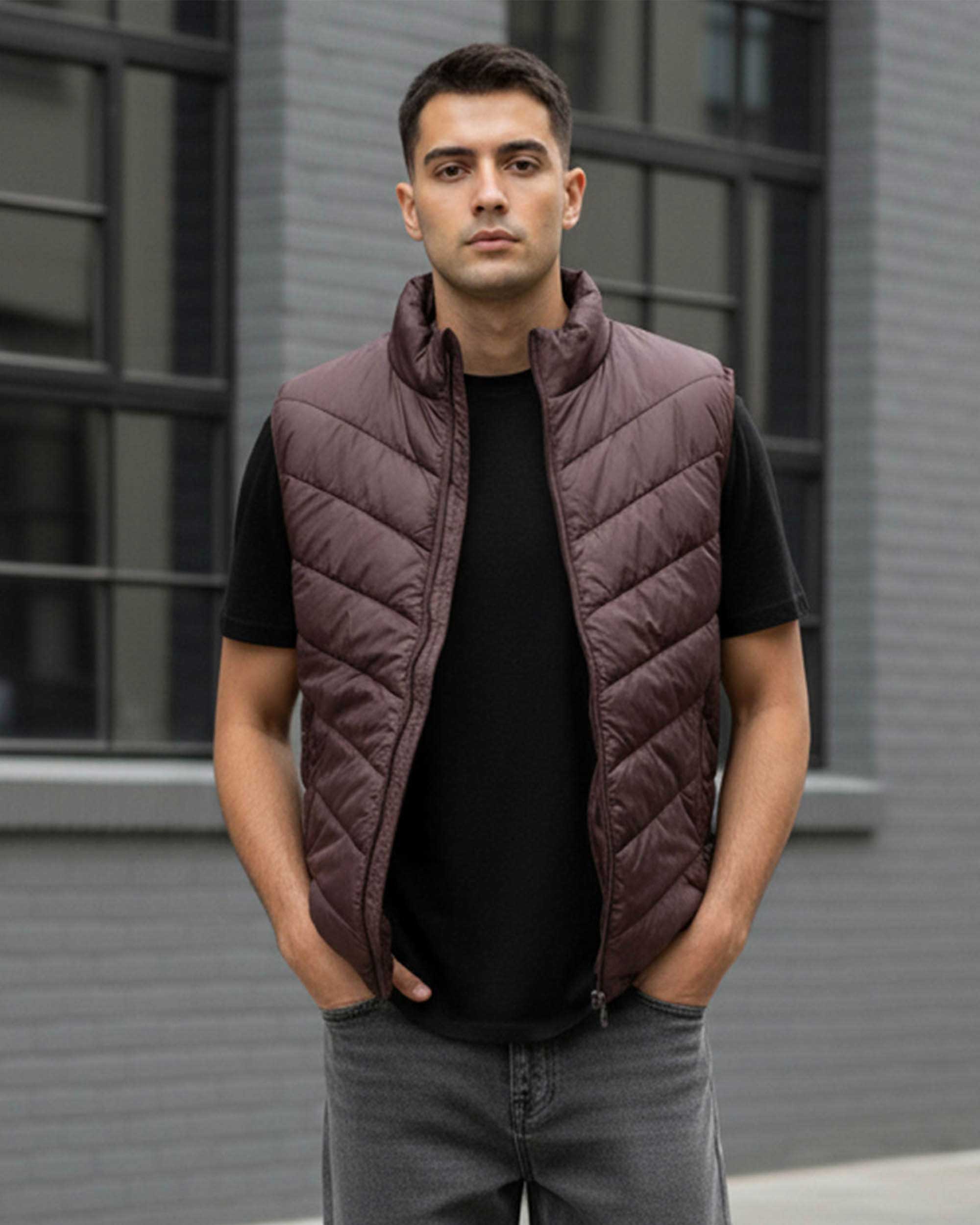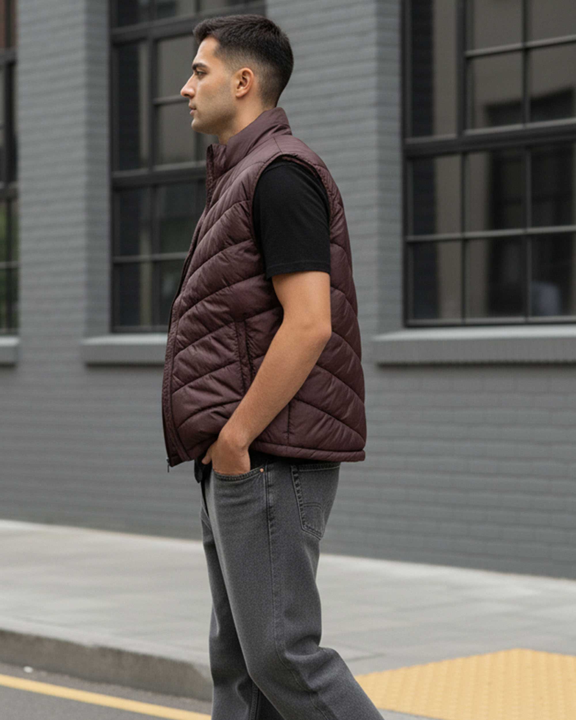 Elevate your layering game with our classic WINE puffer vest. This essential piece features a contemporary chevron quilted design for a sleek, slimming look and optimal insulation. The stand collar provides extra warmth, while the smooth full-zip closure and lightweight filling make it the perfect versatile layer over a sweater, hoodie, or long-sleeve tee
